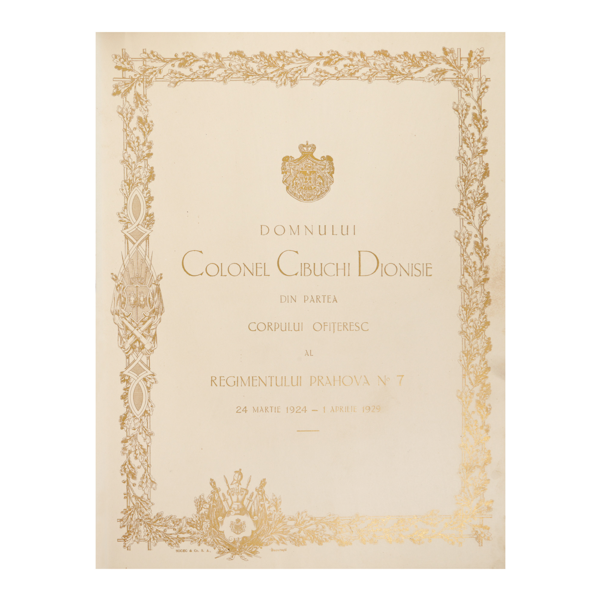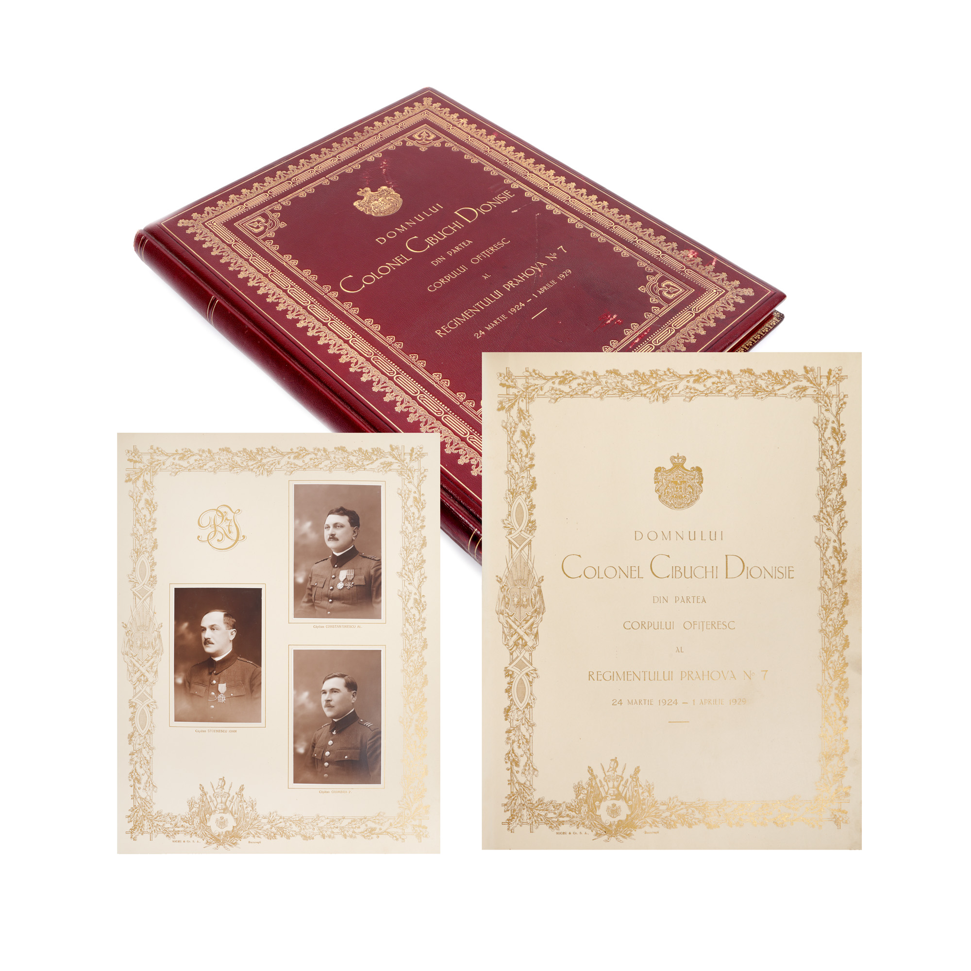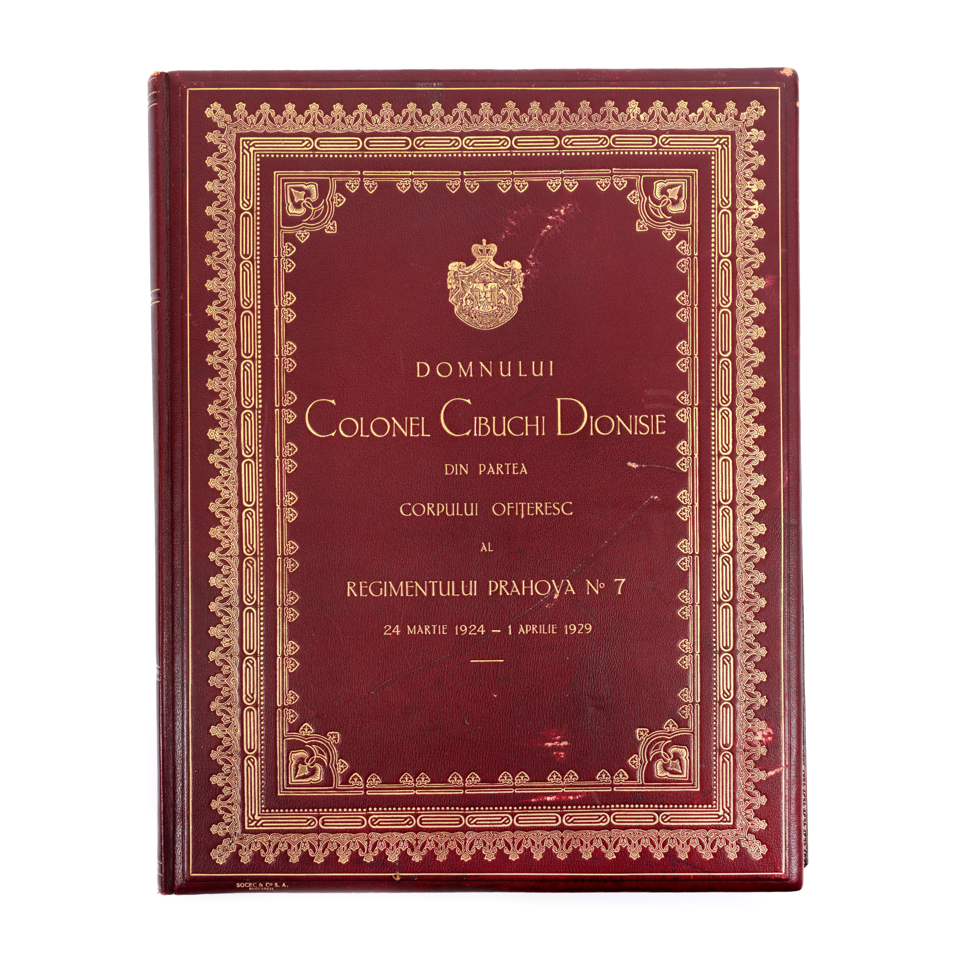 69. Album dedicat "Domnului Colonel Cibuchi Dionisie din partea Corpului Ofițeresc al Regimentului Prahova no. 7", Ploiești, 1929, piesă de colecție