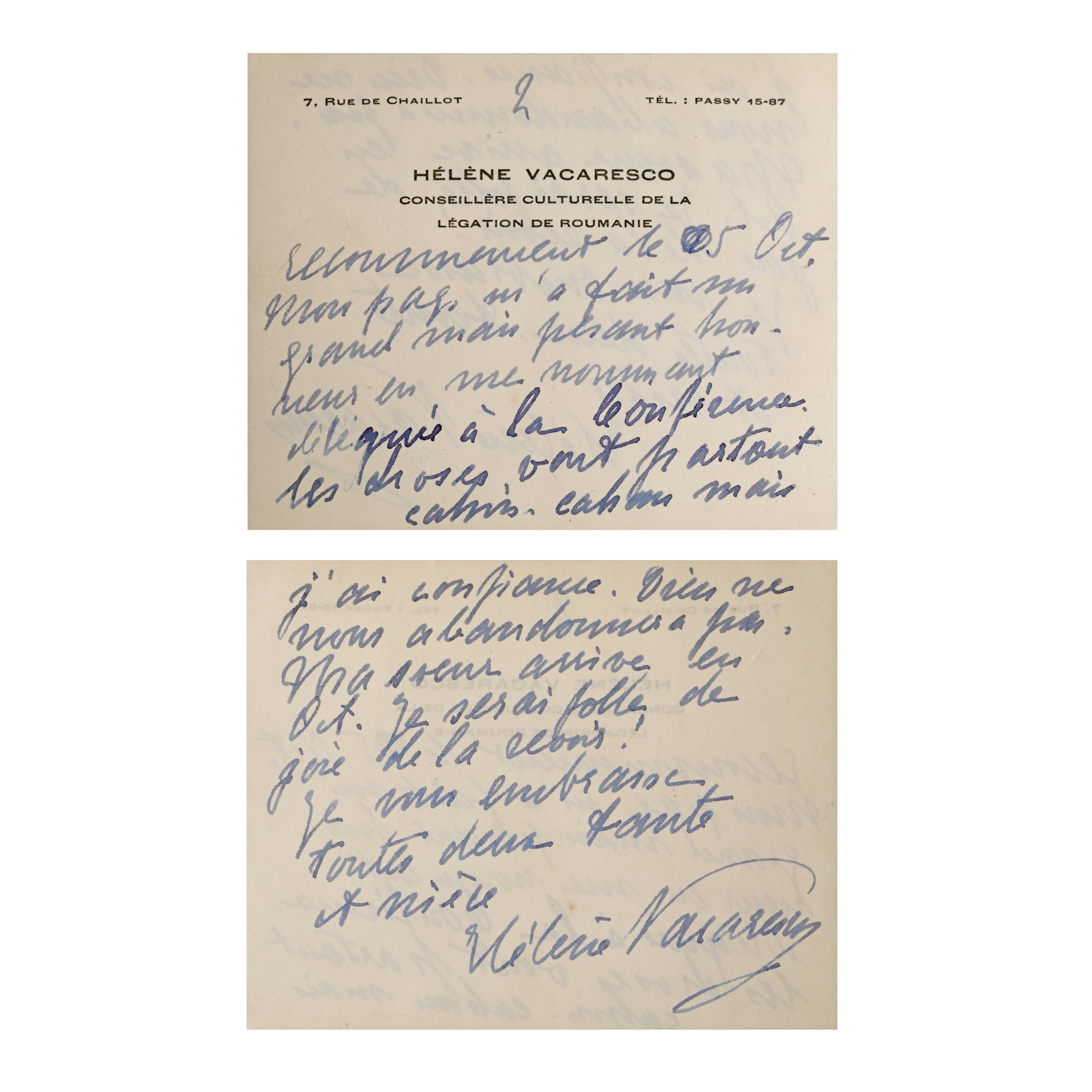 120. Carte de vizită a Elenei Văcărescu, cu un amplu text olograf în limba franceză și semnătura olografă a acesteia, cca. 1930