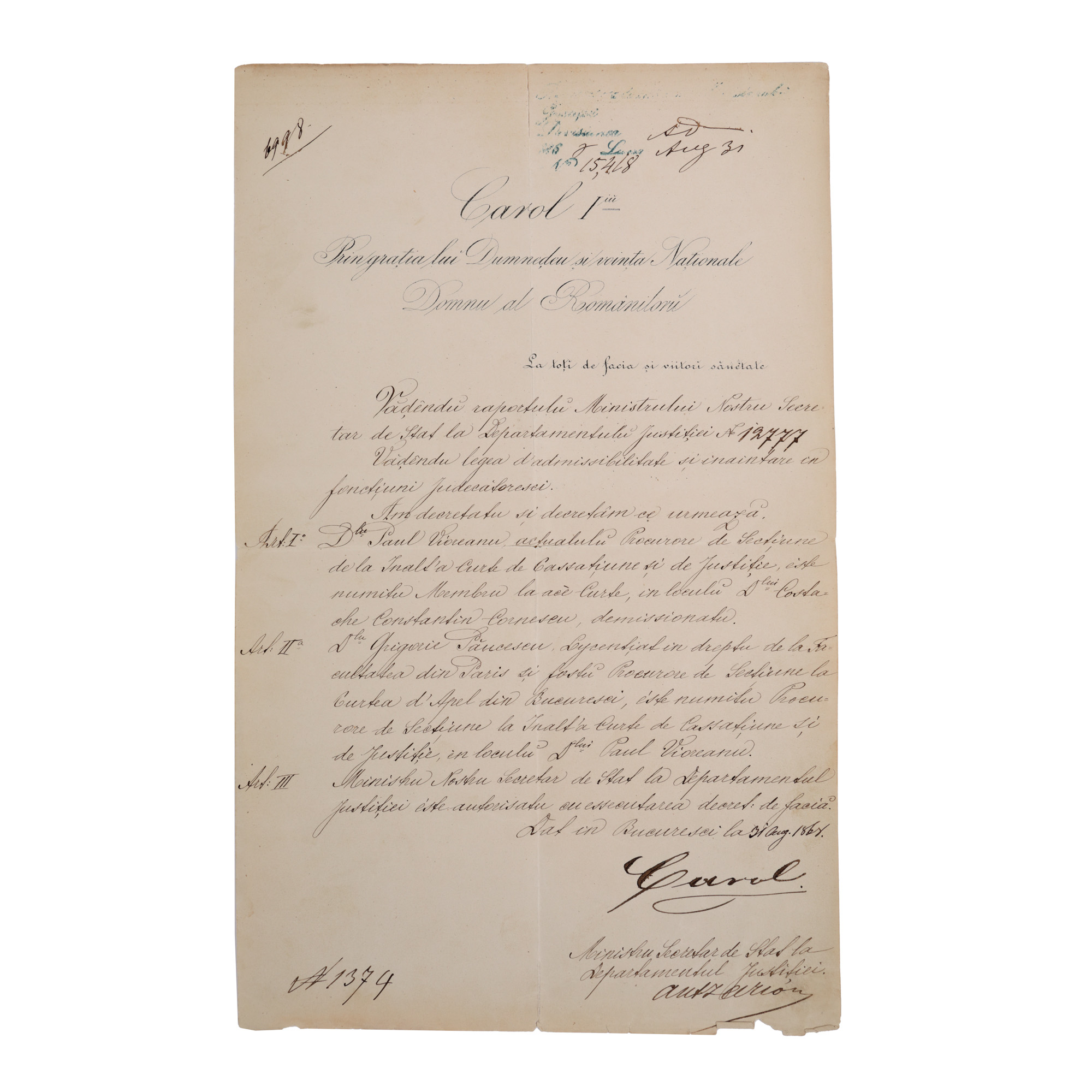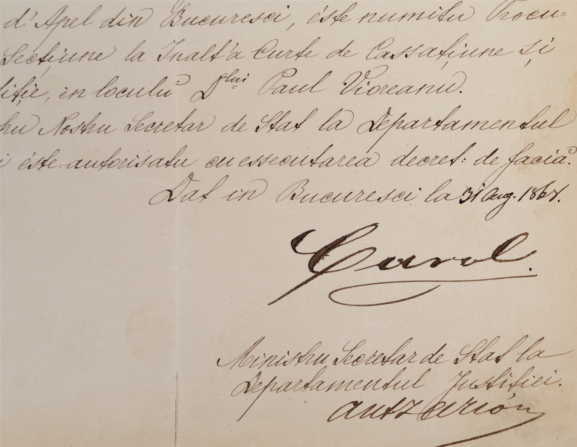 147. Decret de numire a unor procurori, cu semnătura olografă a regelui Carol I, 1868