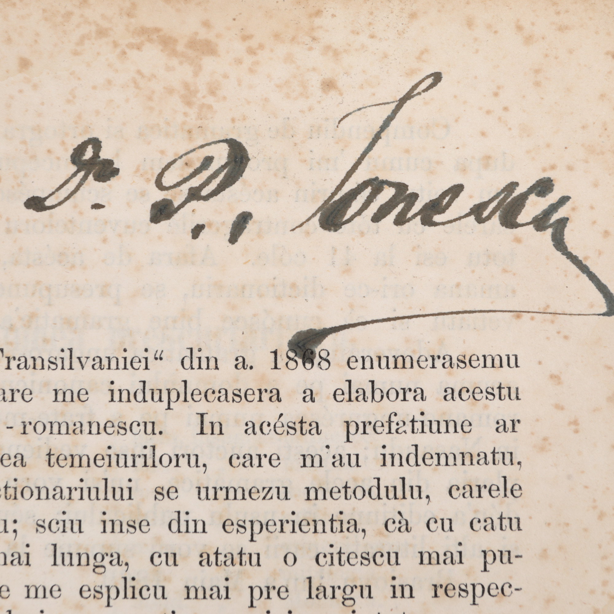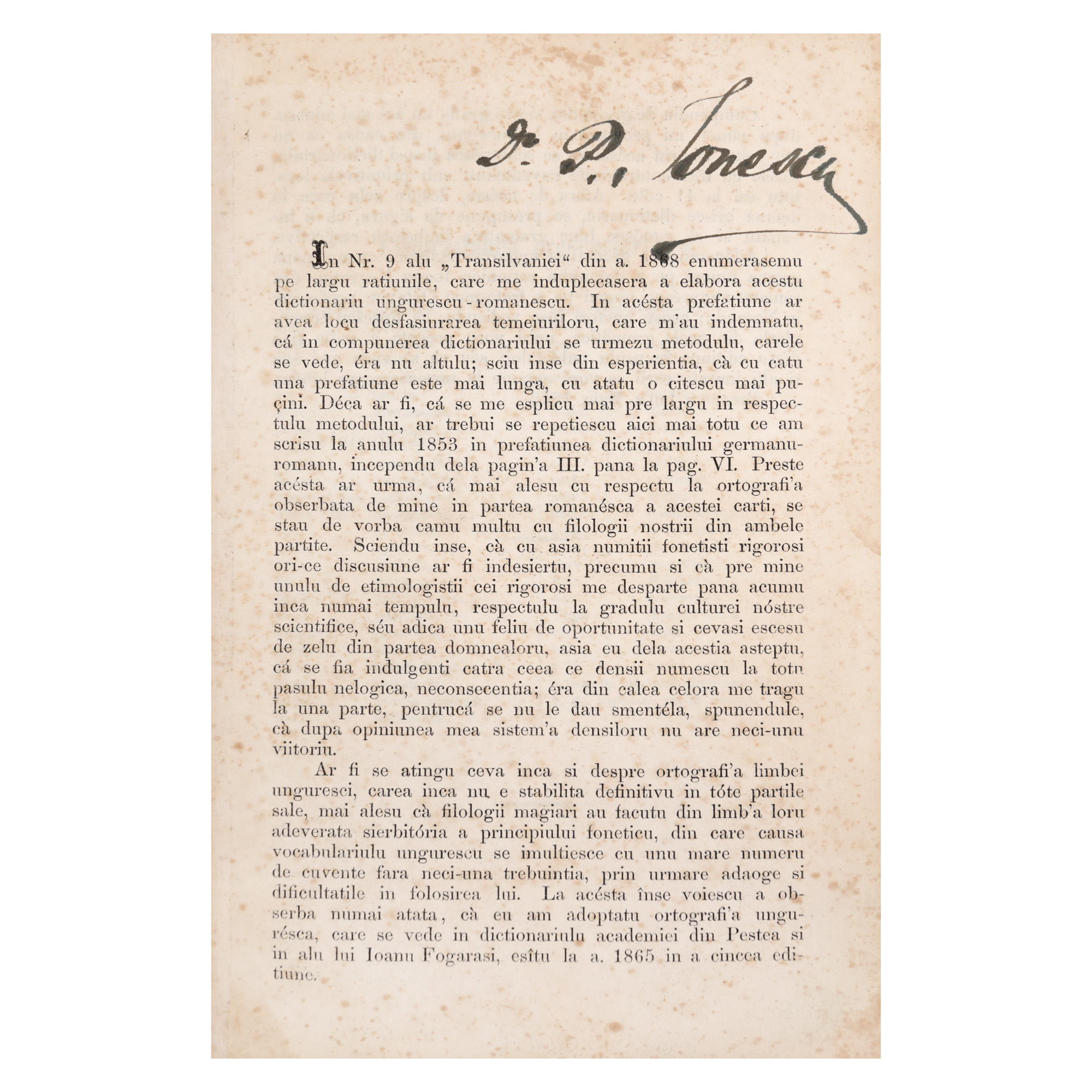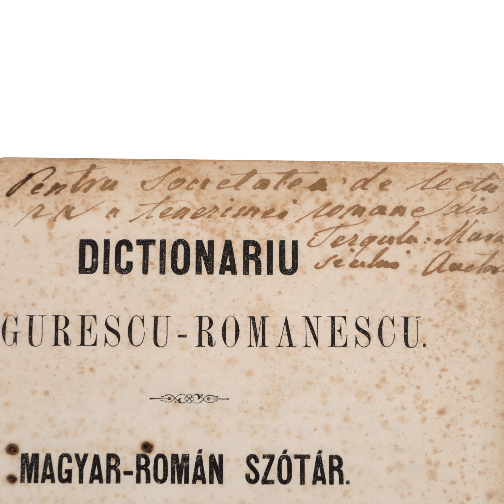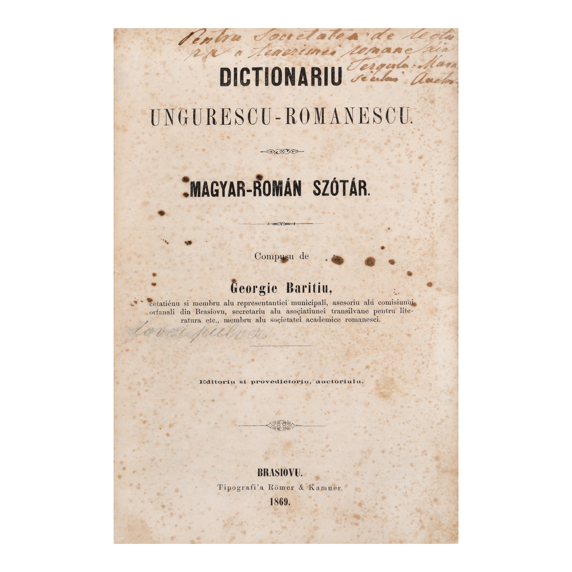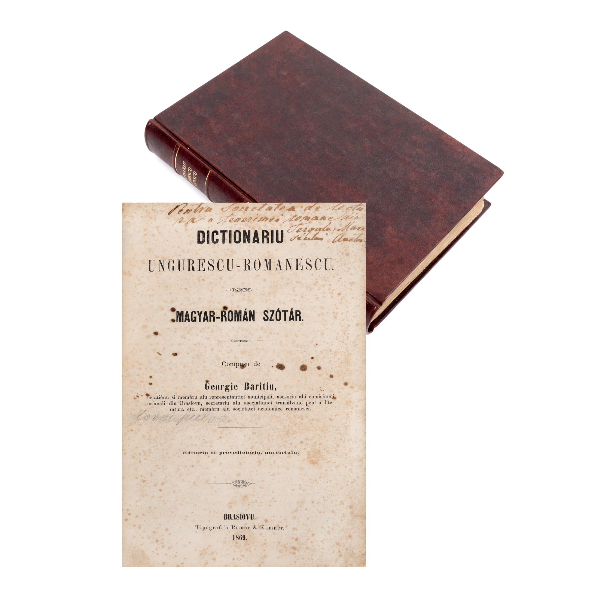 61. "Dicționarul unguresc-român", de George Barițiu, Brașov, 1869, cu o dedicație olografă a autorului