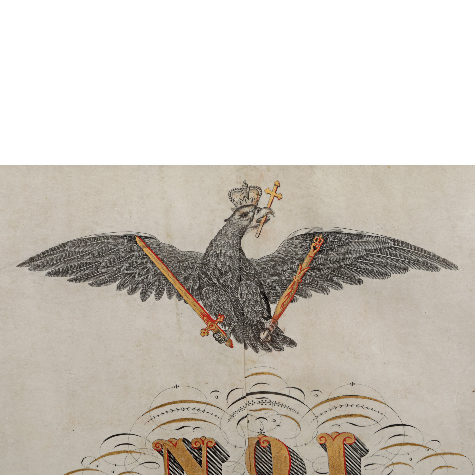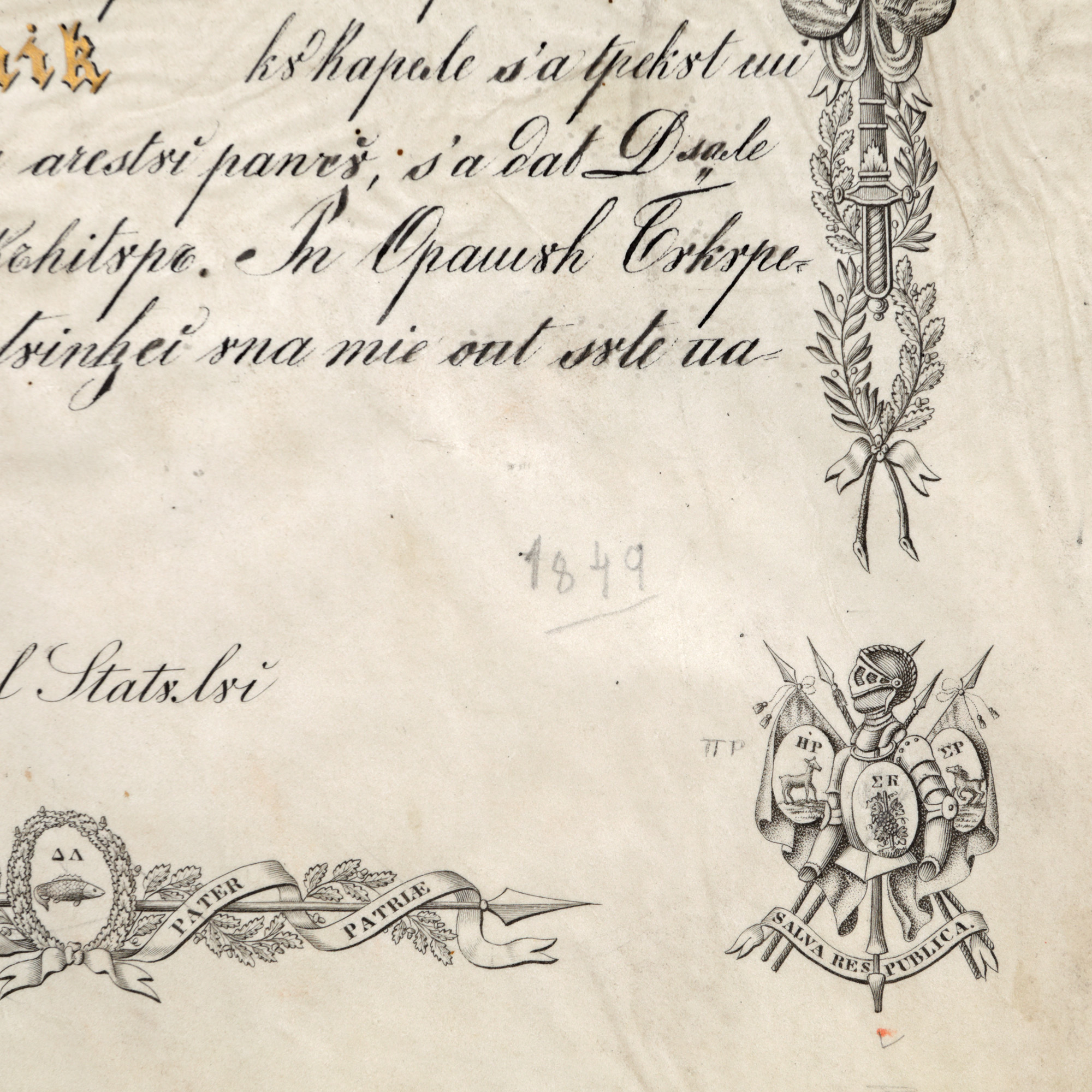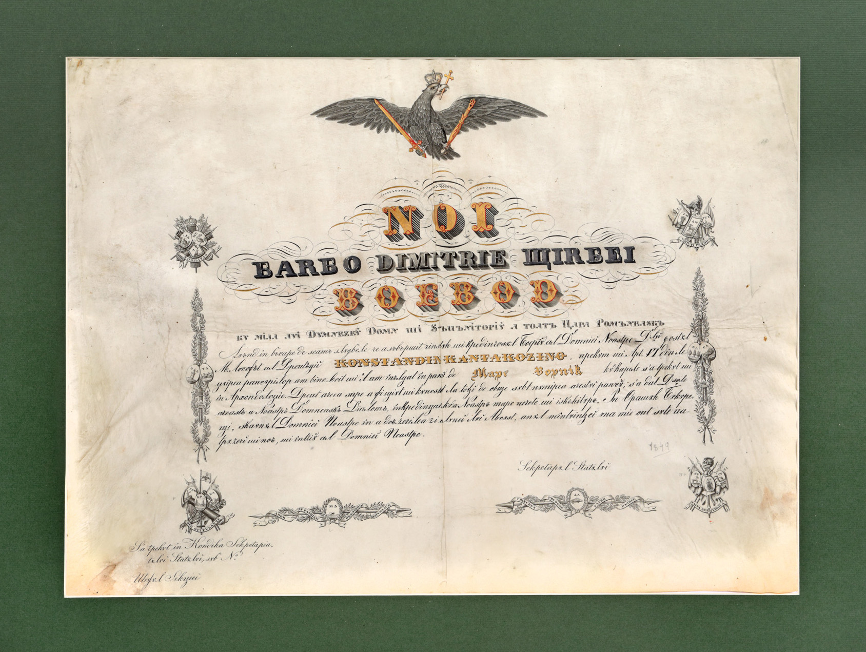 146. Diplomă de înălțare la rangul de mare vornic (echivalentul primului-ministru), în timpul domniei lui Barbu Dimitrie Știrbei, acordată lui Constantin Cantacuzino, 1849