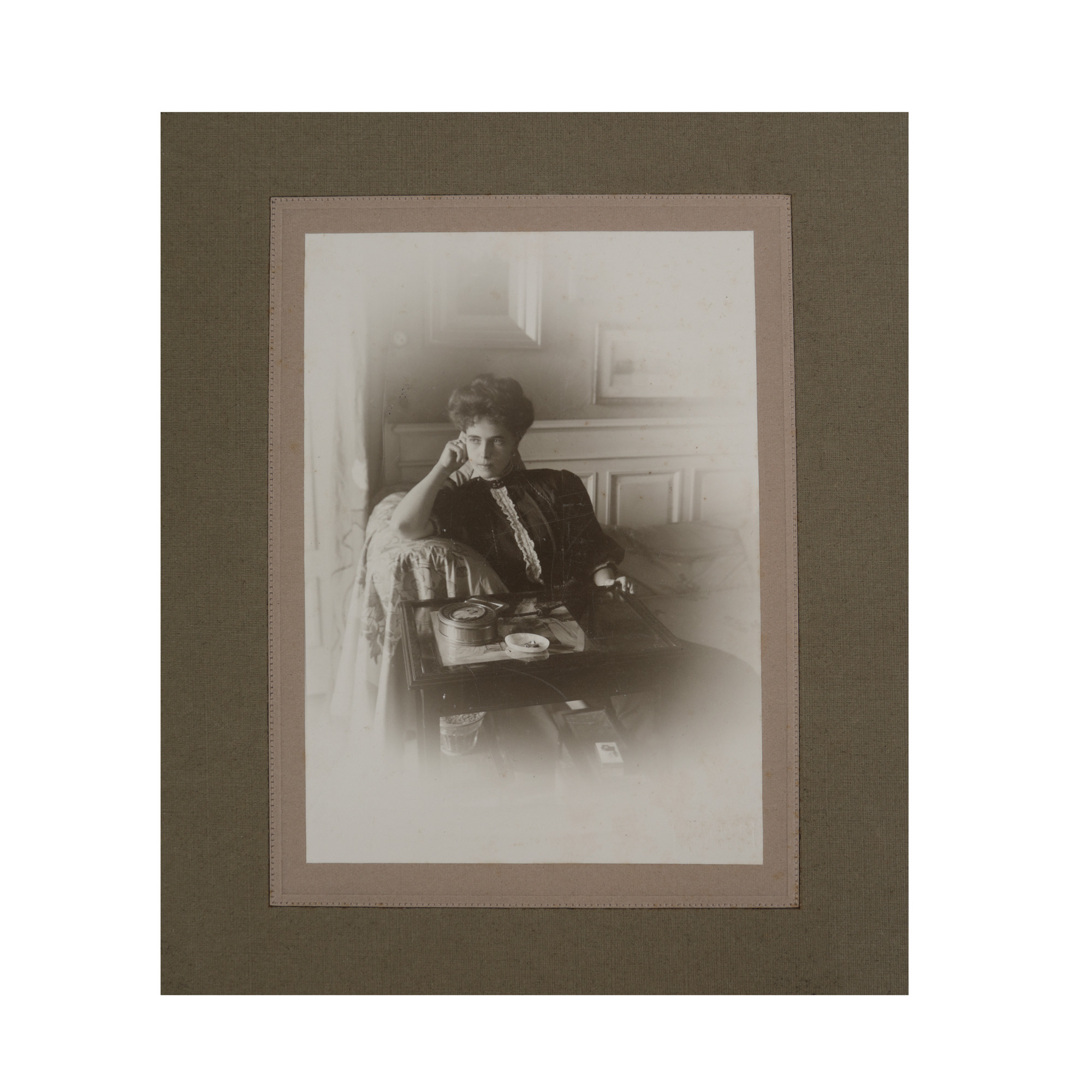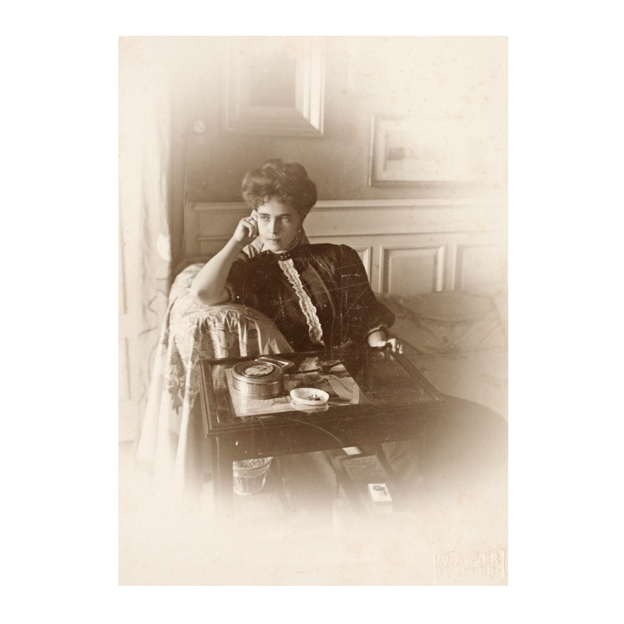 Principesa moștenitoare a tronului României, viitoarea regină Maria, era surprinsă de fotograf în liniștea reședinței familiei de la Coburg. Pe măsuța din fața ei se pot observa o cutie de bomboane și o scrumieră cu o țigare stinsă. Fotografia este lipită pe cartonul original.