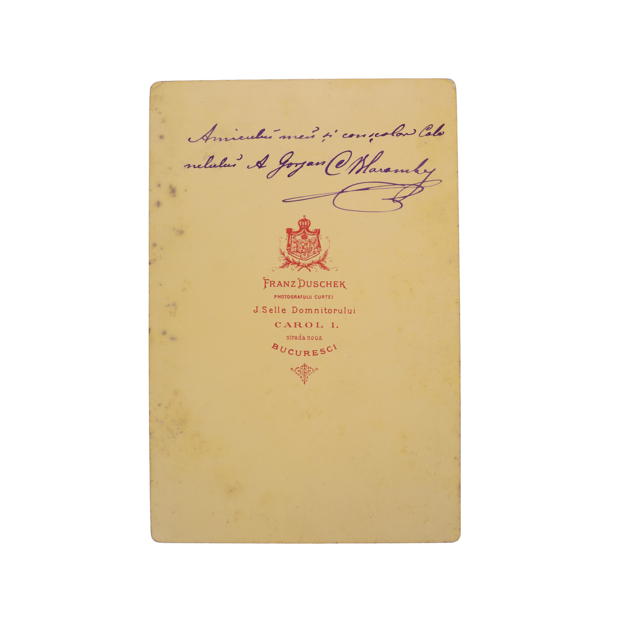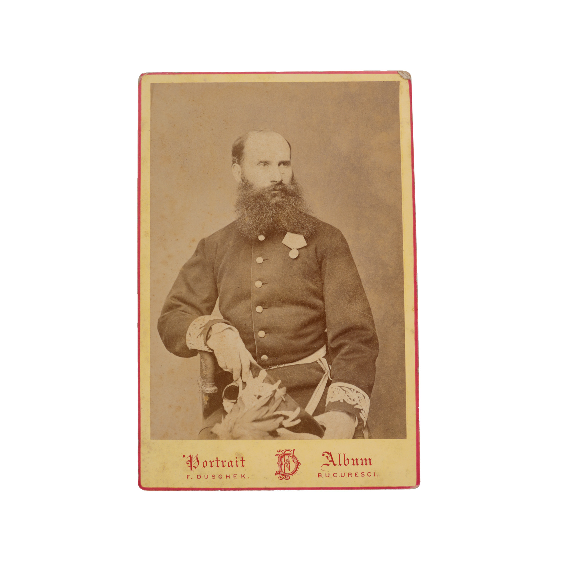 Colonelul Constnatin Blaremberg (1838-1886) a fost aghiotant al principilor domnitori Alexandru Ioan Cuza și Carol, viitorul rege Carol I. Fotografia este realizată în atelierul fotografic al lui Franz Duschek tatăl din București și poartă pe verso o dedicație olografă a colonelului către un confrate.