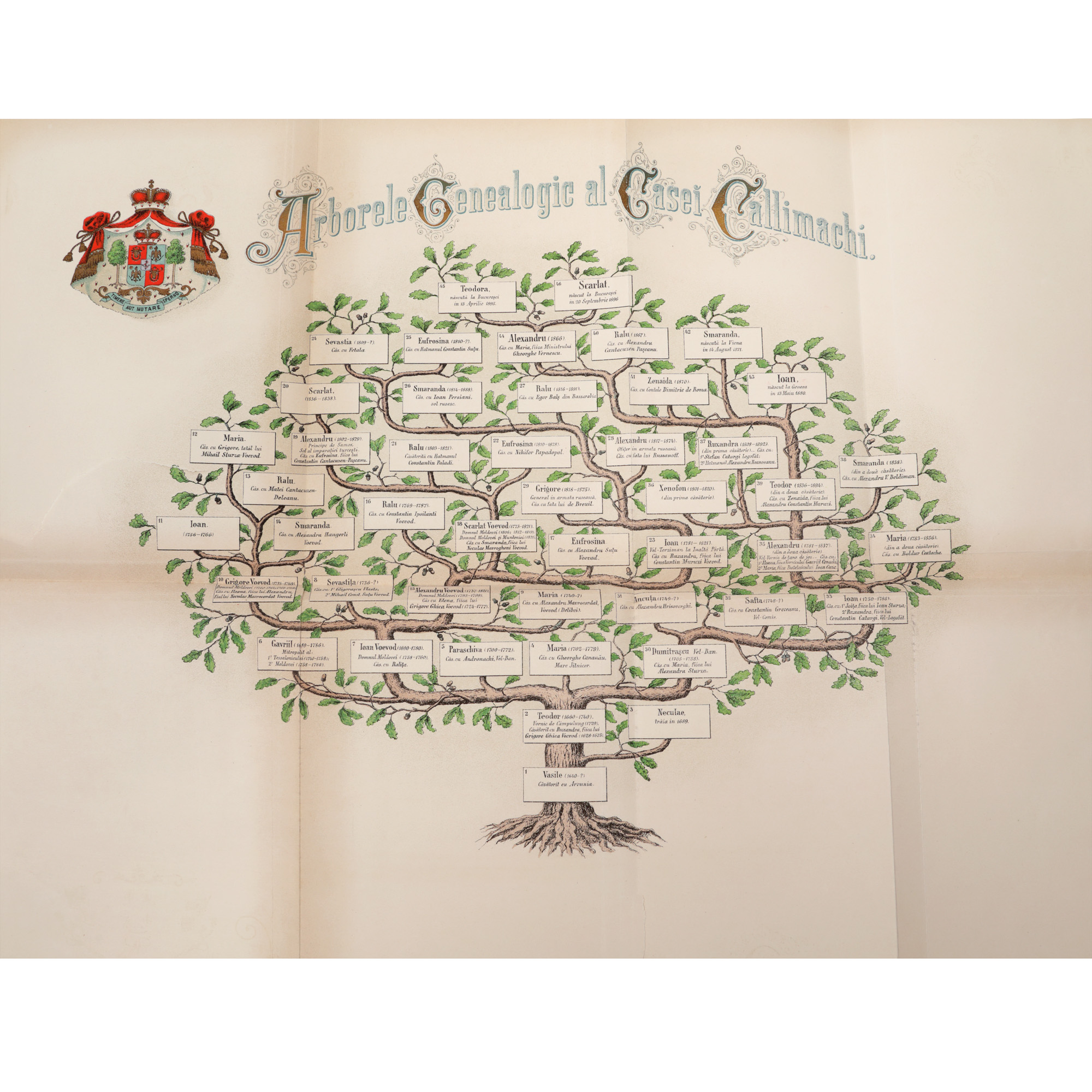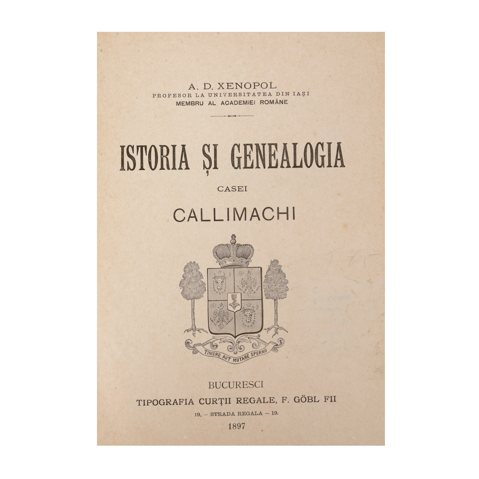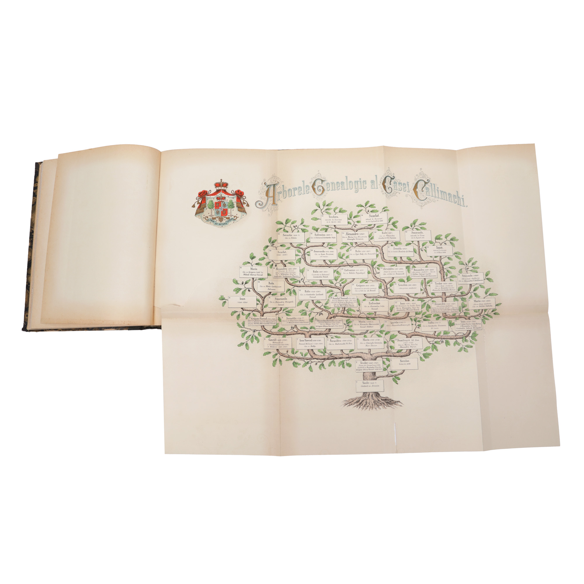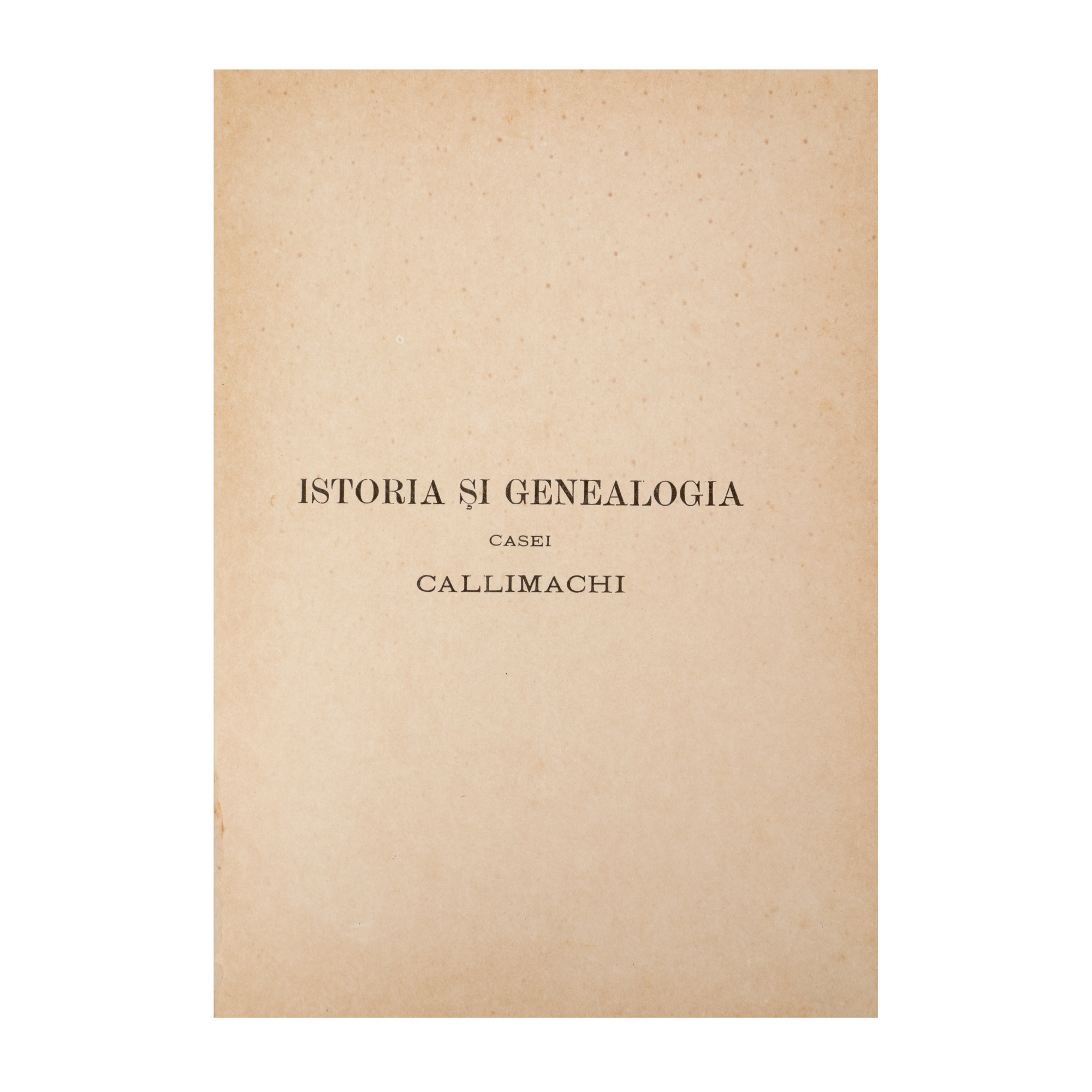 116. "Istoria și genealogia casei Callimachi", de A.D. Xenopol, București, 1897, cu o planșă ilustrând arborele genealogic al Casei Callimachi