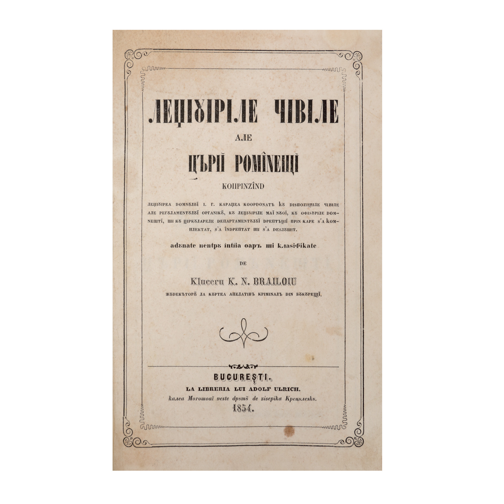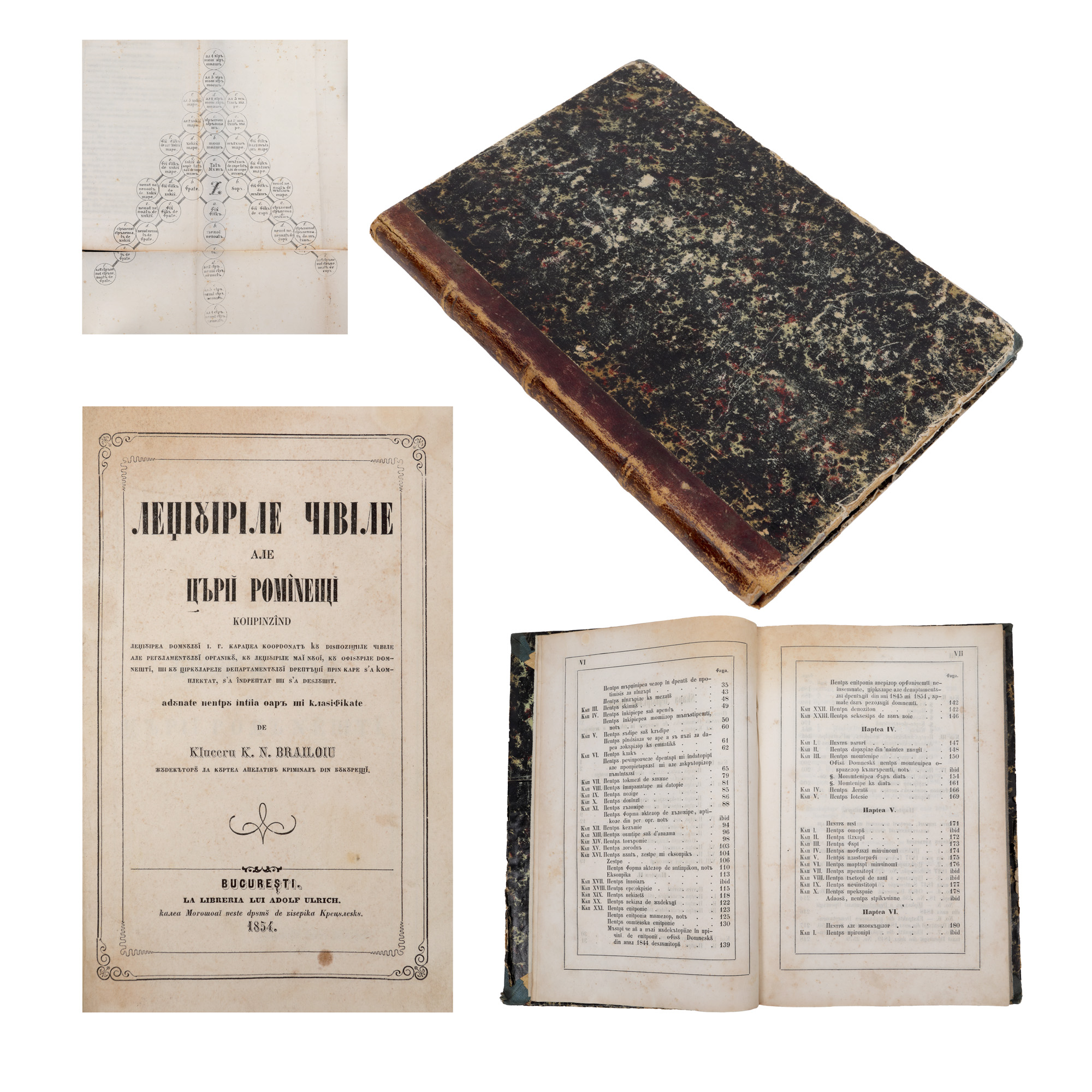 64. ”Legiuirile civile ale Țării Românești (cuprinde și Legiuirea lui Caragea)”, de clucerul K.N. Brăiloiu, București, 1854, provine din colecția scriitorului Vania Gherginescu