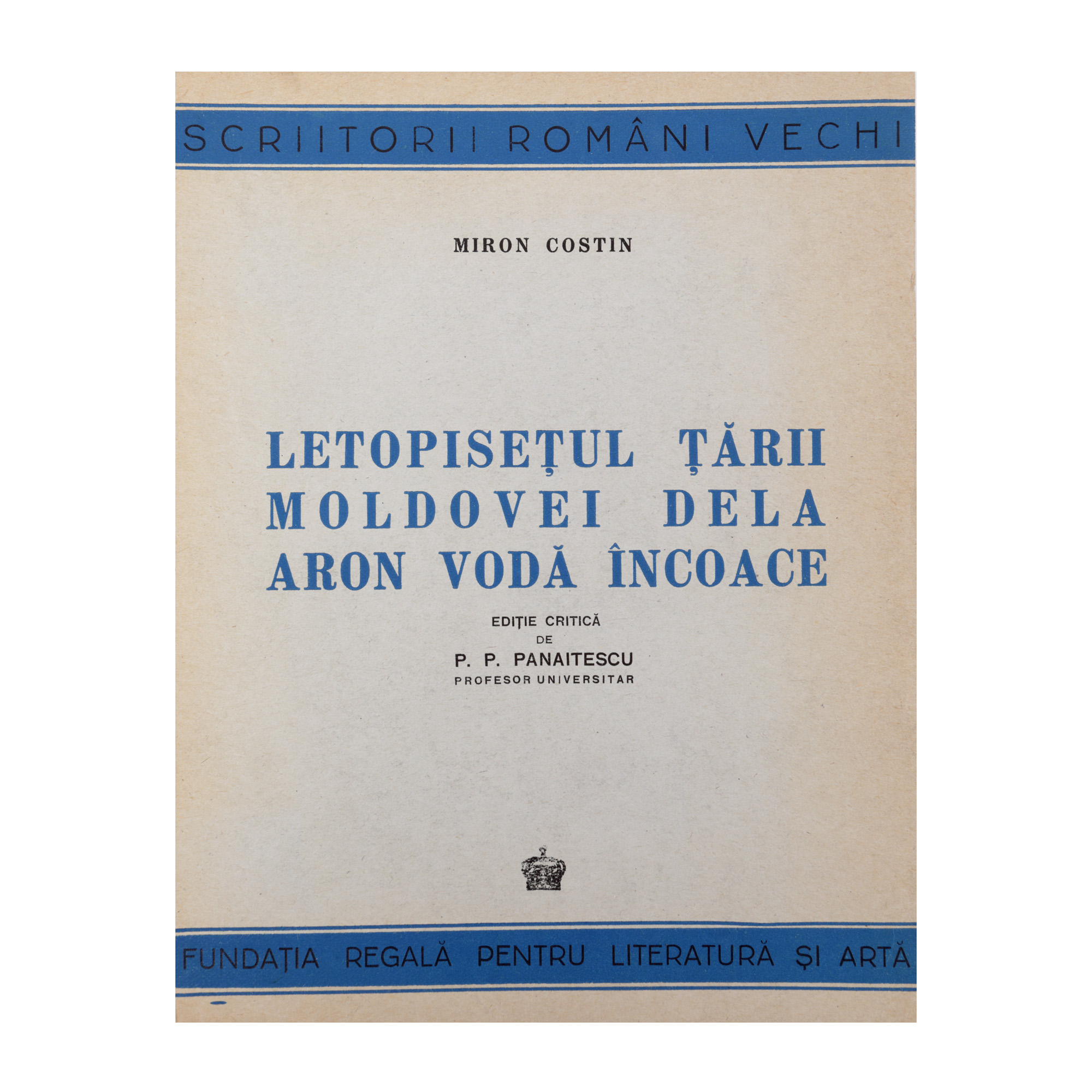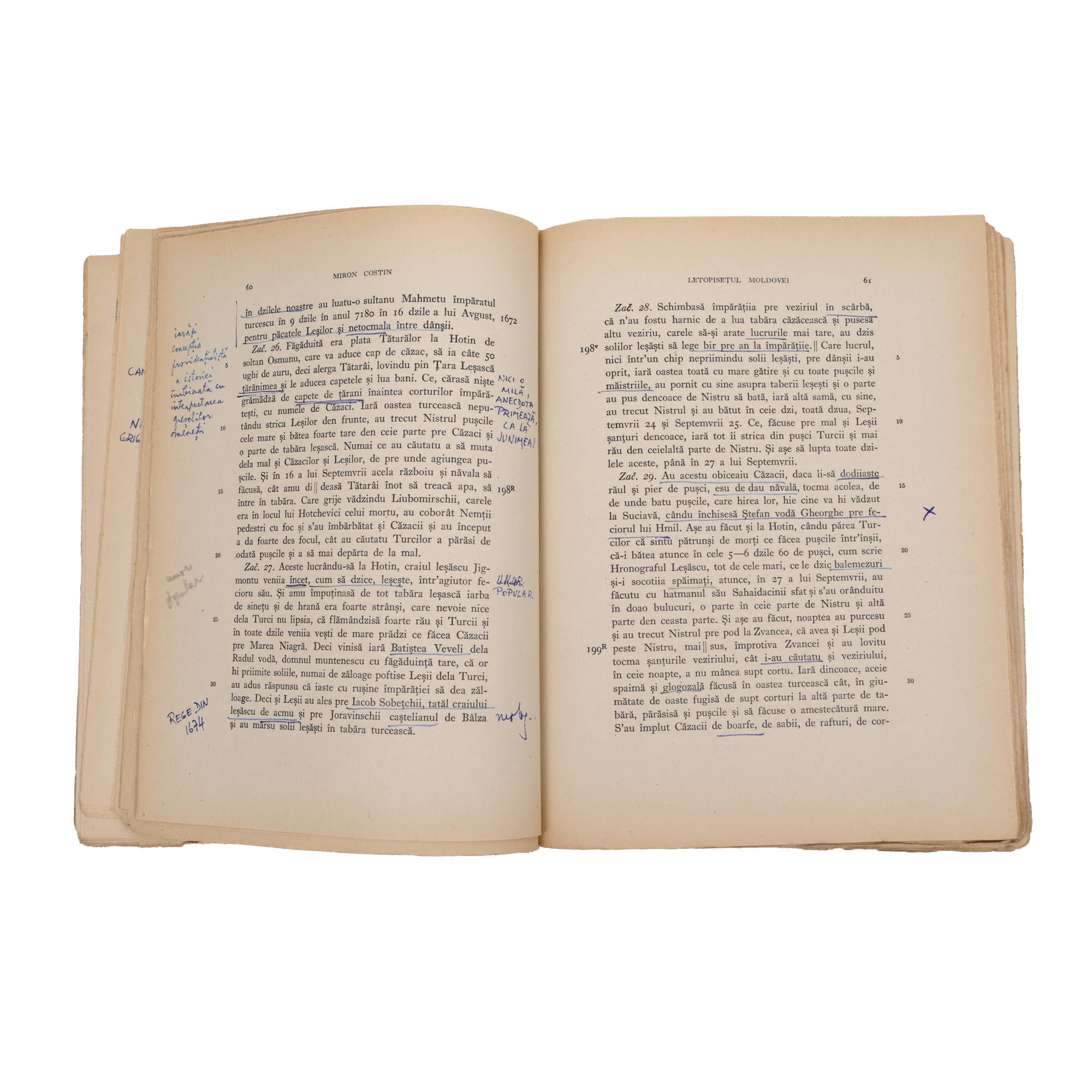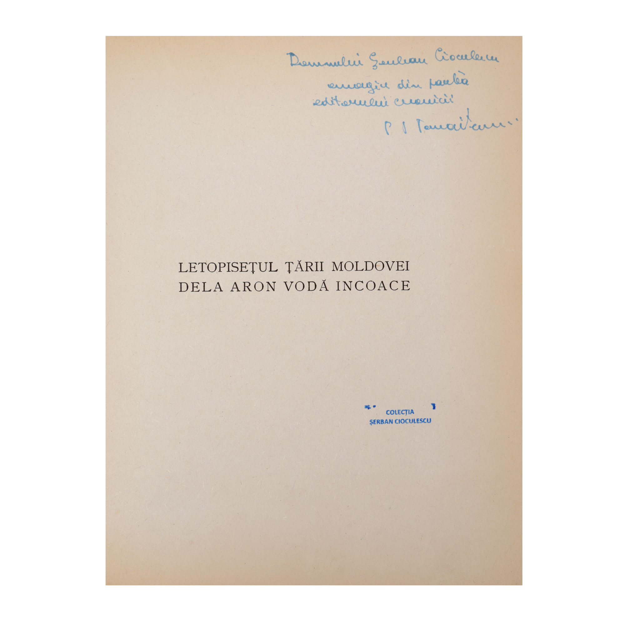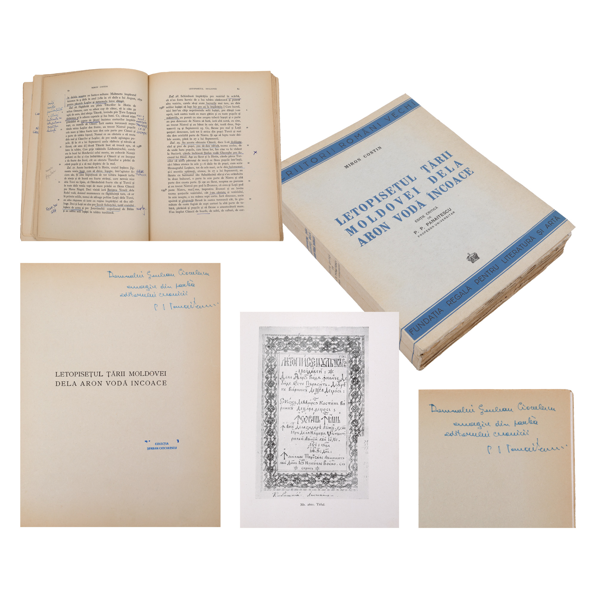66. "Letopisețul Țării Moldovei dela Aron Vodă încoace", de Miron Costin, București, 1944, cu dedicația istoricului Petre Panaitescu pentru Șerban Cioculescu, provine din colecția criticului literar Șerban Cioculescu
