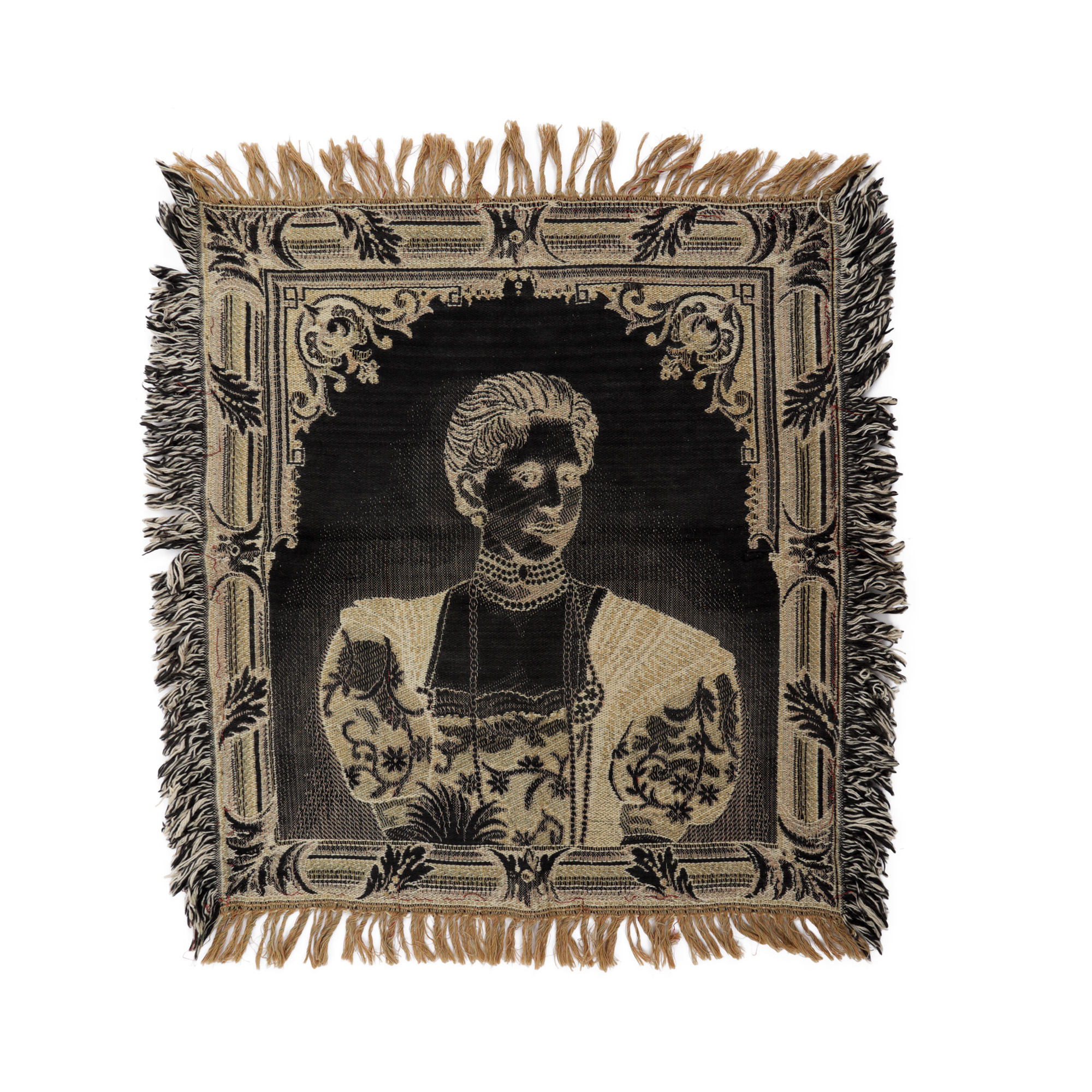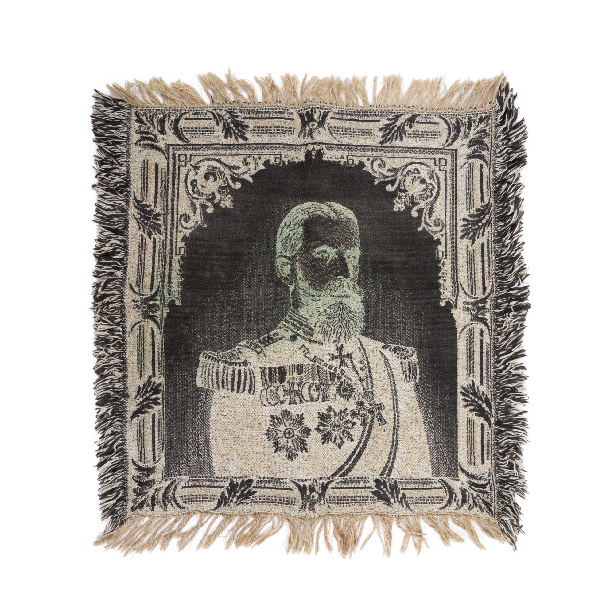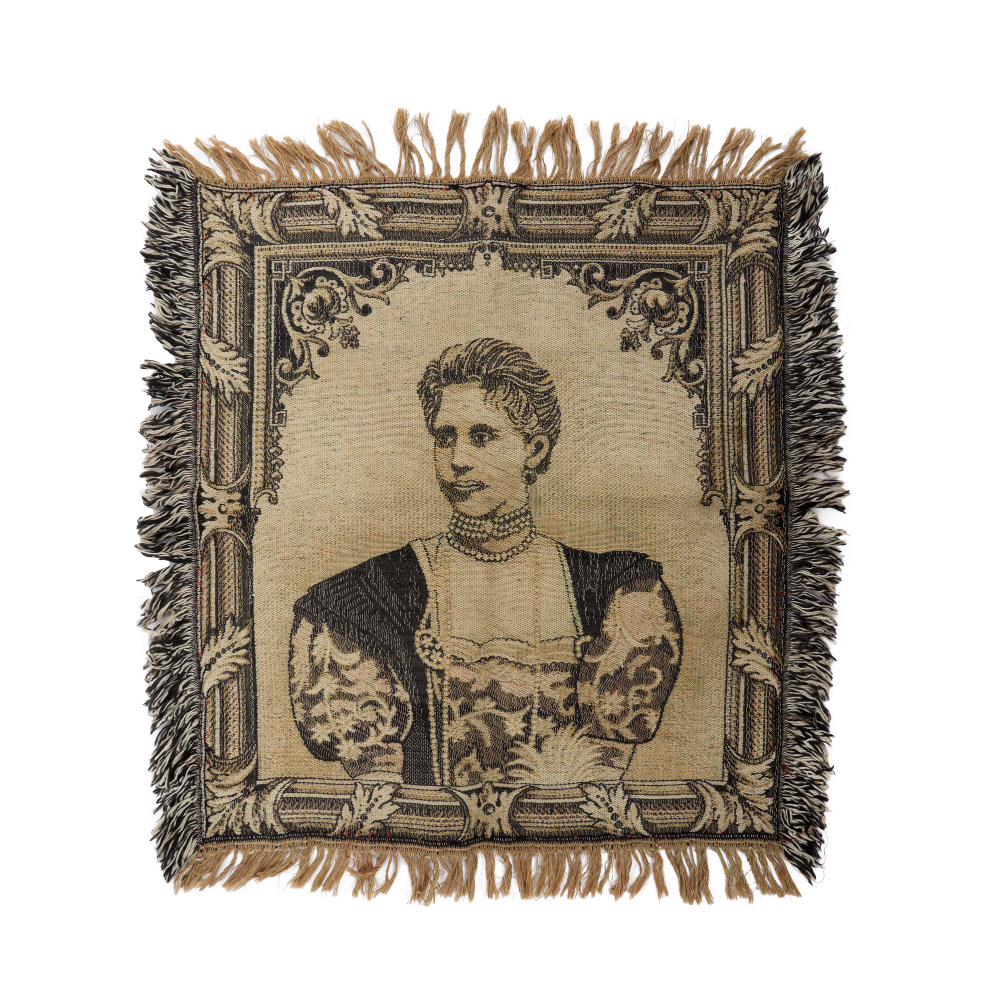 Cele două portrete ale membrilor familiei regale a României, regele Carol I și principesa Maria, au fost țesute mecanic drept piese de propagandă regalistă.