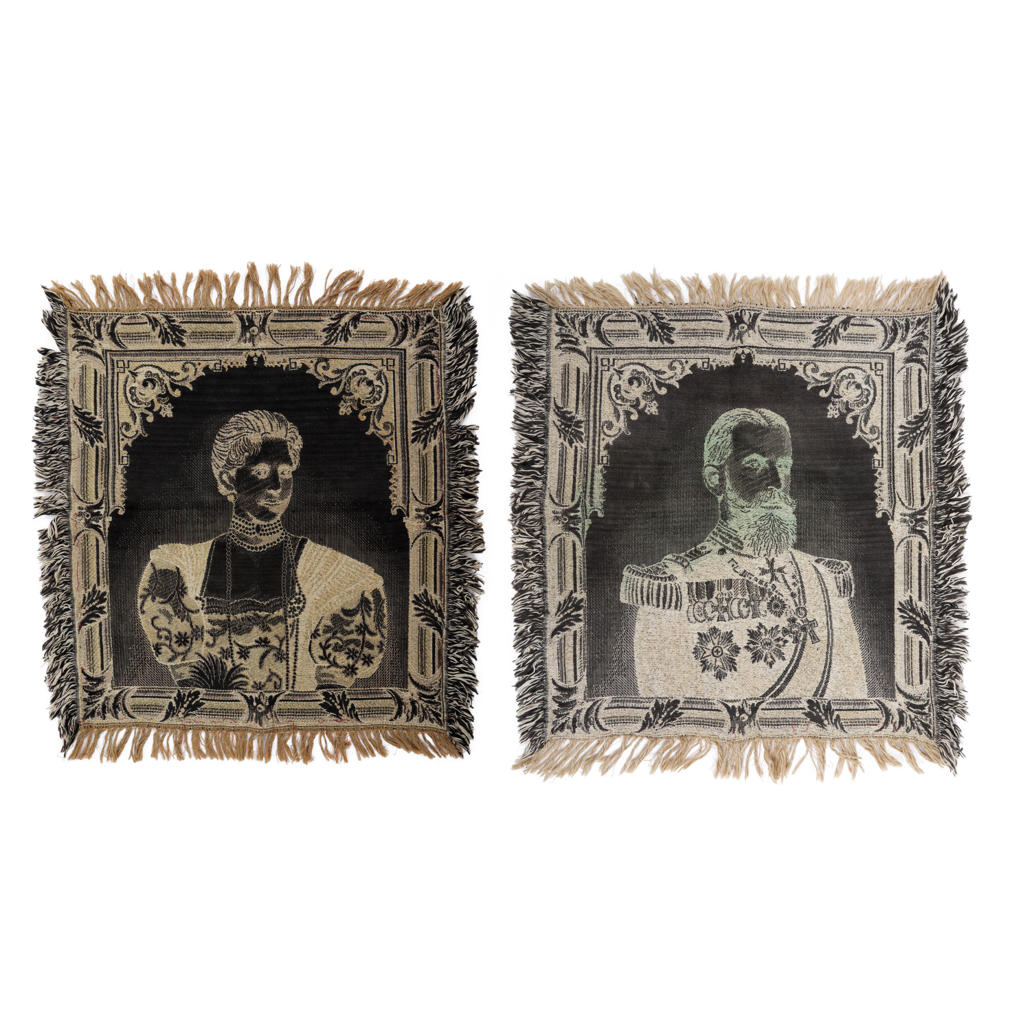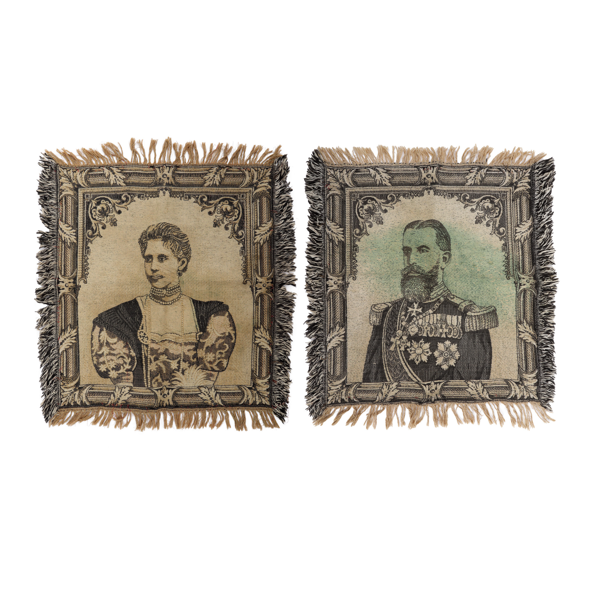 83. Lot format din două portrete țesute ilustrându-i pe Regele Carol I și Principesa Maria, cca. 1906
