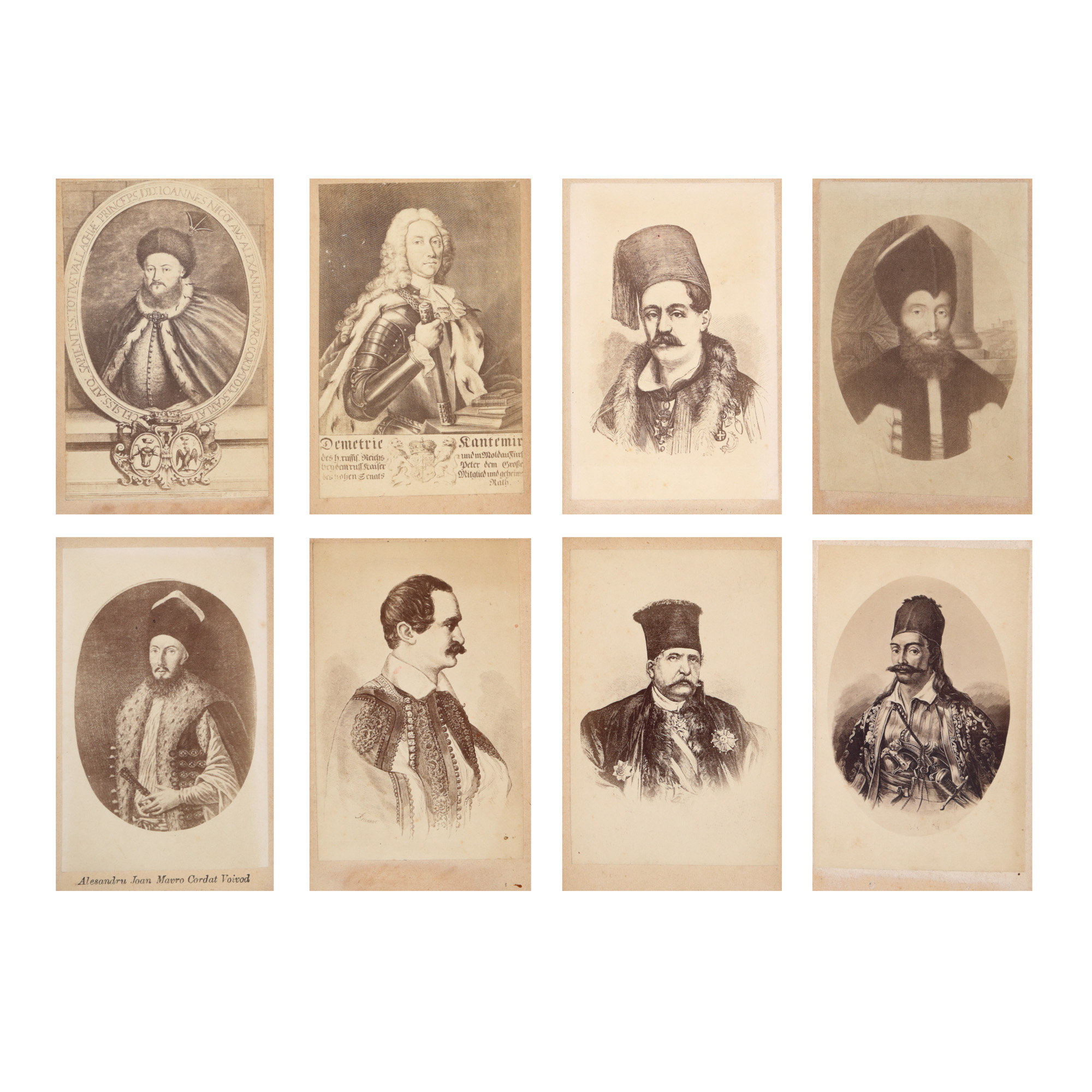 173. Lot format din opt fotografii cu personalități din istoria României, printre care și Dimitrie Cantemir, Anton Pann și Constantin Mavrocordat, cca. 1900
