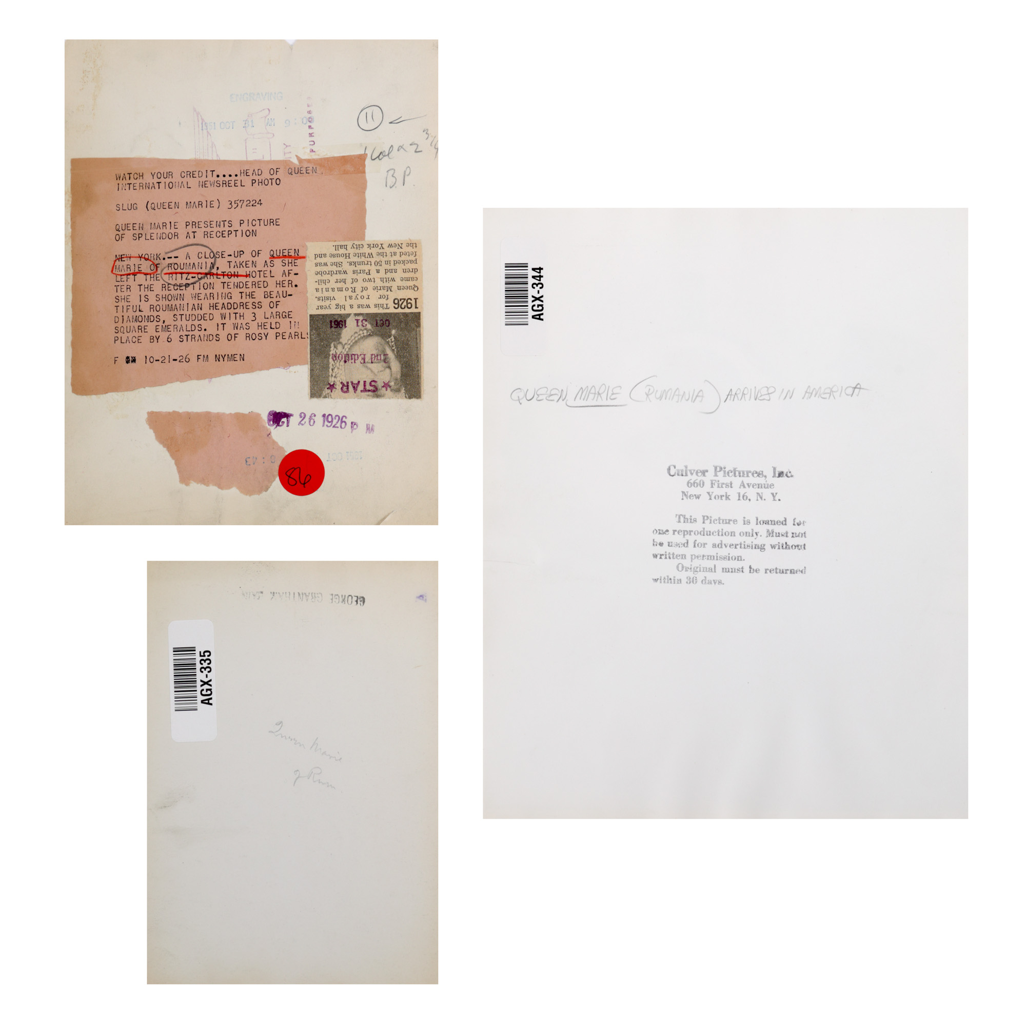 171. Lot format din trei fotografii de presă ilustrand-o pe Regina Maria în timpul călătoriei în Statele Unite ale Americii, 1926