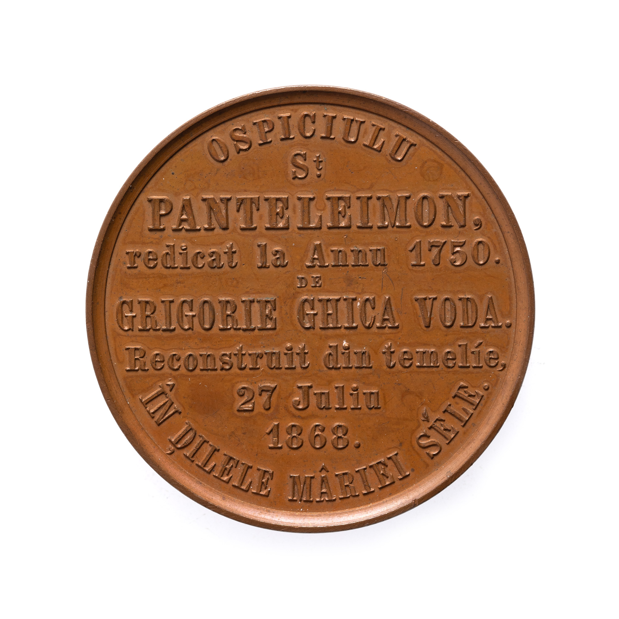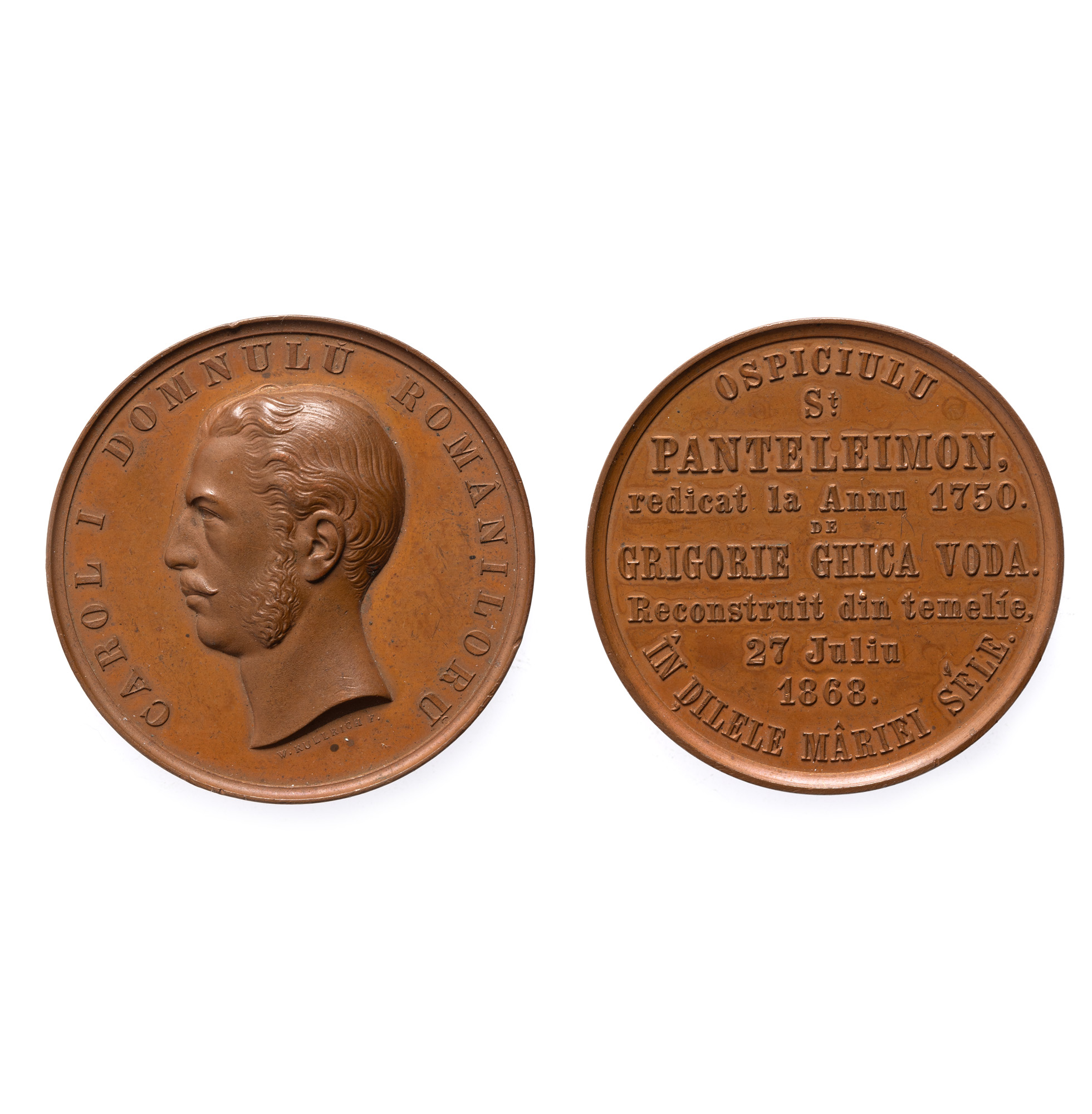 110. Medalie Carol I, Renovarea ospiciului Sfântul Pantelimon, gravor Wilhelm Kullrich, 1868
