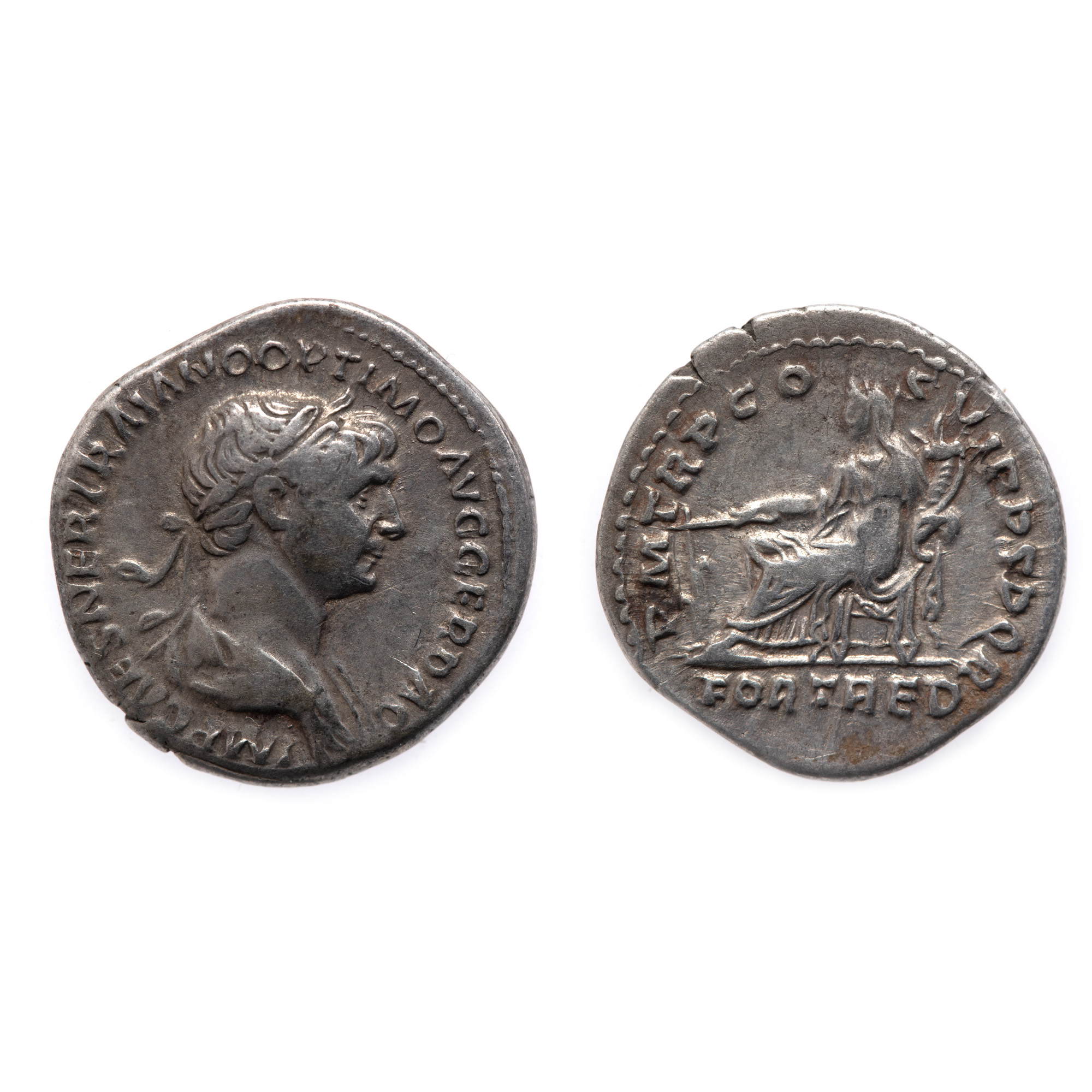 Legendă avers: "IMP CAES NER TRAIANO OPTIMO AVG GER DAC" Legendă revers: "P M TR P COS VI P P S P Q R FORT RED"