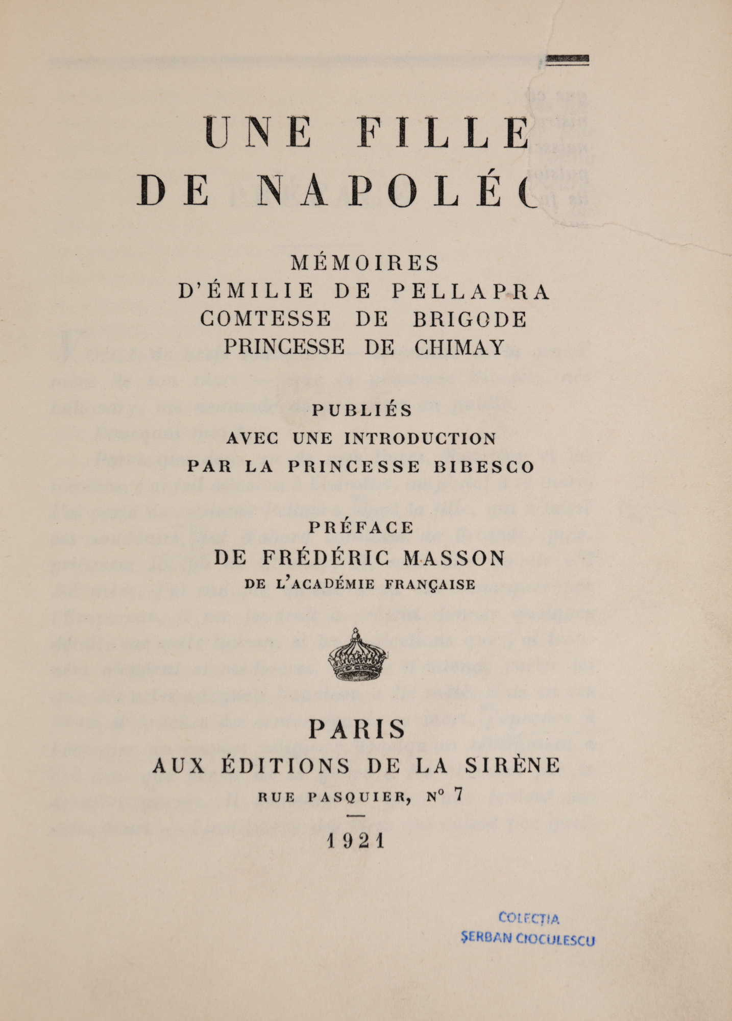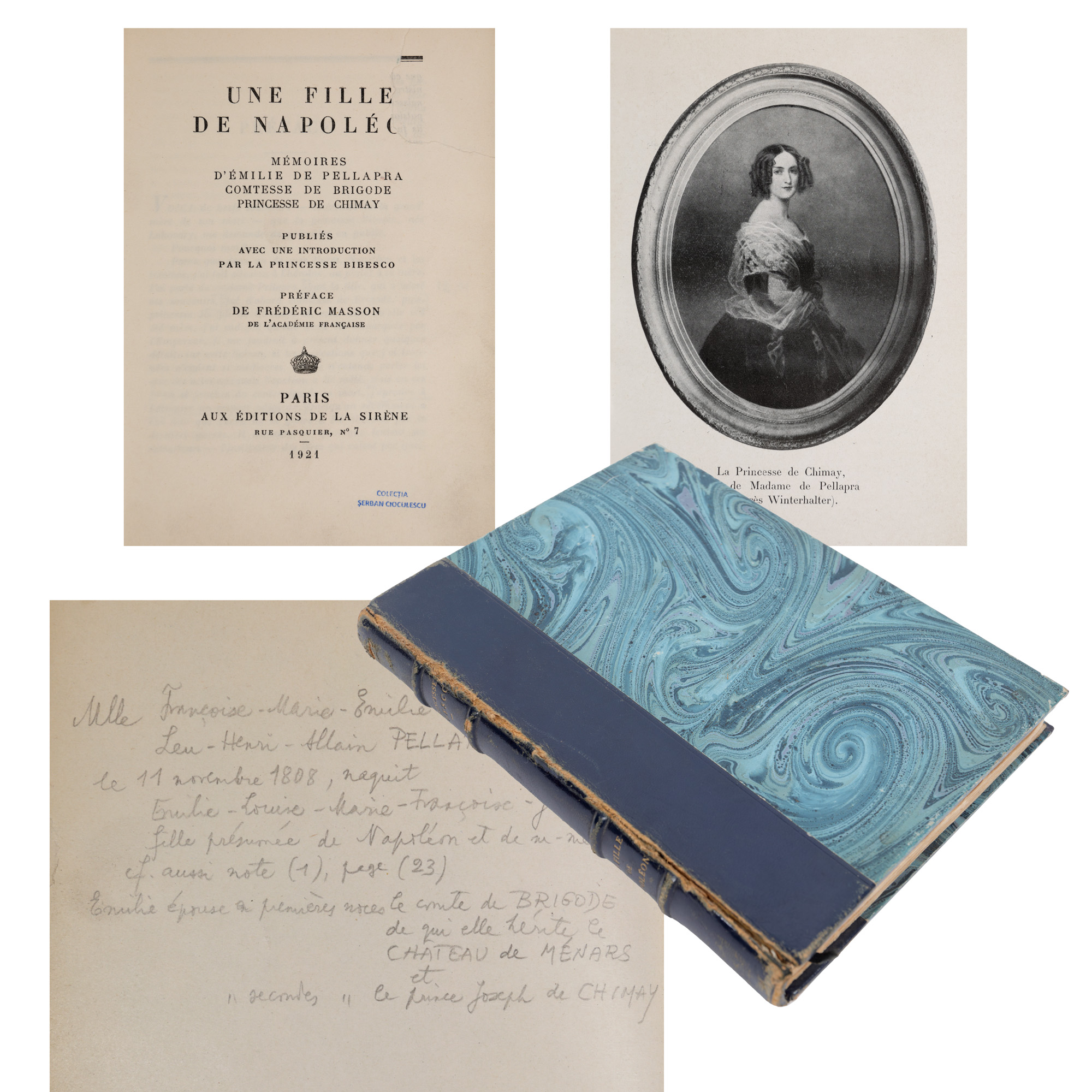 118. "O fiică a lui Napoleon: memoriile Emiliei Pellapra", de Martha Bibescu, franceză, Paris, 1921, provine din colecția criticului literar Șerban Cioculescu