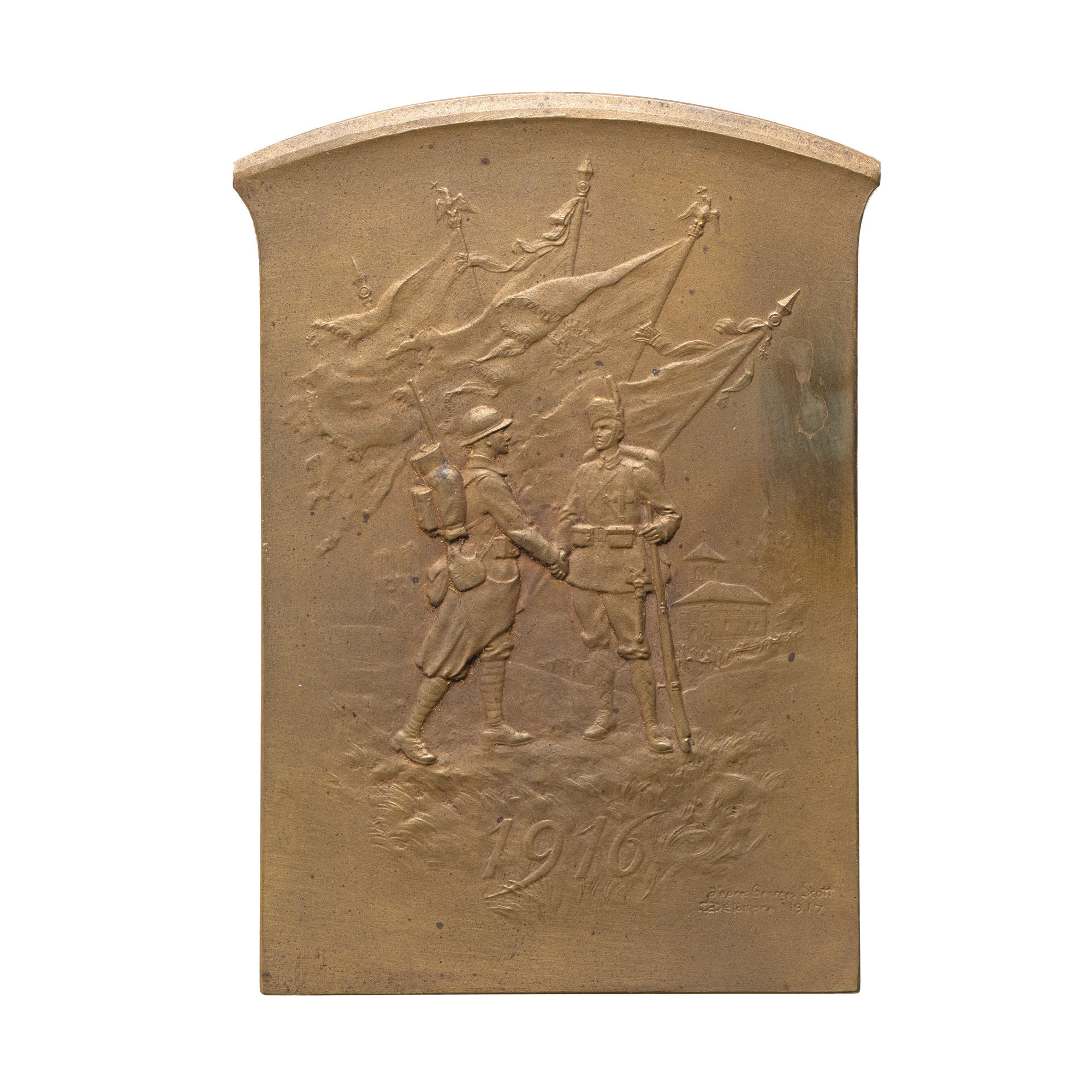 56. Plachetă "Alianţa româno-franceză", sculptată de Henri Delaspré după desenul pictorului Georges Scott, 1917