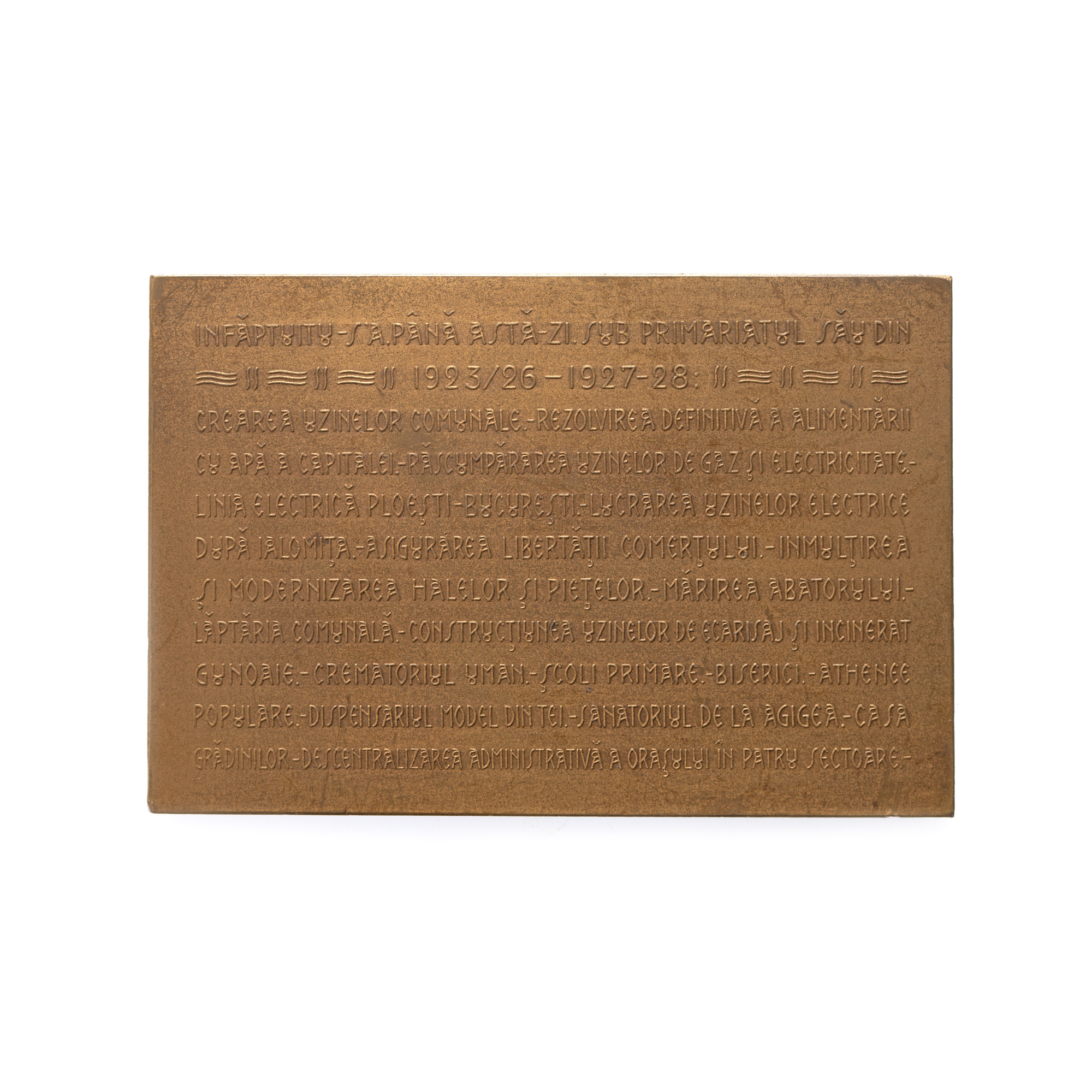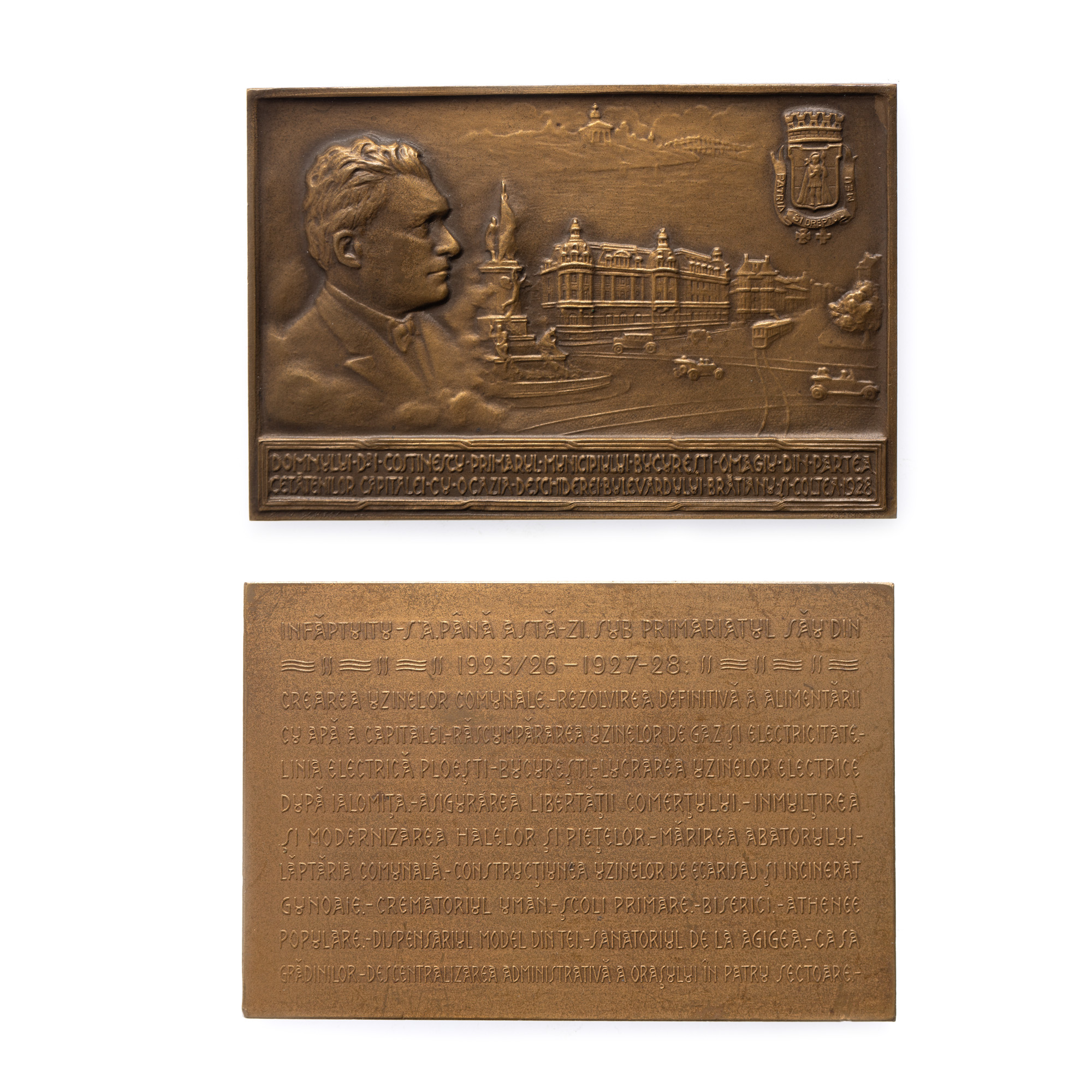 154. Plachetă omagiind pe Emil Costinescu, Primarul capitalei, cu enumerarea meritelor (între care "rezolvarea definitivă a alimentării cu apă a capitalei"), gravori Richard Mayol și Carniol Fiul, 1927