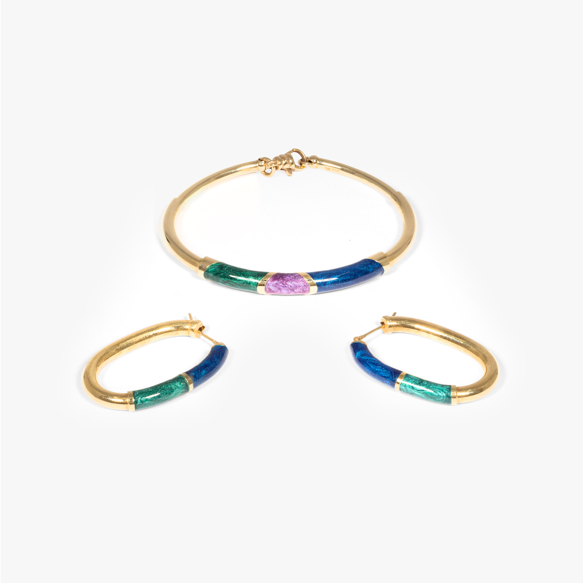 69. Set format din brățară și pereche de cercei, din aur decorat email