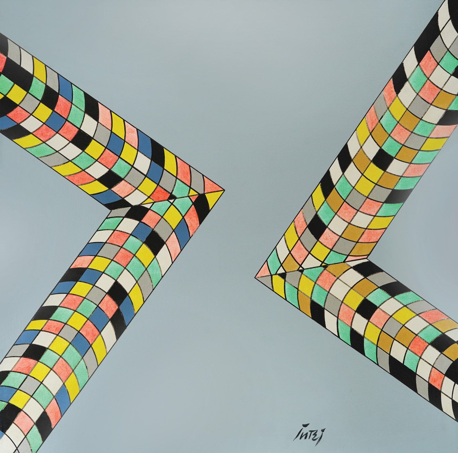 A characteristic representative of the abstraction of the 70s, Miroslav Šutej (1936-2005) combined op-art structures, fragmented rasters creating optical illusions, with intense, pop-art colors in his painting and drawing oeuvre. His paintings created irregular patterns, which would try to energize the surface in unexpected ways. This painting approaches this problem with two shapes positioned on the left and right side. Both are textured with multicolored rectangles, and their distortions, as well as the lines on the shapes themselves, suggest some kind of spatiality or roundness of these two objects. Abstraction (and furthermore strongly geometric, which usually emphasizes the two-dimensional character of a picture) here obtains the illusion of three-dimensionality. Šutej skillfully used some settings of abstraction, playing with the dual nature of painting - as a surface and as an illusionary space. Also, here Šutej points out, inheriting the teachings of classical modernism and their postmodern critiques and relativizations, that the illusion of three-dimensionality is not necessarily linked to the figurative representation, and that abstract art is not obliged to remain faithful to the surface in composition. FG