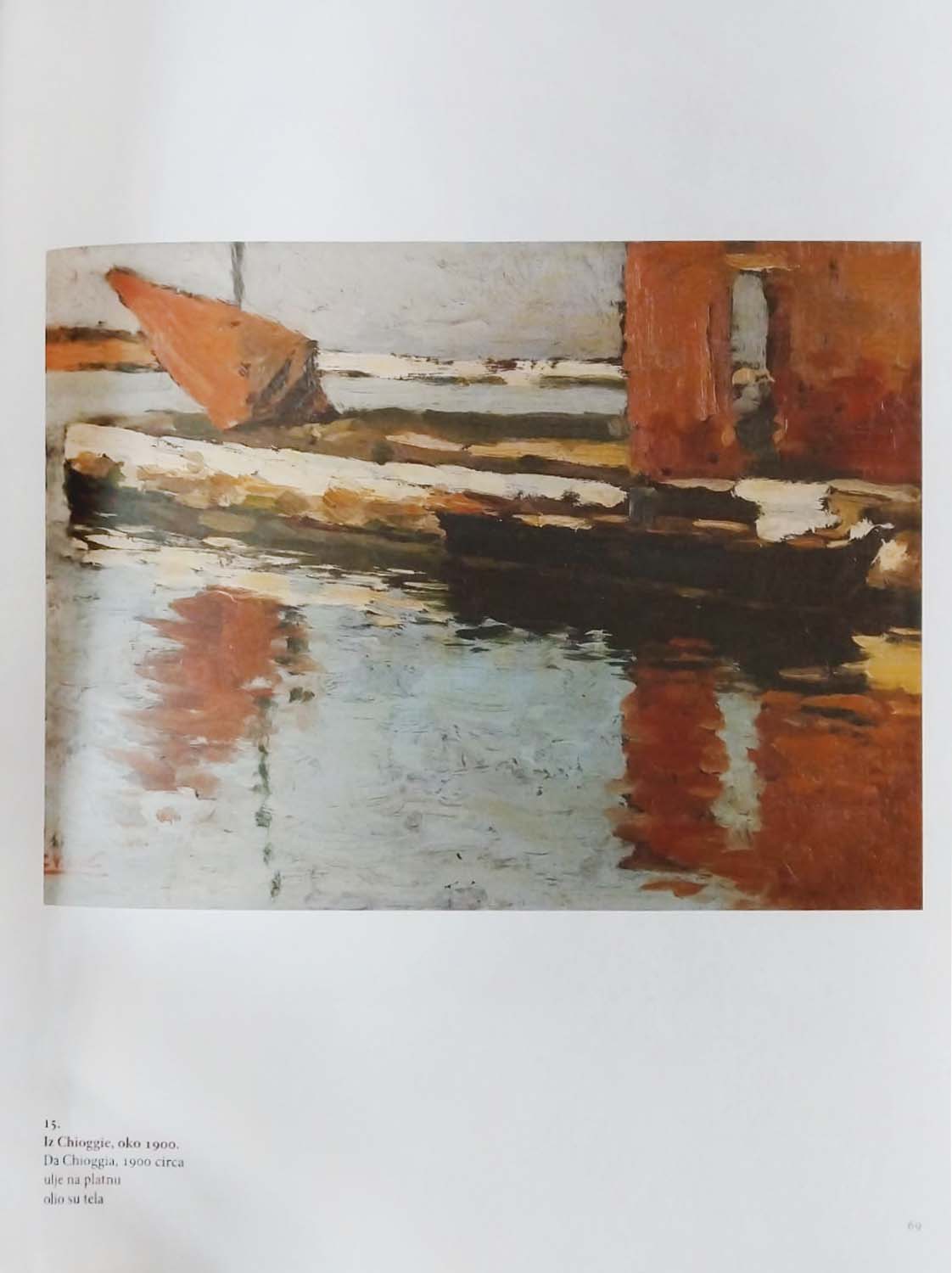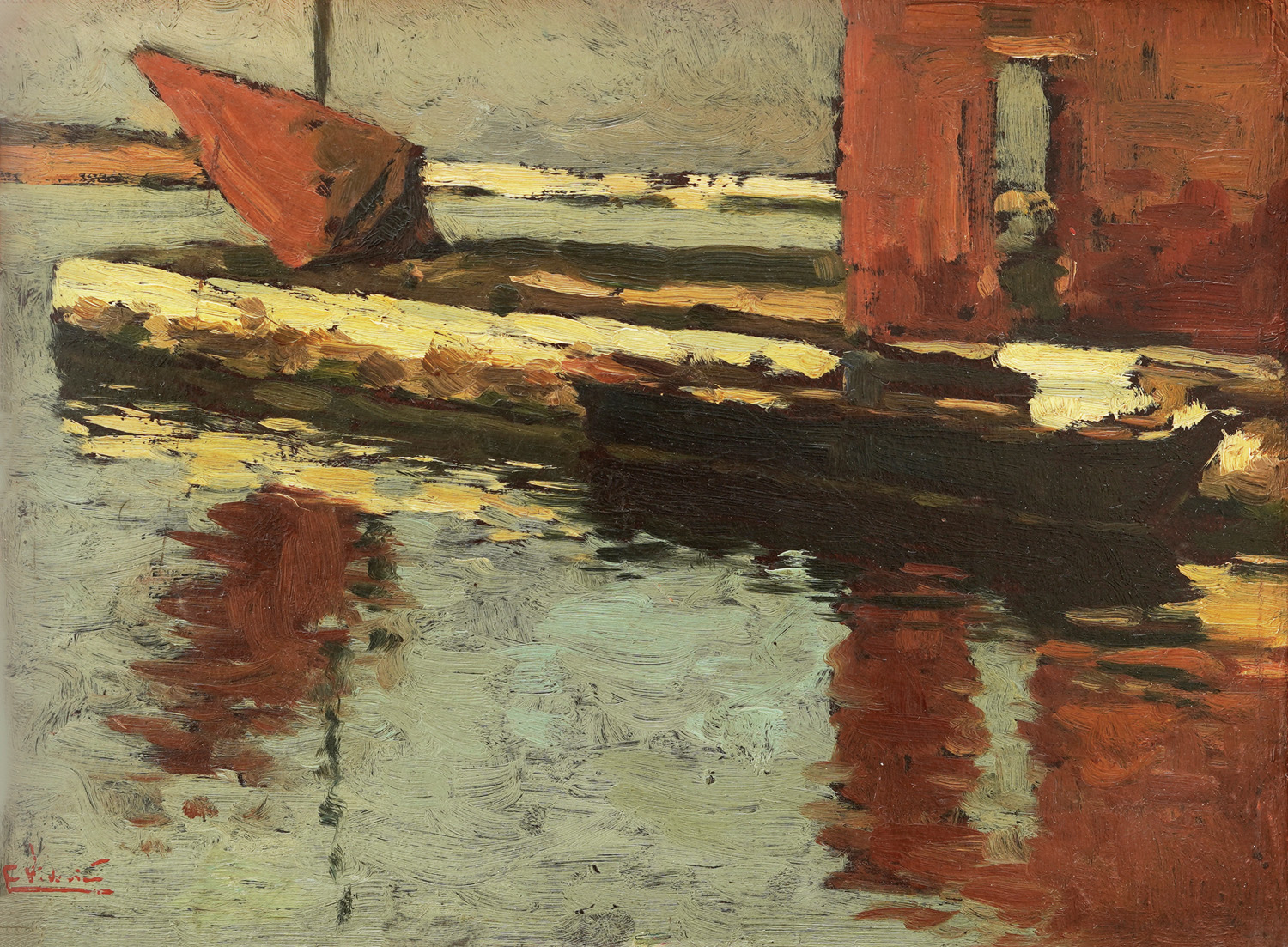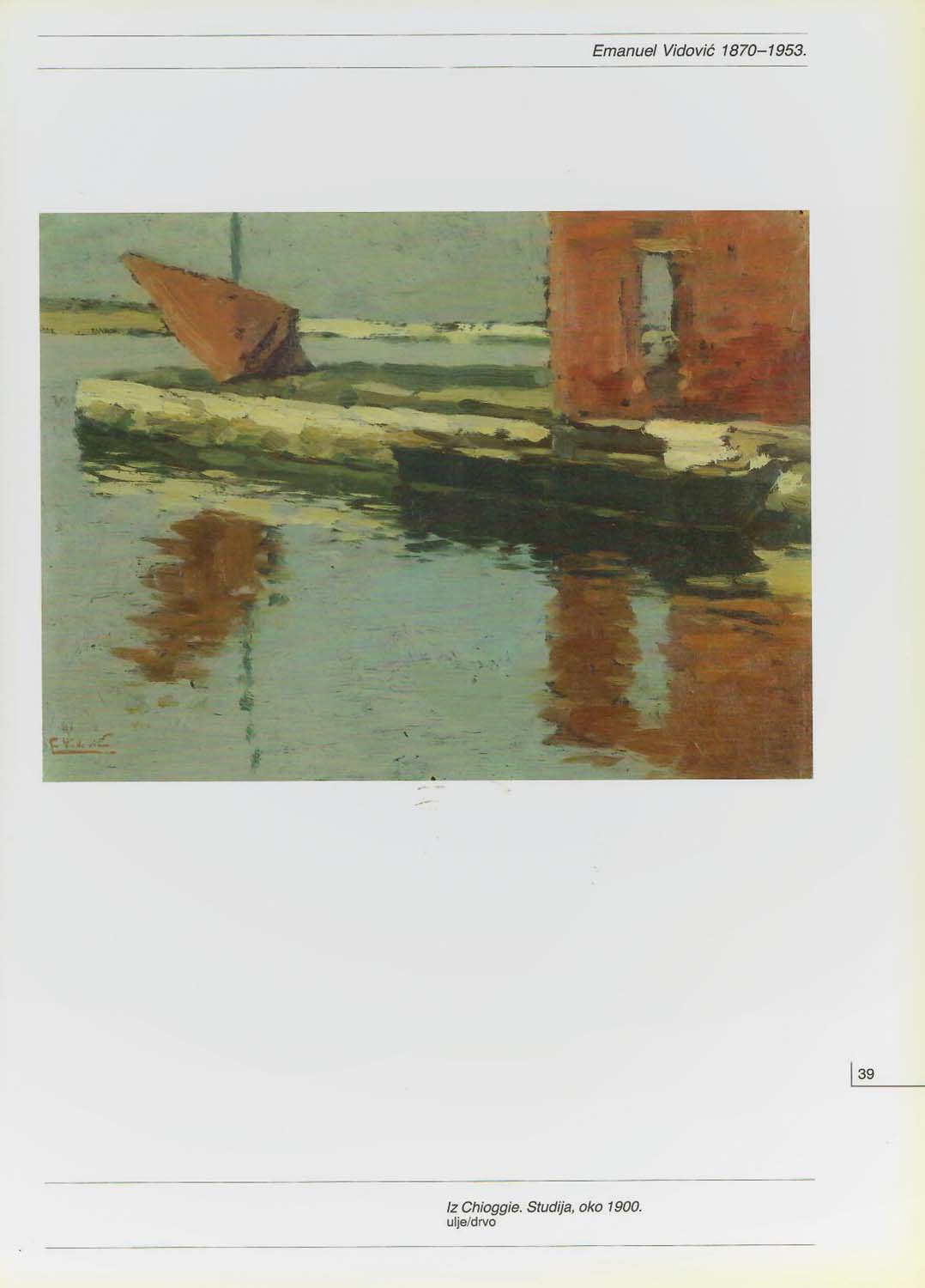 The Split painter Emanuel Vidović (Split, 1870 - Split, 1953) is one of the most influential Croatian painters of the 19th and 20th centuries. He honed his painting skills first in Split, then in Venice and Milan. The cities that had a great influence on him are Chioggia, Venice, and Split. Over the years, he has arranged successful exhibitions in Vienna, Milan, London, Sofia, and Zagreb. During his life, Vidović changed several addresses in Croatia and Italy. In Croatia, he lived in Split and Trogir, in Italy in Milan, Venice, and Chioggia - all these places have left an indelible mark on his creativity. Vidović's paintings from the period of studies in Venice have not been preserved. Throughout his life, he often transferred Dalmatian landscapes to canvas. A turning point in his creation is the masterpiece "Angelus" (1906), which begins the period of twilight paintings with reduced chromatics. Landscapes dominate until the 1930s when Vidović begins to paint the first darkened bits of nature with expressionist features, as well as the interior of his studio and Split churches. He spent the end of his life in bed, after a femoral fracture, and in that period he painted from memory, locked in the studio. In Chioggia, a fishing town near Venice where he met his wife Amalia Baffo, he was attracted to rainy days and sunsets. In the twenties, he spent time there whenever he managed to save some money for renting a studio. It was during this period, at the end of the 19th century, that the oil on cardboard "From Chioggia" was created. This achievement of early creativity has a horizontal composition of a three-layer order. Sea dominates the painting, or rather the reflection of a boat on the wrinkled surface of the sea. The pasty, densely and blotchy applied colors create a quiet, melancholic atmosphere of the canal in Chioggia.
