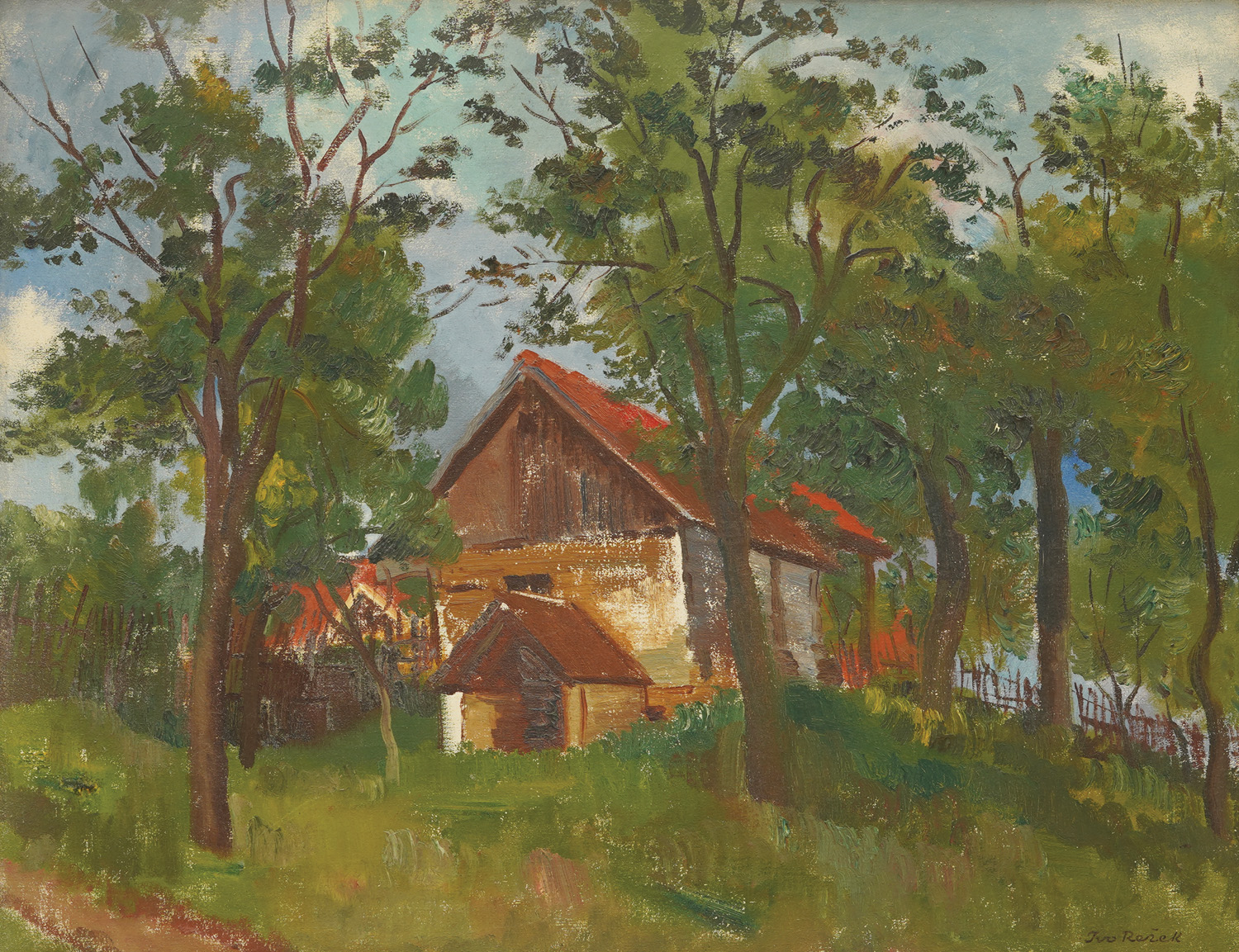 Ivo Režek (Varaždin, 1898 - Zagreb, 1979) was a Croatian painter and cartoonist who was educated in Zagreb, Prague, and Paris. He often transferred motifs from his native Hrvatsko Zagorje to the canvas - landscapes, scenes from the lives of the working class and rural world in rich tones of brown, green and ochre. This is the kind of motif brought by this oil on canvas which is dominated by an old house between tall green foliage.