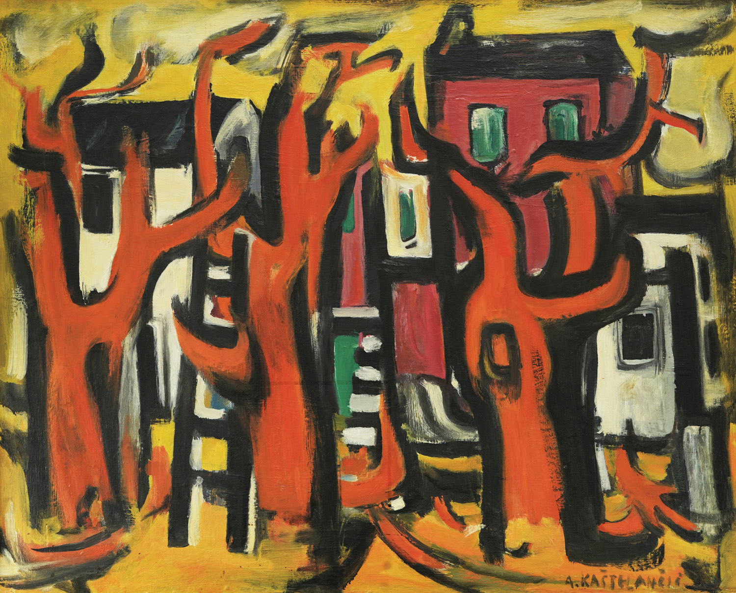 Ante Kaštelančić (1911 – 1989) was a painter with a pronounced coloration, which followed him throughout his opus, perhaps most pronounced in the pictures of verticals that drew inspiration from scenes of moored ship masts. After schooling at the Academy of Fine Arts in Zagreb, he perfected his skills in Paris, with André Lhote. There he had the opportunity to sharpen the coloristic inclination that was smoldering in him, and to learn how to use it most effectively as a basis for compositions of synthesized forms. On his canvas from the 1950s, we see clear echoes of the Parisian painting fashion between the two wars. Kaštelančić plays with coloristic bravura balancing parts of the picture in a coloristically intense and dynamic game. The most obvious is the balance of the yellow base and red trees, which are partially indicated by thicker, black, elegantly rounded lines. They sometimes border the depicted houses. Apart from making the composition more well-structured, these black lines, in contrast with the emphasized coloration of the painting, contribute to the impression of pervasive liveliness, a danced-out moment, which (due to the name of the painting) is associated with a vision and experience of life on the Mediterranean. The painting's dynamics are further contributed by other coloristic accents – the pink, present on the houses on the right and the slightly more discretely present green, whose strokes deepen some house openings. The rest of the houses are painted white, emphasizing the overall impression of atmospheric luminance or sunny day and the intense radiance of colors. This painting is a testament to Kaštelančić's understanding of the language of painting as playful, rich, and articulate coloristic buzz. FG