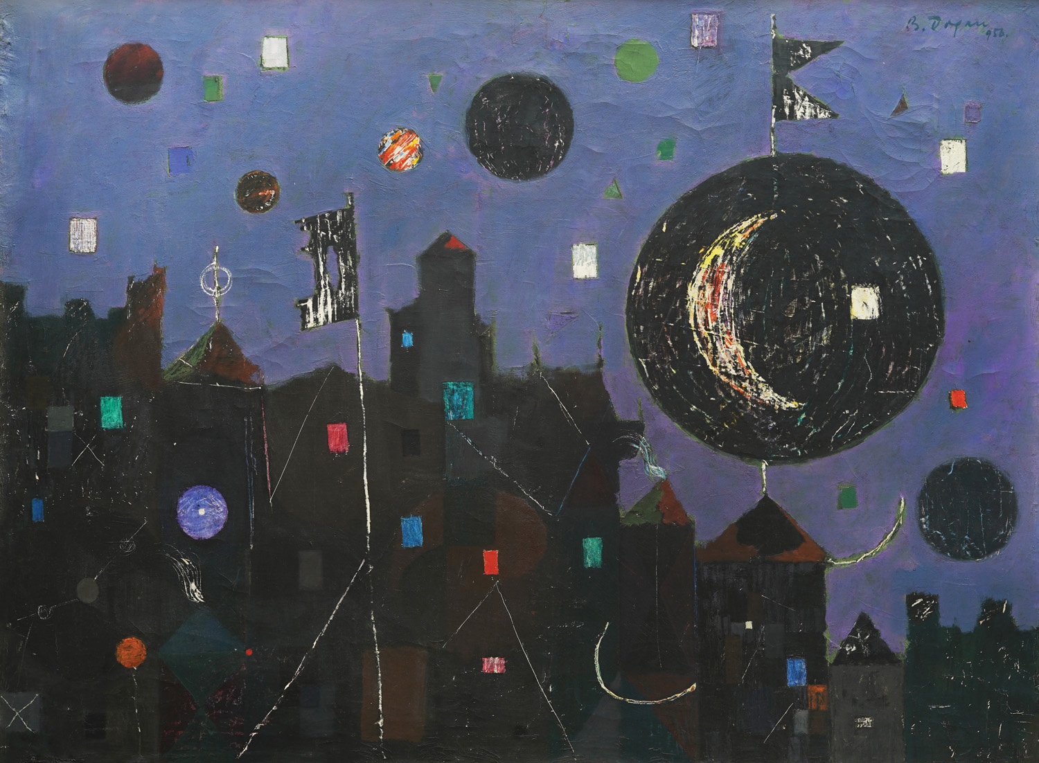 The fantastic and romantic composition "Old Town" by Boris Dogan (1923-1992) showcases his characteristic, pronounced grafism. Its model can definitely be found in the works of Paul Klee. Dark geometric surfaces suggest the view of a nighttime city, against an indigo blue background. The right side of the picture is dominated by a circle containing a large crescent, with linearly highlighted textures. Circles and quadrangles of different colors are scattered across the surface of the painting, as if suggesting various night illuminations in the city from undefined sources. The nocturnal cityscape is simultaneously subdued, due to the tonal dominance of indigo blue, but also playful, lively, fervent, due to the scattered shapes in the picture. In addition to painting, Dogan often successfully pursued illustration and design. By implementing some basic modernist views on the effects of shapes and colors, as well as those regarding the visual work as an organism that needs to emanate special emotions thanks to adept arrangement of form elements, he managed to introduce both painterly mastery and lightness and flutteriness into his work. The pursuit of these principles in art, equally applied in both painting and design, marked the theoretical and practical efforts of modernists and left a significant echo in the artistic weltanschauung of Boris Dogan. FG