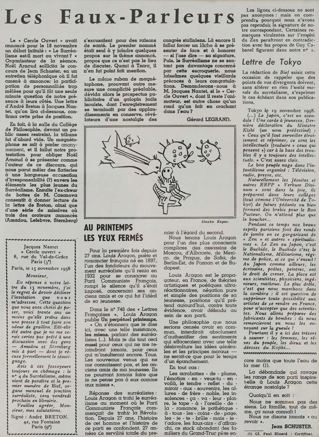 The work is an original sketch for a drawing by Slavko Kopač for Revue Bief, no. 2, December 15, 1958. The work was signed by Slavko Kopač on the back ("slavko") and surrealist poet Joyce Mansour.