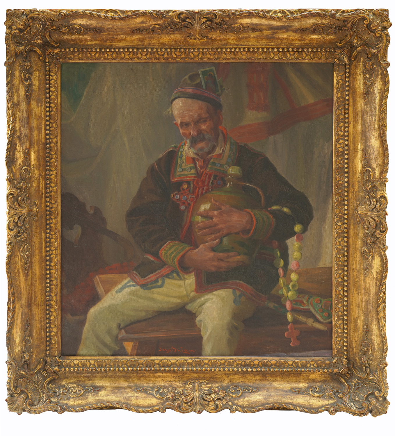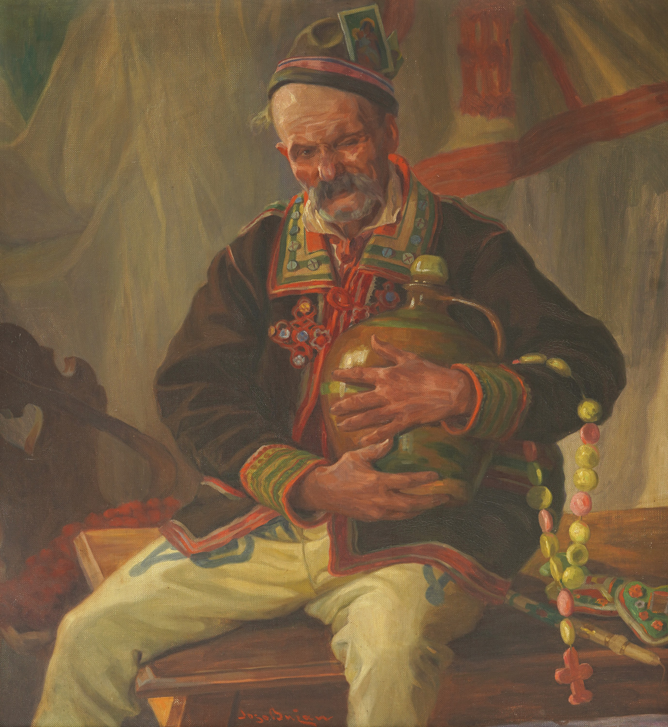 Joso Bužan (Sisak, 1873. – Zagreb, 1936.) was a Croatian painter of the first modern period, best known for paintings of rural life's themes and characters. He studied painting at the Craft School in Zagreb, and later in Vienna, as well as several Italian and German cities. He did decorations in the Department of Worship and Instruction palace in Zagreb, made commissioned portraits of famous people, genre paintings, and was also involved in photography. He exhibited at the Art Pavilion in 1903 with noticeable love towards folk motifs. Vlaho Bukovac influenced his light palette and vivid colours. The main subject in his oil on canvas painting titled "Man with a Jug" is a peasant, with the typical motif of Bužan’s paintings – folk costumes. Optimism towards life is visible in this realistically expressed painting. The singularity of the peasant can be recognized by him hugging a bottle, presumably with some alcoholic drink, there's a rosary around his hand, and a playing card on his hat. Bužan depicts joy and cheerfulness, spontaneous faces of a country man.