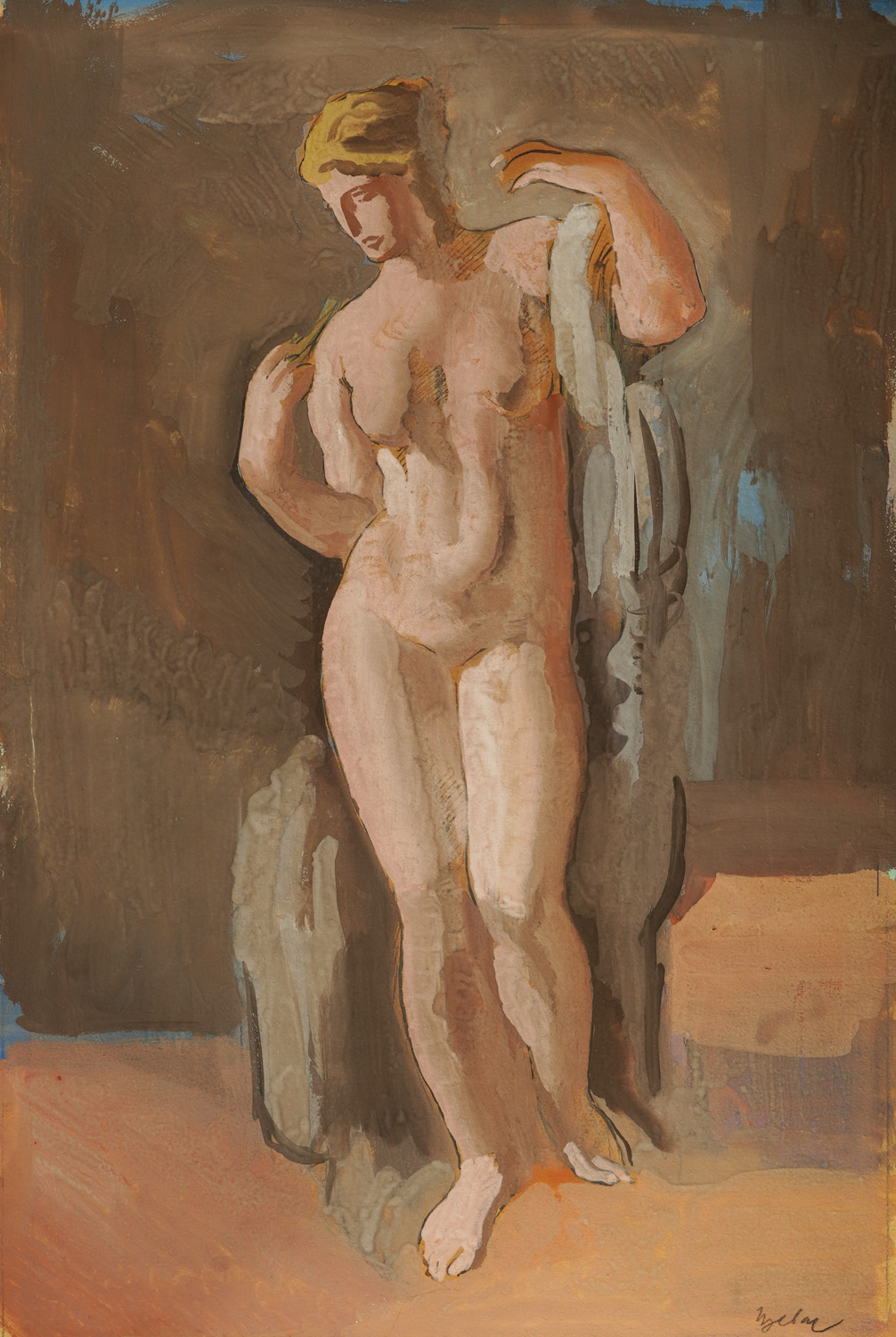 Milivoj Uzelac (Mostar, 1897 – Cotignac, 1977) left a lasting mark in Croatian art during the interwar period as a painter and printmaker. His art education began at the Temporary School of Art and Crafts in Zagreb in 1912, but he was soon expelled due to student rebellion. Not long after, World War I began and Uzelac was mobilized. After some time at the front, he successfully evaded military duty and from 1915 he educated himself in Prague. He familiarized himself with constructivism, fauvism, cubism, Dadaism, expressionism, and developed a fascination with the works of Paul Cézanne. Upon his return to Zagreb, he brought with him impressions of cosmopolitan innovations and exhibited at the Spring Salon, the most significant modernist manifestation of the 1920s in these regions. Despite rarely visiting his homeland, he maintained contacts and his works were regularly exhibited. He remained in France until the end of his life, occasionally escaping from hectic Paris under the Provençal sun that inspired many artists. From 1930, when he met Rosemarie de La Rayére, his constant model and life partner, he more often retreated to Provence. During this period, Uzelac created in the spirit of neoclassicism, enlightening the color palette and bringing a sense of ease and airiness to his works. In such Provençal settings, Uzelac created works like A Classical Act. This act carries strong mythological connotations, where the wife-model becomes an embodiment of Aphrodite herself. The balance of simultaneous movements of the figure is of an antique nature in its core, as well as its plasticity and volume. Through Uzelac's Classical Act, the living figure becomes a channel for conveying the same transcendental beauty that inspired ancient sculptors centuries earlier.