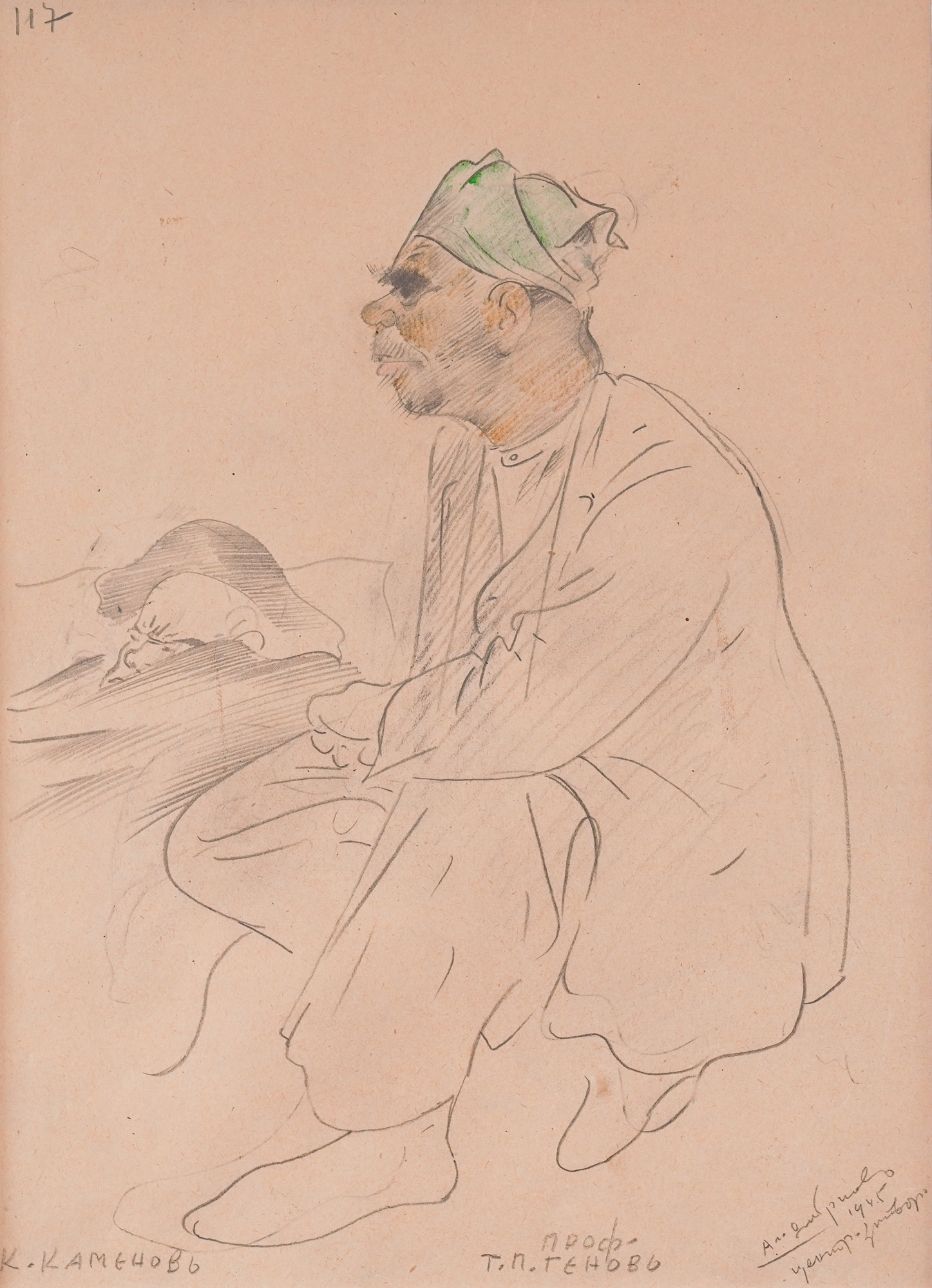 signed, dated and inscribed at the bottom right, with pencil, "Al. Dobrinov, 1945, central. prison"; named at the bottom left and bottom middle, with pencil, "K. Kamenov, Prof. G. P. Genov"