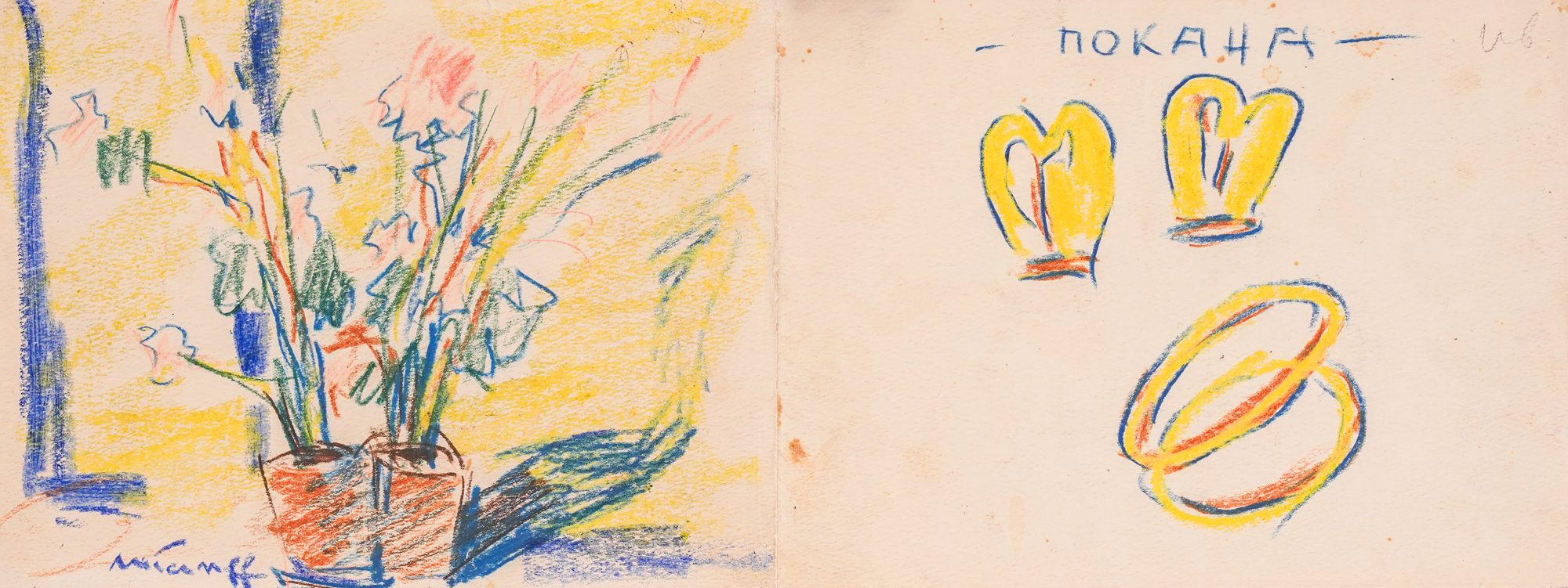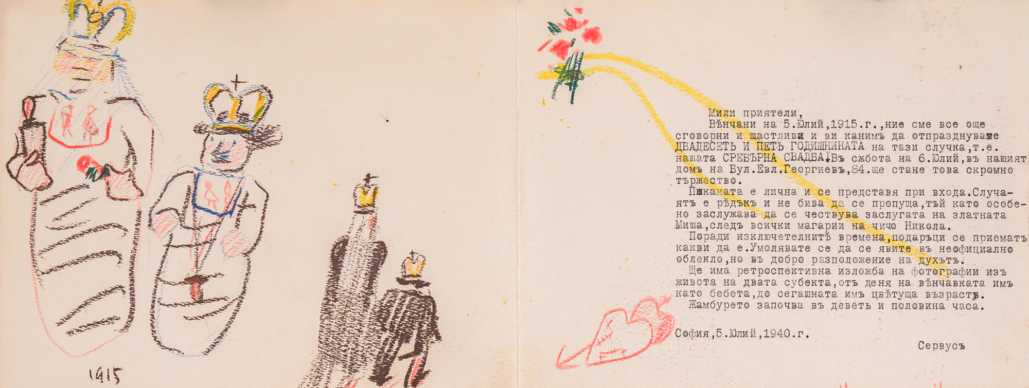 On July 5, 1915, 23-year-old Nikola Tanev married the teacher Dimitria Georgieva-Misha. Together, the Bulgarian artist traveled around the country, sharing intimate moments while exploring and touring their homeland. Their marriage lasted until the end of Tanev's life, and in 1940, the couple celebrated their silver anniversary. On this occasion, Nikola Tanev hand-painted the invitations for the soirée, and the presented lot is one of them. With it, the artist invited his guests to his home on 84 Evlogi Georgiev Blvd, where an exhibition of photographs from the lives of the newlyweds was also prepared. The pastel drawings on the invitation depict humorous moments from their wedding, giving it a decorative and playful look. The celebration took place on July 6, 1940.