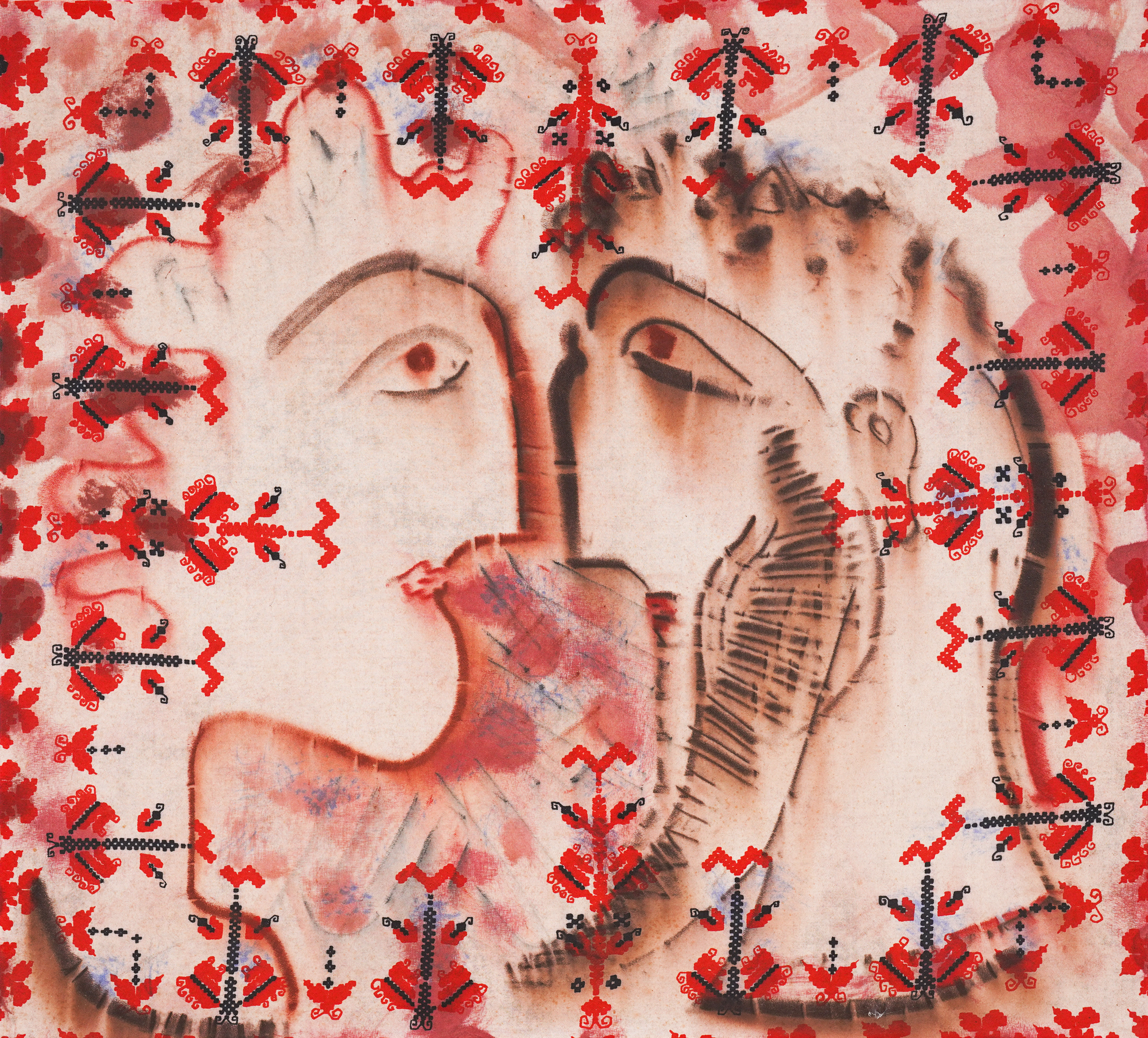 Dimitar Kazakov–Neron is one of the most unique artists in Bulgarian art. His work continues to surprise us with its bold and innovative solutions. The artwork "Couplee's Love" is extremely characteristic of the artist's style. In his preferred square format, the artist places two portrait images of a man and a woman in profile, facing each other. A strong emotional connection is created between the two figures, as they are depicted very close, and their gazes merge. The two figures are unified and connected, like the two halves of an apple, forming a whole with symbolic meaning. The silhouettes are in the characteristic style of Dimitar Kazakov–Neron. Throughout his creative journey, the artist remained deeply connected to the land and our traditional culture. He creates a magical world in which memories from his native village Tsarski Izvor, myths and legends from national folklore, and projections of ancient cultures and civilizations intertwine. Without hiding his affinity for Orthodox iconography, he draws inspiration from the art of the Etruscans, Mycenae, Persia, and Iran. He writes: 'The distance from the Kazanlak tomb to the image of Desislava (in Boyana Church) is not great. This distance, covered with millennia of archaeological layers, is my idol and my inspiration.' (From a letter in 1979 to Aksinia Djurova, 'The Myth of Dimitar Kazakov Neron,' 2003). Ancient civilizations inspire him, and this is evident in his works, which always carry a breeze from the past. They are organically connected with mythology and tradition. In this case, the motifs on the machine-printed canvas, on which the silhouettes are painted in a single breath, are traditional. It is the contrast between these emotional figures, entirely in the spirit of his work, and the motifs from traditional Bulgarian embroidery that make the composition 'People's Love' so extravagant and memorable. The title "Couple's love" also brings a pleasant touch of humor and leaves us contemplating the depths of national tradition. Similar images, filled with expression, can be found in his attempts on ceramic panels, which he worked on in 1988 at the 'Troyan Ceramics' factory in Troyan, at the invitation of the artist Tsvyatko Dochev. Ninety-five of them are displayed in the 'Kazakov Donation' at the Architectural-Historical Reserve 'Varosha,' in Lovech. (S.N.)