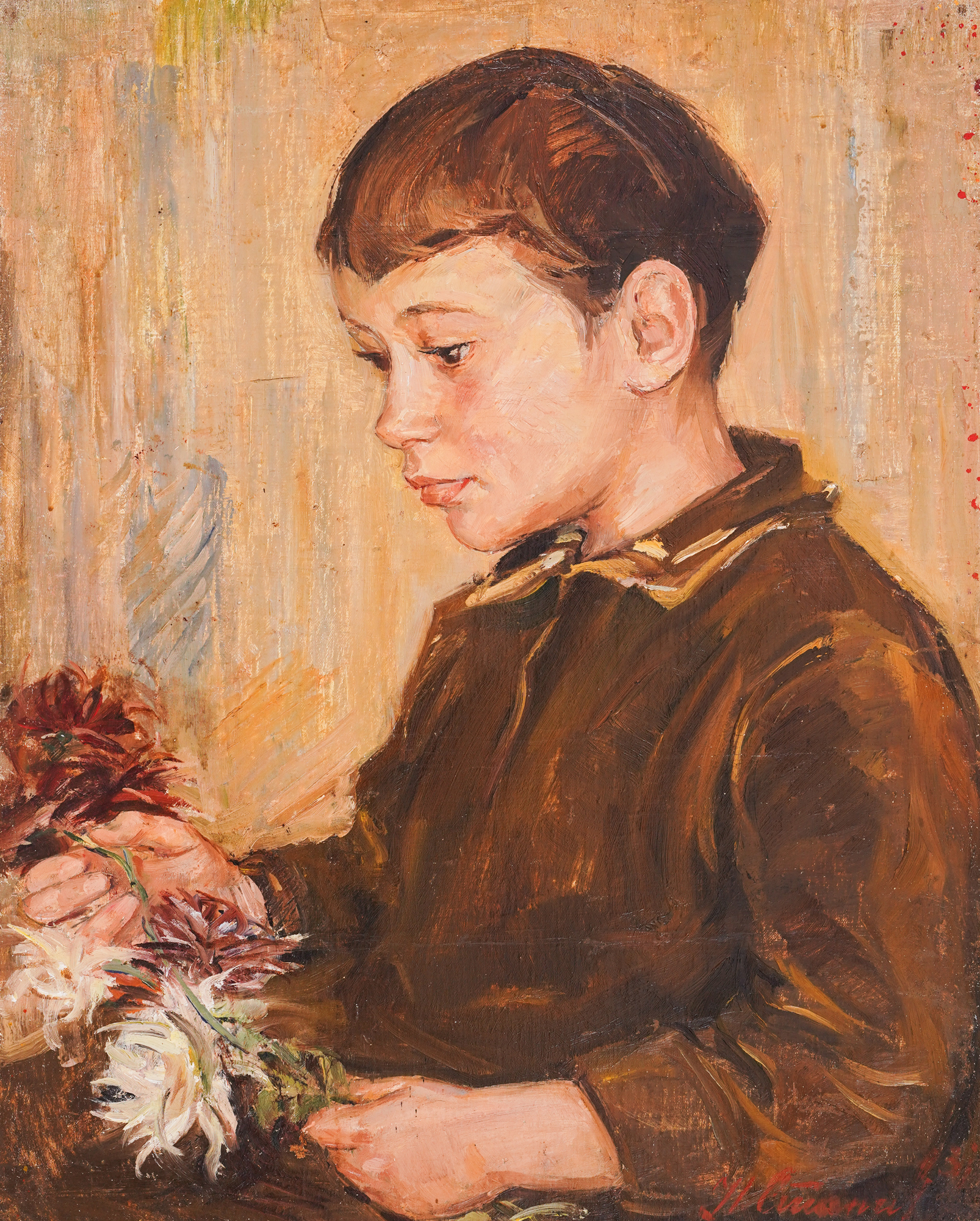 The artist Nyagul Stanchev comes from an old Karlovo family, which also produced two other great Bulgarian artists – one is his father, Hristo Stanchev (1870-1950), who is remembered in the history of Bulgarian art for his painting "On the Field" from 1936. The other is Genko Genkov, whose father was a cousin of Nyagul Stanchev. Nyagul Stanchev was born in 1900 in Plovdiv to the family of Hristo and Olga Stanchev. With the support of his father, who is remembered by his descendants as a very noble person, the young Nyagul naturally turned to art. He graduated in 1925 from the Sofia Academy of Arts with a degree in “Painting” under Professor Nikola Marinov and Professor Nikola Ganushev. He worked in the genres of portrait, landscape, and figurative composition, particularly in the area of realistic landscape – a key focus for artists of his generation. His entire creative and life journey took place in Plovdiv, where he died in 1964. The artist’s overall body of work follows the traditions of classical realistic painting – portraying old Bulgarian towns, lyrical natural landscapes, but most impressively, his portraiture. He created portraits of his father, Hristo Stanchev, Tsanko Lavrenov, and other notable personalities. However, his portraits of children are the most emotionally charged and finely psychological part of his work. "Portrait of a Boy" is a brilliant example of a masterfully crafted portrait, built sparingly, with a highly accurate depiction of the facial features. The child has beautiful, well-defined features – large, thoughtful eyes, slightly raised eyebrows, a snub nose, and expressive lips. The complex psychological state of the child is captured – holding three chrysanthemums, but his gaze is not directed at them. Instead, it is turned inward, towards a memory and a deep emotional experience. A moment of solitude is caught, where the boy is alone with his thoughts – likely not easy for his young age. And this is why this portrait evokes sympathy, empathy, and concern. "Portrait of a Boy" contains all the best qualities of the classical portrait within the traditions of European painting. Nyagul Stanchev’s works are an exceptional rarity in the art market, especially such an exceptional children’s portrait. (S.N.)
