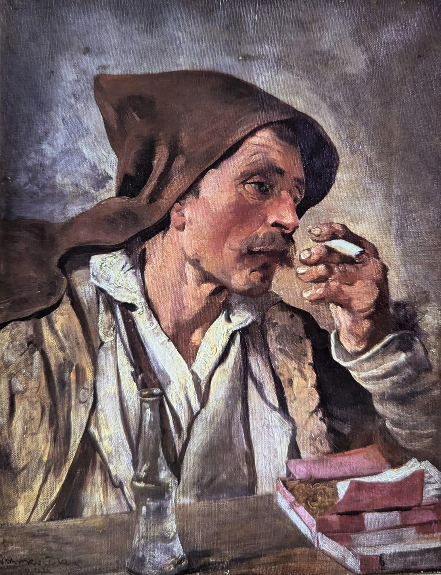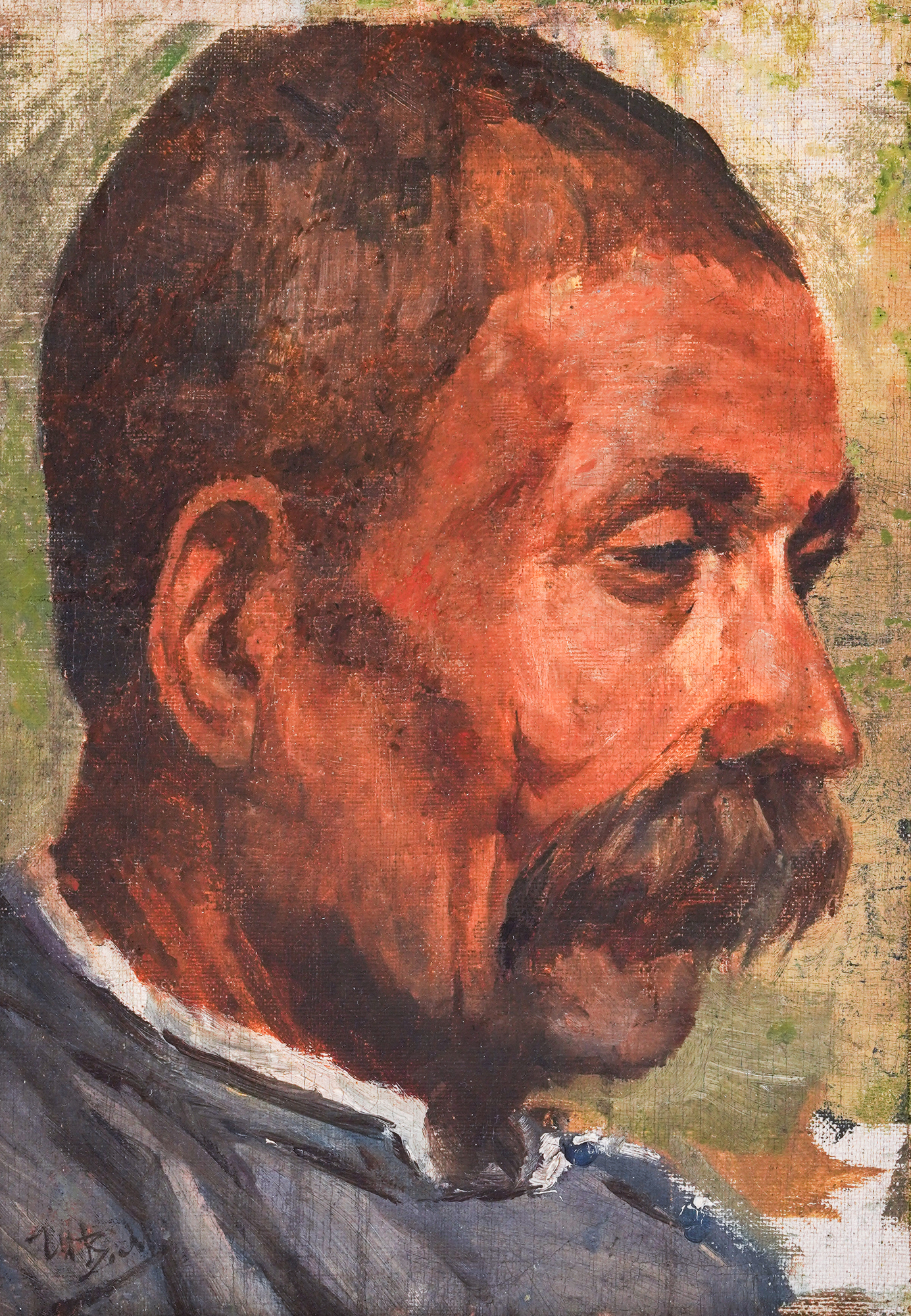 The complex multi-figure compositions created by Ivan Mrkvička, such as “Zadushnitsa” (1890), “Shopko Horo” (1892), “Rachenitsa” (1894), etc., include many characters, each possessing individual facial features, emotional states, characteristic costumes, and roles within the overall composition. In order to create these impressive works, the artist made dozens of sketches, studied the character types, costumes, ethnographic features of the region, and the specifics of the interior. "Portrait of a Merchant” is likely a preparatory sketch for the multi-figure composition “Rachenitsa”—the most famous Bulgarian painting, highly valued by its contemporaries and one of the highest-paid works in the collection of the National Gallery. The scene is set in a Shop tavern with a dirt floor and a low wooden ceiling, featuring a variety of male figures in characteristic costumes. There are preserved sketches of the wooden ceiling that the artist developed in advance. The artist's aim was to study a specific face, state, and type. The man has dark long mustaches, a dark skin tone, and short hair. His expression is pensive, and his gaze slightly worried. The same facial features and characteristic Albanian traits are captured. In “Rachenitsa,” Ivan Mrkvička has captured the specific atmosphere that the people and the place bring, the lightness of the fast Shop dance—the rachenitsa—and the convincing image of the central character, whose prototype was James Boucher. The Shops are an object of Mrkvička's study, and he clearly approaches them with sympathy, which he has successfully conveyed in his painting. The intimate canvas "Portrait of a Merchant" is of exceptional value for any collection because it shows the history of part of this famous painting. (S.N.)