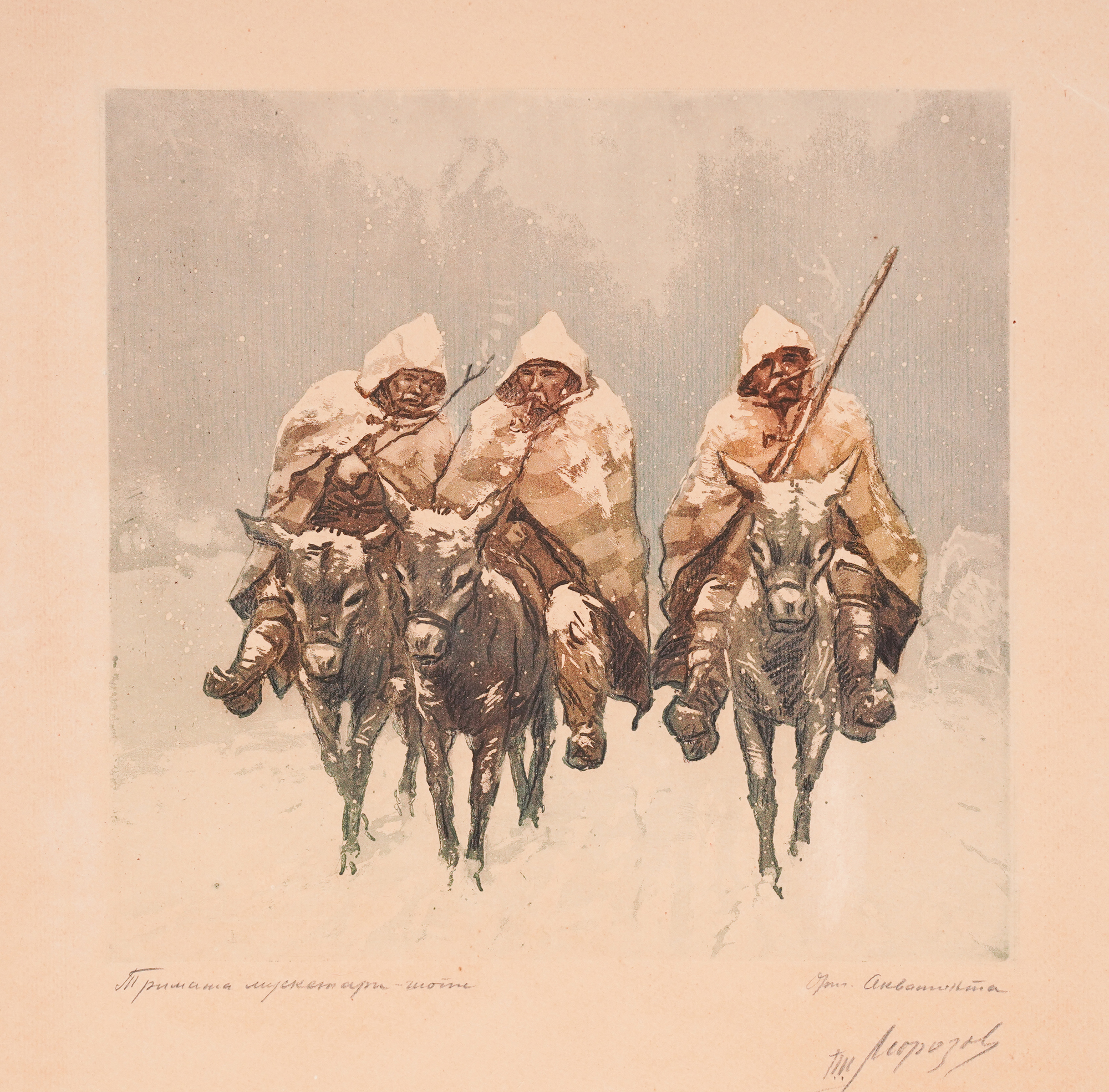 signed, noted and dedicated bottom right, in pencil, "P. P. Morozov, orig. aquatint"; titled bottom left, in pencil, "The Three Musketeers - Shopi"