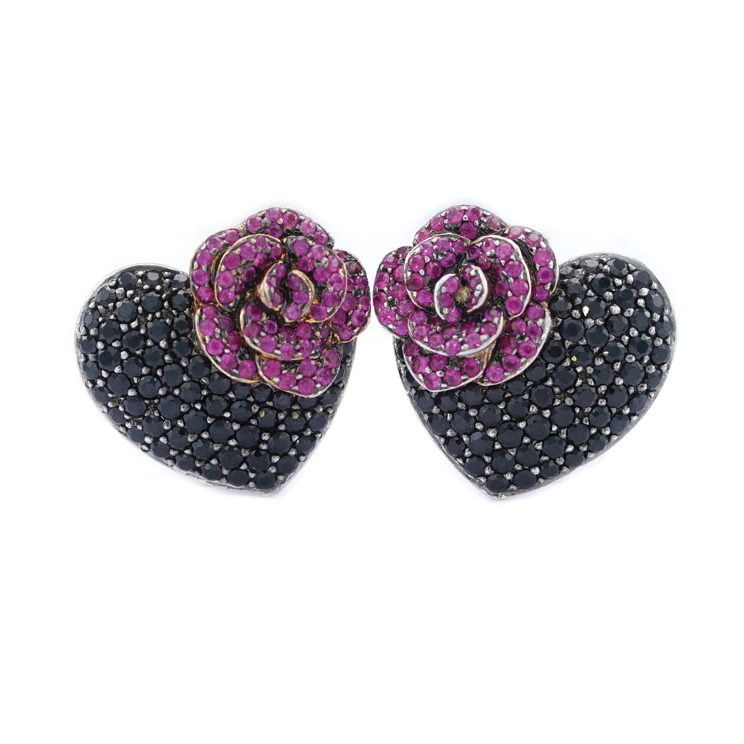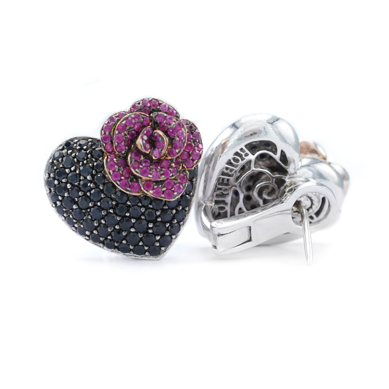 46. A pair of Roberto Coin earrings in two-tone gold, decorated with black sapphires and rubies