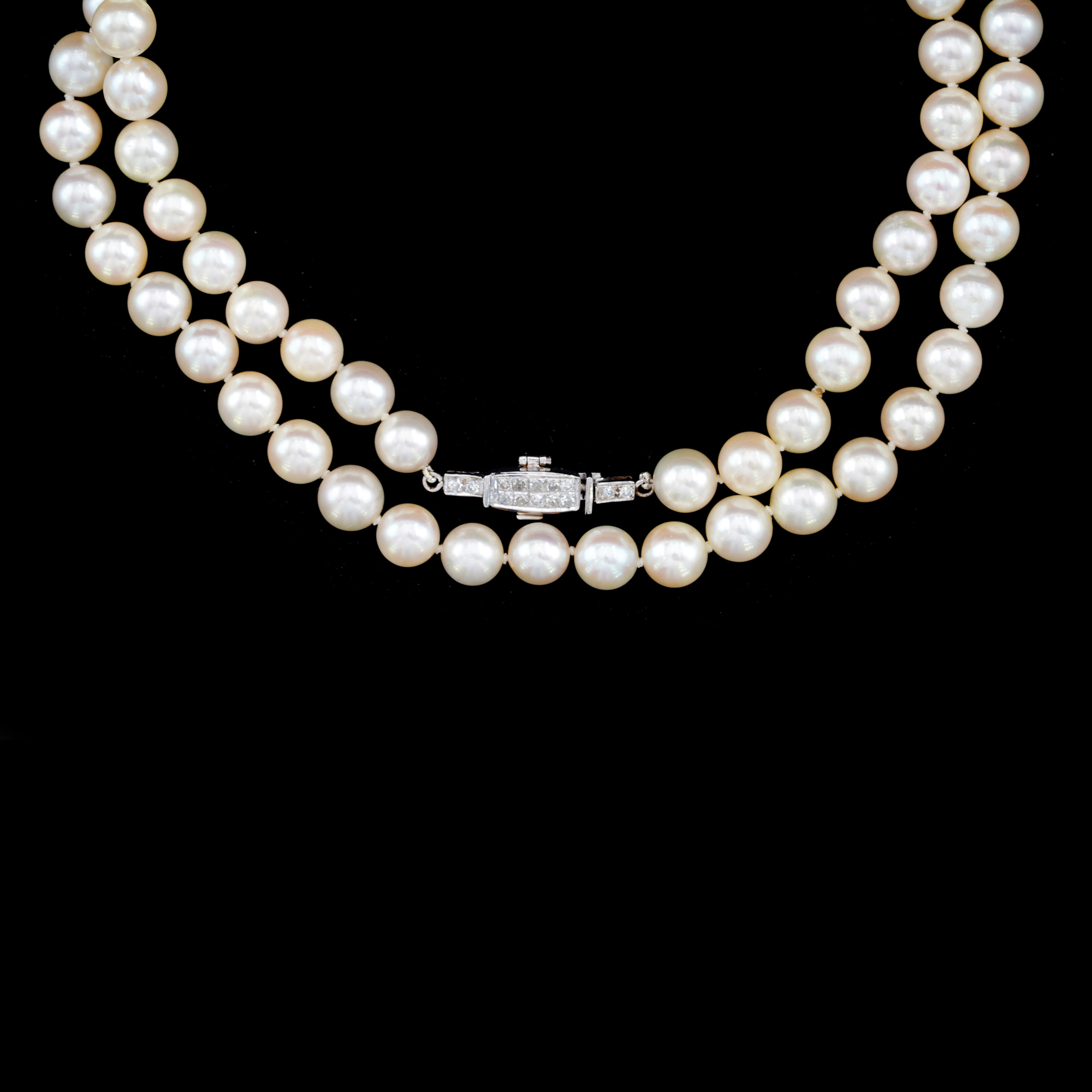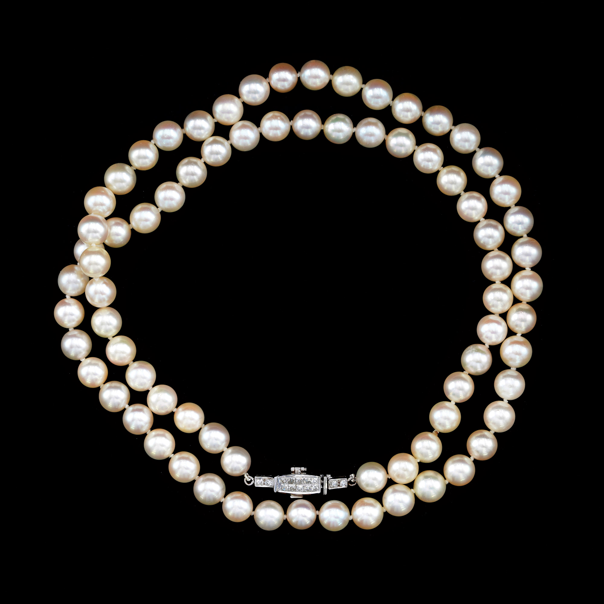 51. Akoya Pearl Necklace with a White Gold Clasp, Decorated with Diamonds