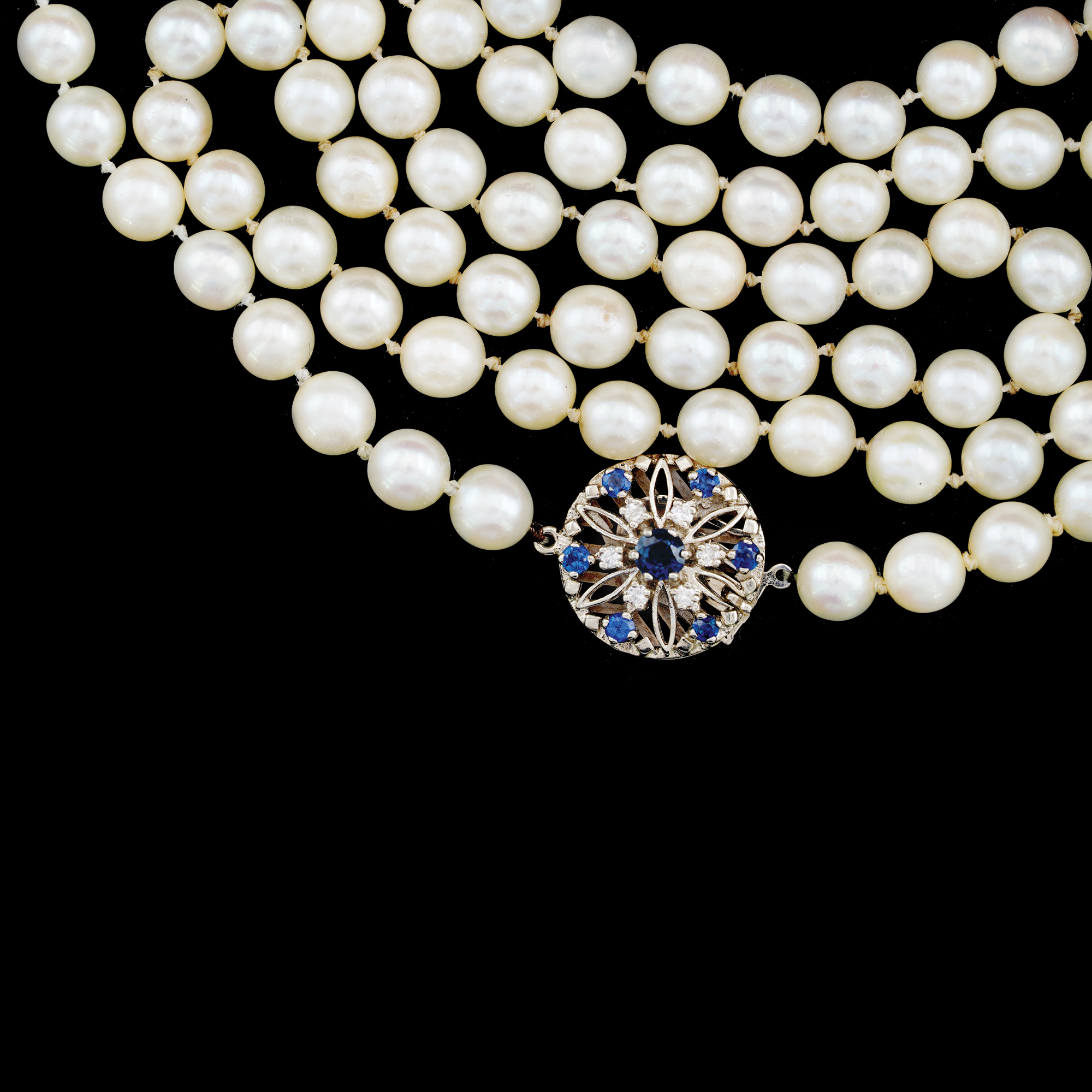 5. Akoya Pearl Necklace with White Gold Clasp, Decorated with Sapphires and Diamonds