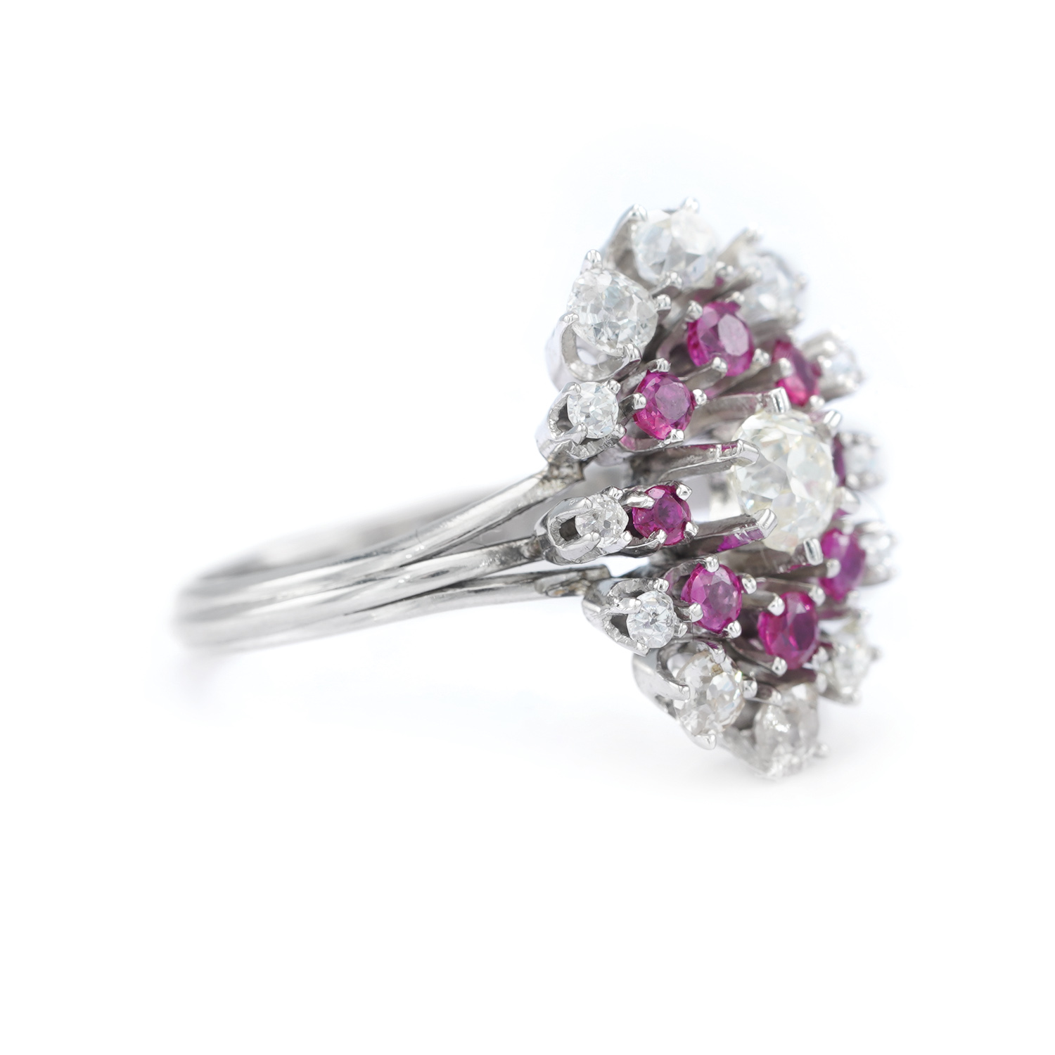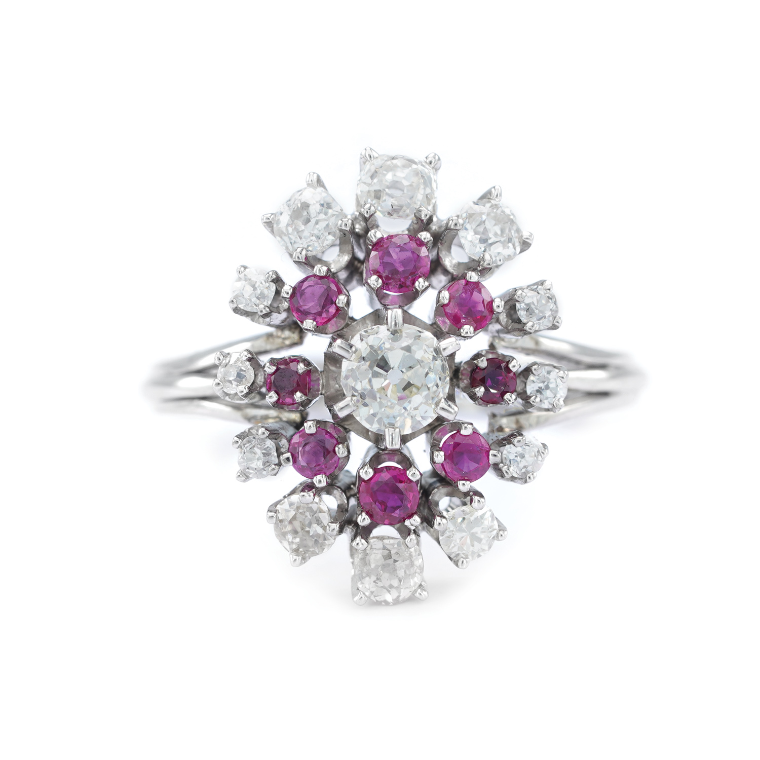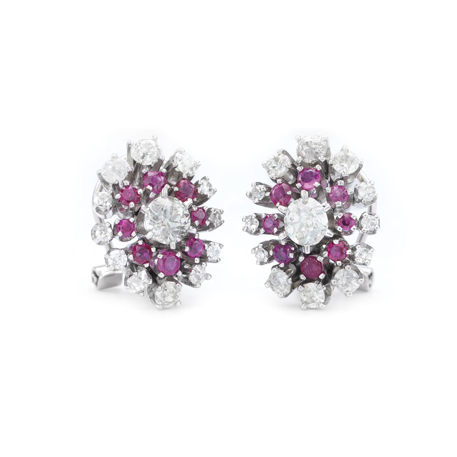 24 rubies, round faceted, approx. 1.00 ct, red color, clarity SI-heavily included; 2 diamonds, old mine cut and 1 diamond, European cut, approx. 1.25 ct., color K-L, clarity SI1-I2; 36 diamonds, old mine cut and single cut, approx. 2.20 ct., color H-L, clarity VS1-I2