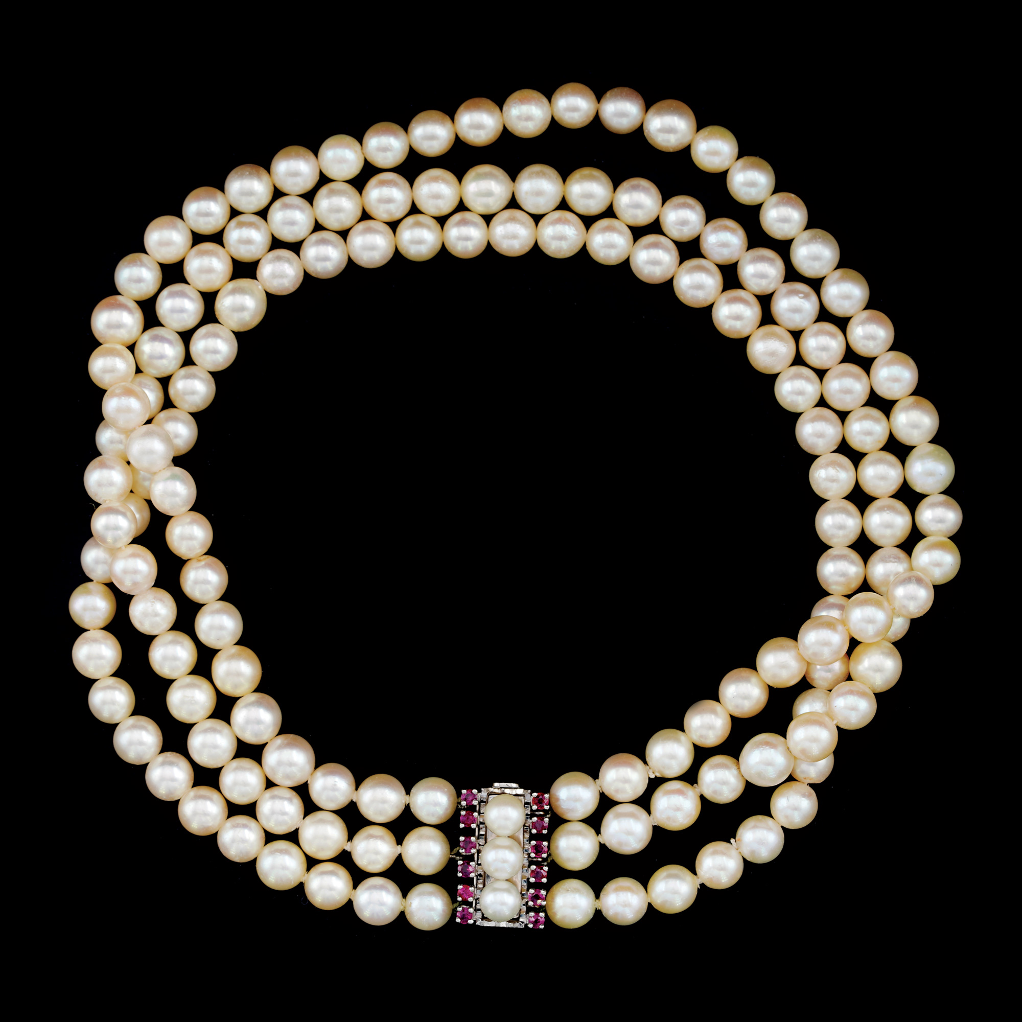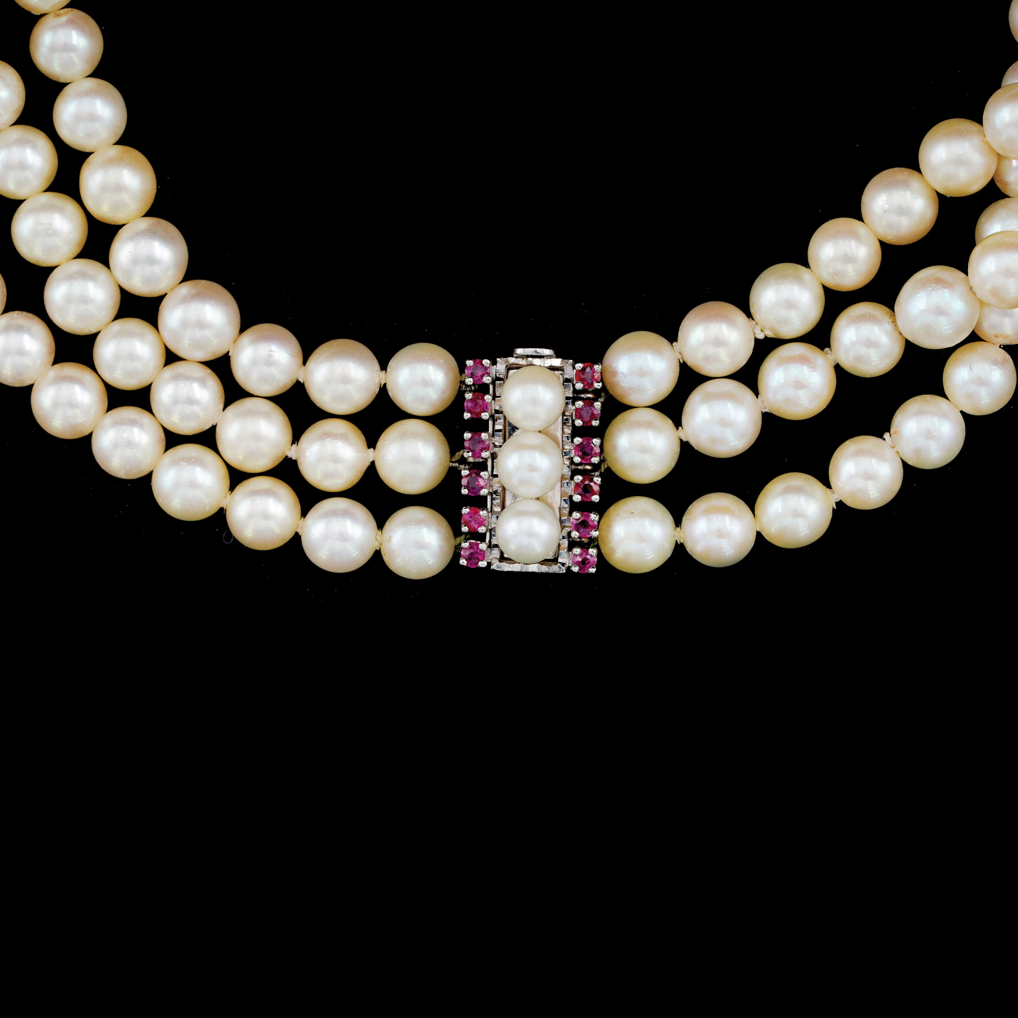 49. Three-row Akoya pearl necklace with ornamental white gold clasp with pearls and rubies