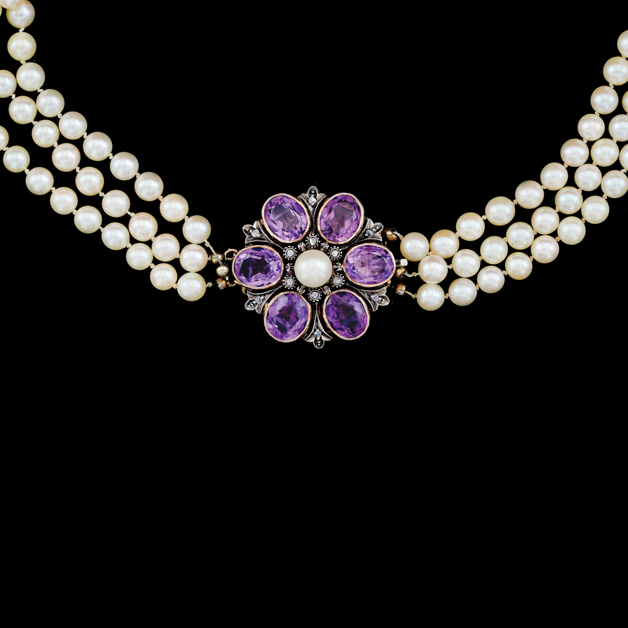 4. Three-strand Akoya pearl necklace with silver and rose gold clasps, decorated with amethysts and diamonds