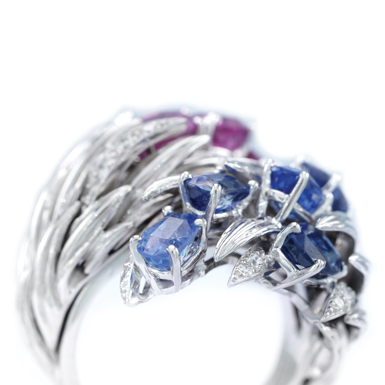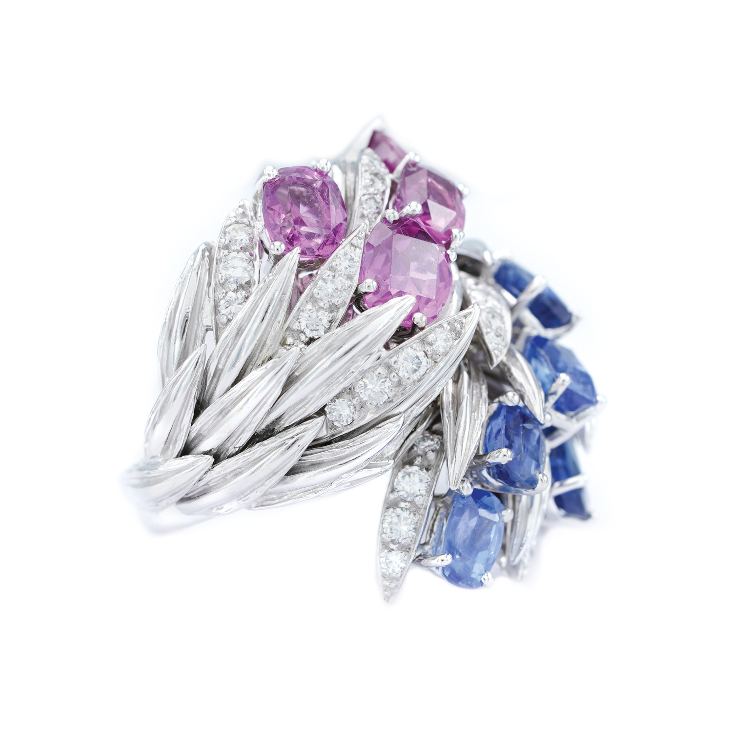 56. White gold ring, adorned with diamonds, blue and pink sapphires