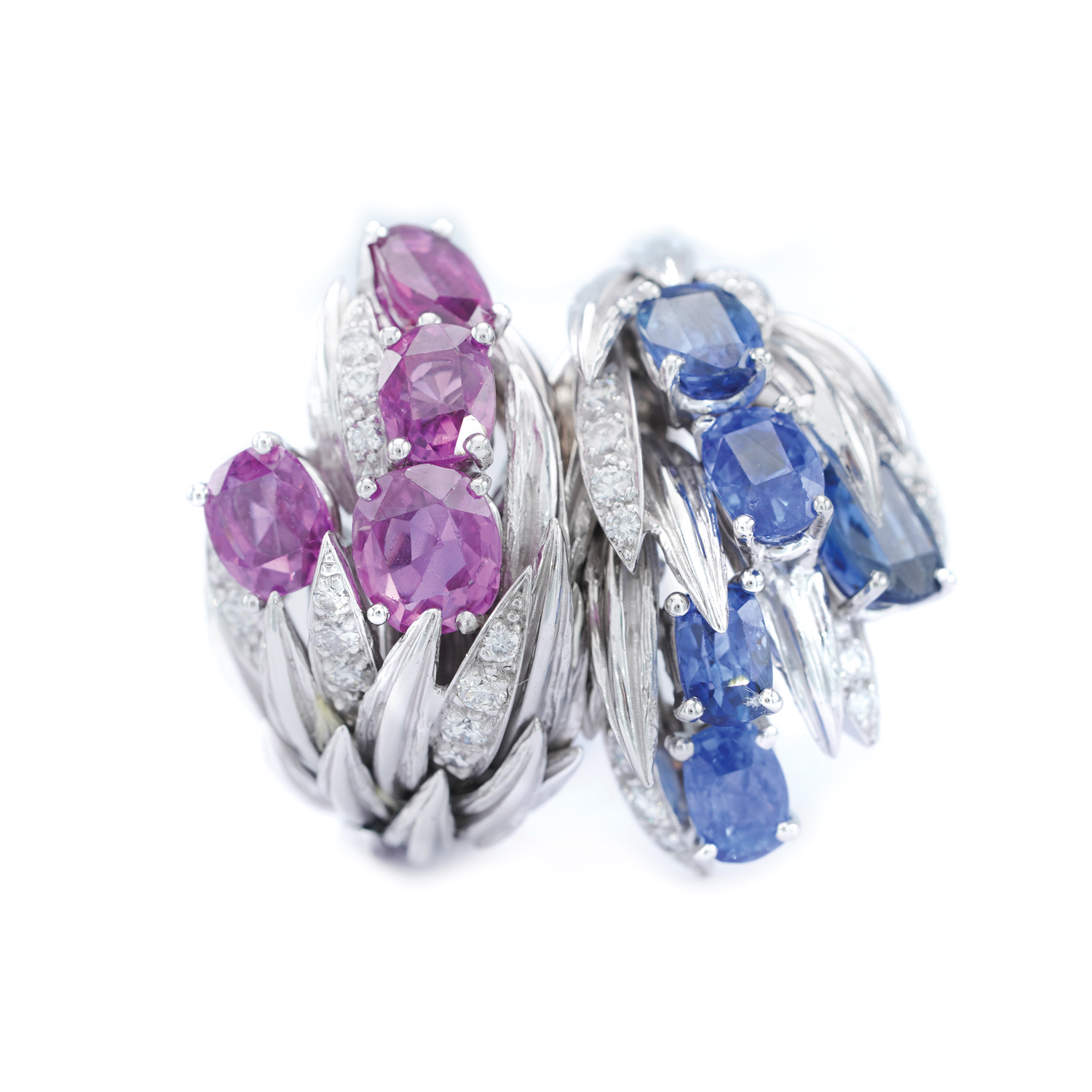 29 diamonds, round brilliant cut, approx. 0.66 ct., color F-G, clarity VS; 5 sapphires, rectangular cushion cut, approx. 4.70 ct., blue color, clarity SI; 4 sapphires, rectangular cushion cut, approx. 5.20 ct., pink color, clarity SI.