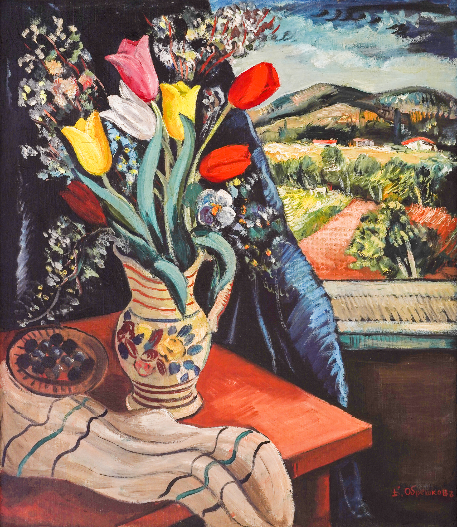 Bencho Obreshkov was born on April 27, 1899 in Karnobat. In addition to being a student at the Art Industrial School, Obreshkov is also a graduate of the Dresden Art Academy. His work undoubtedly reflects an academic-classical style of execution, indicative of a European manner. His favourite genres are - still life, landscape, and portrait, and his preferred technique is oil painting. The still life was created in the 1930s. The artwork captures the quiet intimacy of a well-lit room, central to which is a meticulously detailed ceramic vase with flowers, executed with impressive realism. The vase with flowers encapsulates the delicate interaction between nature, shape, and color, serving as an eternal homage to beauty in its simplest form. Another interesting aspect of the work is the so-called phenomenon - "picture in a picture". Behind the vase with flowers, a window is discovered, revealing a tranquil pastoral scene of fertile fields under a sky drenched in the warm hues of the setting sun. The light in the picture is masterfully balanced as it is delicate and natural, filtering through the window, casting gentle shadows and accents that lend a depth of dimension to the scene. The still life is proof of Obreshkov's ability to capture the ephemeral beauty of nature and the enduring allure of art. At the time the artwork was created, Bencho Obreshkov visited Belgrade on the occasion of his participation in a large-scale Bulgarian painting exhibition, along with other famous artists like Sirak Skitnik, Dechko Uzunov, Nikola Marinov, and Boris Denev. (A.MA.)
