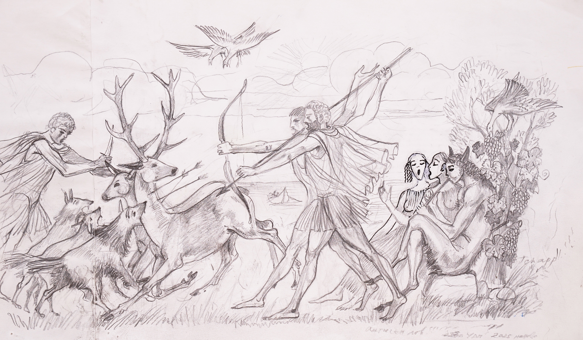 signed, titled and dated lower right, in pencil, "Tchapp!!!!!, античен лов, дядо Чап, 2025 наново“