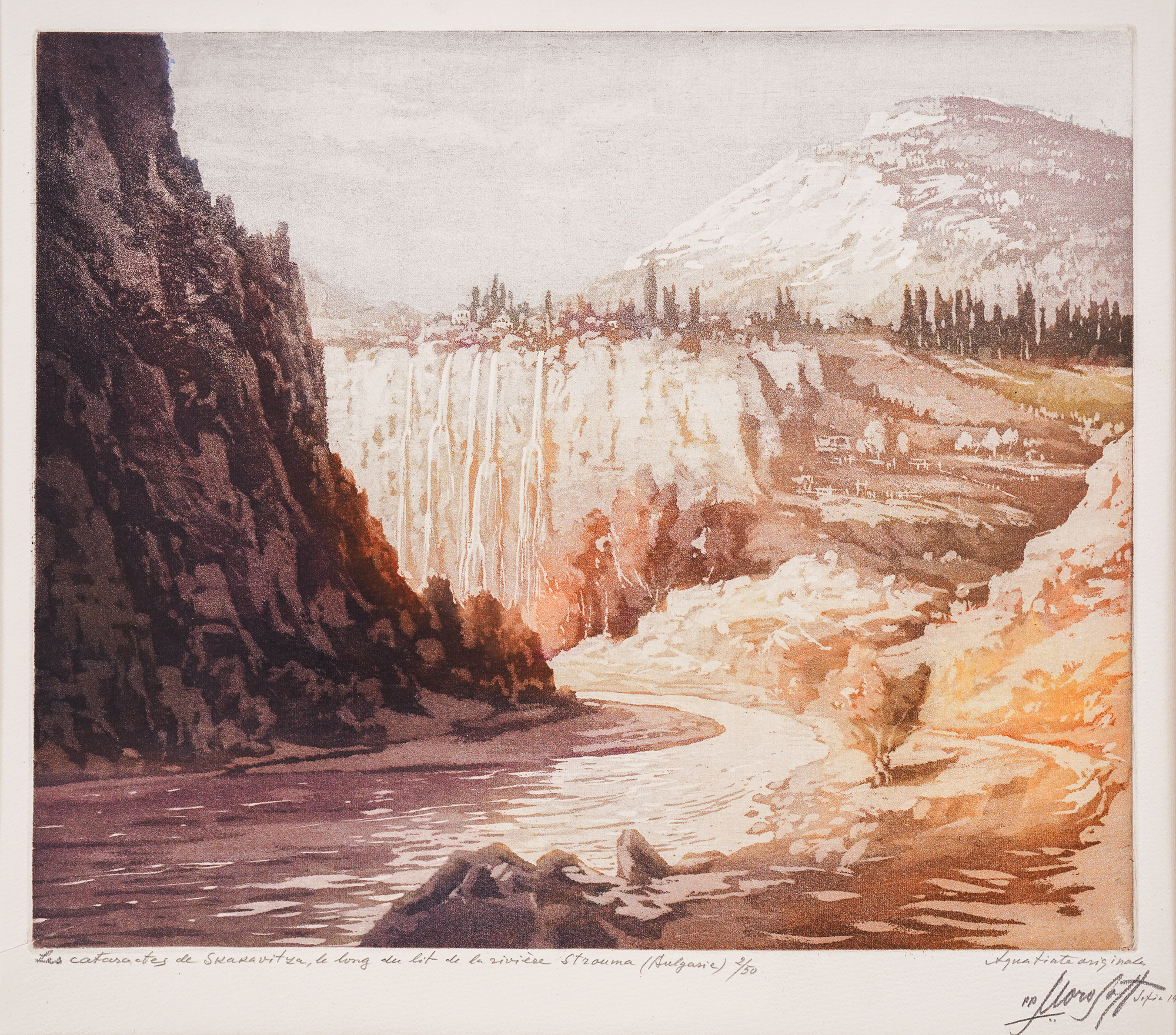 signed, dated, located and noted bottom right, in pencil, "P. P. Morozoff, 1936, Sofia, Aquatinte originale"; titled and numbered bottom left, in pencil, "Les cataractes de Skakavitza, le long du lit de la riviere Strouma (Bulgarie), 2/50"