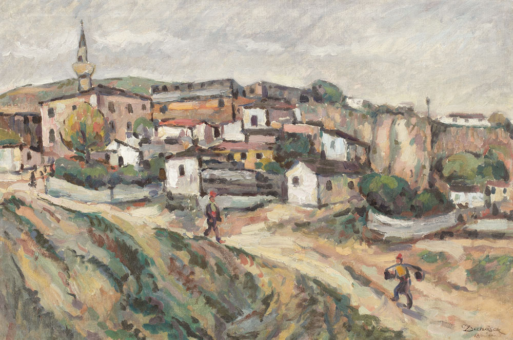 Artist reprezentativ al picturii româneşti din perioada interbelică, cu o activitate ce cuprinde 50 de ani de creaţie a unei arte de interpretare a curentelor impresionism şi neoimpresionism, ale căror inovaţii le va pătrunde în perioada studiilor de la Paris, Nicolae Dărăscu s-a consacrat în istoria artei româneşti drept un original peisagist. Operele sale, căutări ale unor sinteze între spontaneitatea primei impresii transpusă în culoare (impresionism) şi tendinţa cézaniană de conturare a formelor, sunt opere ale bucuriei în culori ale piesajului, ale mişcătoarelor marine, a domoalelor dealuri înverzite. Încă de la început, genul peisajului apare elaborat în doar câteva scheme compoziţionale, pe care, cu mici schimbări, le va relua în decursul celor 50 de ani de activitate. Departe de a-i minimaliza capacitatea creatoare a artistului, această caracteristică îl va impune în peisajul artei româneşti prin forţa paletei cromatice şi a atmosferei mereu originale a marinelor din Veneţia, Chioggia, Delta Dunării sau Balcic. Dacă iniţial (1908-1920) peisajele lui Dărăscu dezvăluie rare armonii cromatice, obţinute prin acorduri între culorile primare şi complementare, perioada anilor 1920-1944 – ce corespund celei de-a doua perioade de creaţie dărăsciene – aduc o noutate în viziunea artistică a pictorului. Devenit reprezentativ pentru arta ţării sale, Dărăscu continuă să fie interesat de efectele coloristice ale luminii şi atmosferei, însă acum se observă şi o puternică preocupare pentru sublienierea formelor şi a volumelor în culoare. În alte cuvinte, stilului impresionist, Dărăscu îi apropie propria experienţă cu arta lui Cézanne, de stabilire a formelor, de construcţie a planurilor prin intermediul culorii, definindu-şi un stil personal şi un mod propriu de expresie. Anilor ’30 aparţin opere prin care Dărăscu se distinge poate cel mai inspirat interpret al frumuseţii şi pitorescului regiunilor dobrogene. Cu o paletă la fel de luminoasă dar lipsită totuşi de intensităţile cromatice specifice primei perioade de creaţie, geamiile, cafenelele turceşti, cartierele tătărăşti, oferă sentimentul unei linişti meditative, a unei împăcări şi calm. Ocrul cald al acestor peisaje atinge uneori o anumită materialitate diafană, artistul tinzând acum către un rafinament cromatic. Aceleaşi sentimente se desprind şi din opera „Peisaj din Balcic”, unde artistul a îmbrăţişat cu privirea întinderea largă a dealurilor cu case. Atras în mod irezistibil de frumuseţea locurilor dobrogene, Dărăscu subordonează peisajului prezenţa oamenilor şi activitatea acestora, iar casele, geamia, dealurile, potecile asumă rolul de personaje principale. (M.N.)