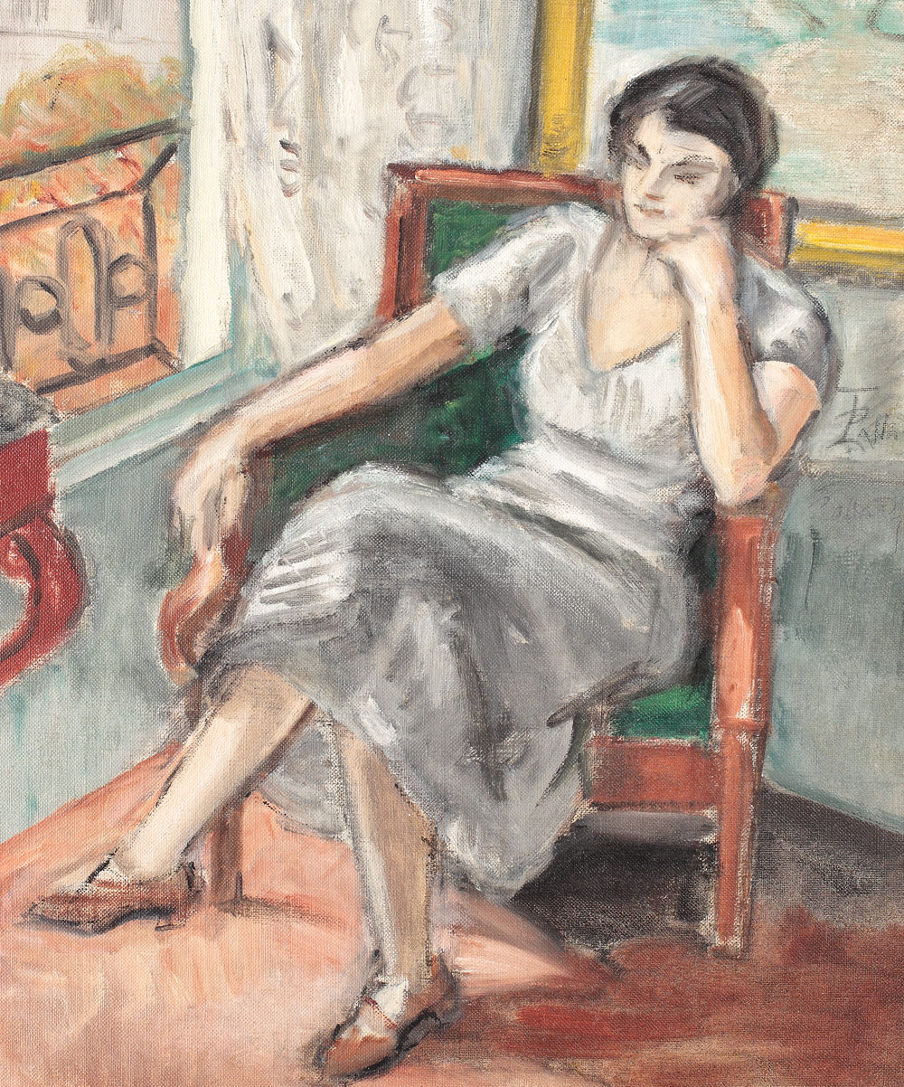 Pe 11 aprilie 1871, se năştea, la Iaşi, Theodor Pallady, primogenitul lui Iancu Pallady şi al Mariei Pallady (născută Cantacuzino), ambii descendenţi ai unor importante familii boiereşti. La vârsta adolescenţei, împotriva voinţei tatălui, ce-i pregătise o carieră în inginerie, Theodor Pallady ia drumul Parisului, unde frecventează atelierul pictorului Edmond Aman Jean în perioada anilor 1890-1892. Filiaţia cu familia Cantacuzinilor îi oferă ocazia de a-şi petrece timp însemnat în casa pictorului francez Puvis de Chavannes (soţul Mariei Cantacuzino), manifestându-şi totodată un interes major şi pentru Muzeul Luvru, unde îşi va exersa talentul în preajma Mona Lisei şi a operelor marilor maeştri ai renaşterii italiene. Din anul 1892, Pallady începe să frecventeze atelierul lui Gustave Moreau, unde va fi coleg cu Henri Matisse, Georges Rouault, Manguin, Evenopoel, Camoin, Guérin, Lehman şi alţii. De Matisse îl leagă o profundă prietenie, mai ales după anii ’30. Cei doi poartă o lungă corespondenţă, până în anul 1944, dezbătând, în controversă cu artistul francez, o serie de probleme estetice şi legate de importanţa desenului în realizarea unei opere de artă. În anul 1895 este admis la Şcoala de Belle Arte din Paris. Expune pentru prima dată în cadrul Pavilionului României de la Expoziţia Universală de la Paris, din anul 1900, mai multe lucrări, între care „L’enfant prodigue” primeşte menţiunea onorabilă. După mai multe călătorii de studii în Anglia, Spania, Italia, precum şi participări la Saloanele Oficiale, Salonul Naţional al artiştilor francezi, Societatea „Tinerimea Artistică”, în anul 1920, artistul deschide prima expoziţie personală, la Paris, la Galeria „Nunès et Fiquet”, cu 33 de lucrări (nuduri, flori, naturi moarte, peisaje, desene), al căror catalog este prefaţat, în mod elogios, de criticul Jean Royère. Pe toată durata şederii sale în Franţa, expune la Galeria „Marin-Bénézit” (Paris), Galeria „Eugène Blot” din Rue Richepanse (Paris), prezentată de contesa Anna de Noailles. Obţine, în anul 1926, „Marele Premiu Naţional de Pictură”. Numeroasele studii şi monografii ce i s-au dedicat deja din timpul vieţii indică aprecierea de care se bucura arta lui Pallady atât în ţară, cât şi Franţa în perioada interbelică. Trăind în Parisul modern, între 1917 și 1940, Pallady și-a clădit totuși cultura și întreaga capacitate de interpretare a formalului având la bază spiritul poetizant al scrierilor lui Baudelaire și al simbolismului literar și artistic, spirit pe care numai un oraș cosmopolit și rafinat îl putea crea. Astfel descoperim opera pictorului din această perioadă, o pictură intimistă, o poezie a interiorului și a familiarului, tradusă totuși antagonic în opere ce trădează o atmosferă de neliniște, misterioasă pe alocuri, chiar melancolică. Astfel ne explicăm dispariția sau mai bine zis raritatea exteriorului în creația palladiană, peisajul fiind mult mai puțin abordat decât personajul (nudul) în interior sau natura statică, medii mult mai susceptibile unei interpretări progresiste a acelei fărâme de simbolism. Aici intervine spiritul lui Pallady, ce își identifică în spațiul familiar (conacul, atelierul, malul Senei din apropierea locuinței din Place Dauphine) uneltele ce ar facilita oglindirea sa în creația picturală. De aceea critica a identificat mereu spiritualitatea cu care temele preferate (natura statică și personajul feminin) de Pallady sunt abordate și încărcate de un lirism tipic, aristocrat. Femeia ce se odihnește pe fotoliul de lângă fereastră, iminența figurativului, prin amintirea priveliștii spre Place Dauphine, poziția gânditoare a personajului, dar mai ales maniera atât de tipică de interpretare a formei oferă operei de față o încărcătură de depășește simpla apariție naturală a modelului ce stă la pozat. Pânza vine să întregească un ciclu omogen conceput de Pallady în prima jumătate a deceniului patru al secolului trecut, ciclu oferit publicului bucureștean în 1935, în urma expoziției personale. (I.P.)