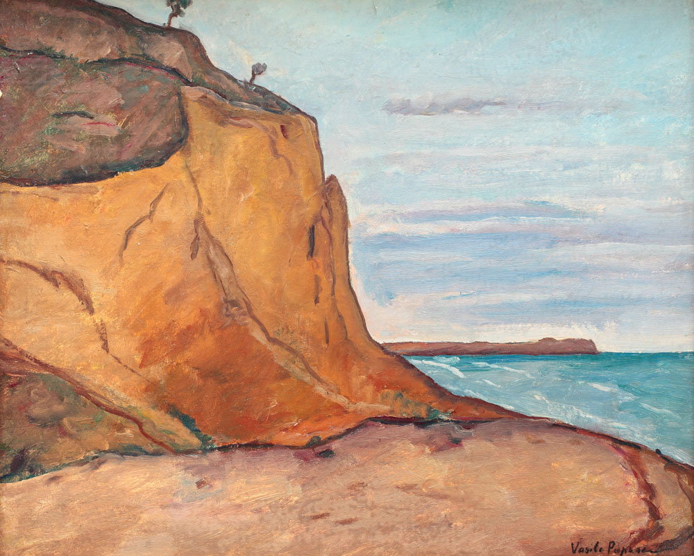 Sfârşitul anilor ’20 îl situează pe artistul Vasile Popescu alături de nume reprezentative ale artei româneşti, în cadrul unei importante expoziţii (Exposition d’Art Roumain, Congrès de la Presse Latine, 30 septembrie - 1 octombrie 1927) organizate la Bucureşti, ce-şi propunea realizarea unui tablou al evoluţiei picturii româneşti moderne, de la începuturile acesteia până la cele mai recente şi mai îndrăzneţe tendinţe afirmate. Aşadar, alături de titanii Lecca, Tăttărescu, Aman, urmaţi de mai marii Grigorescu, Andreescu, Luchian, de clasicii Pallady, Petraşcu, Şirato, Ressu, Iser, Steriadi, Tonitza, pe simezele expoziţiei îşi câştigaseră un binemeritat loc şi mai tinerii Lucian Grigorescu, Henri Catargi, Marcel Iancu, M.H. Maxy, Iorgulescu-Yor, Vasile Popescu, Corneliu Michăilescu şi alţii. Prezenţa lui Vasile Popescu, la sfârşitul deceniului al treilea, în acest ansamblu de prestigiu, ne oferă o indicaţie clară cu privire la autoritatea pe care o acumulase arta pictorului, când acesta se afla doar la început de drum, având în urmă numai o expoziţie personală şi mai multe participări la Salonul Oficial. Acestei perioade i se integrează şi opera prezentă, un peisaj pictat la Balcic, ce ne îngăduie să observăm senzaţiile pe care i le provoacă artistului contactul direct cu natura. În faţa infinitei bogăţii de forme şi culori pe care acest spaţiu i le oferea, Vasile Popescu încearcă să introducă o anumită ordine în construcţia planurilor, structurând compoziţia cu ajutorul liniilor precise ce închid forme dintre cele mai simple, delimitând astfel suprafeţele. Dominată de culori calde – de la pământuri de Siena până la oranj - susţinute de o pastă uşor consistentă şi zone mai transparente de albastru palid pentru mare şi cer, opera „Faleză în Balcic” se impune prin armonizarea reuşită şi expresivitatea întregului ansamblu. (M.N.)
