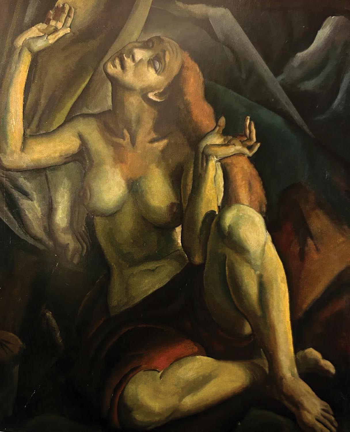 Jerolim Miše (Split 1890. – Split 1970.) hrvatski je slikar i likovni kritičar. Školovan prvo u rodnom Splitu zatim na akademiji u Zagrebu i umjetničkim školama u Rimu i Firenci. Bio je blizak društvu Medulić, djelovao u okviru Proljetnog salona od kojega se potom odvaja i postaje svojevrsni duhovni pokretač Grupe nezavisnih umjetnika (1921–27) koja broji autore poput Lj. Babića, Z. Šulentića, V. Varlaja i I. Meštrovića. Nakon vojske 1915.-1917. Miše je radio kao učitelj crtanja u gimnazijama u Krapini, potom u Brodu na Savi i na koncu u Obrtničkoj i u ženskoj gimnaziji u Zagrebu. Rano razdoblje Mišina slikarstva karakterizirano je utjecajem ideja Nietzschea, Bergsona i Macha kao i aktualnim istraživanjima psihoanalize. U njegovom ranom slikarstvu prevladava težnja za suglasjem umjetničkog djela i duševnim stanjem, stavljajući sličnost sa slikanim predmetom u drugi plan. Takvo razumijevanje umjetnosti se mijenja tijekom 1920-ih kada se Miše okreće realističkim polazištima, usredotočuje na vjernost slikanog predmeta i pridružuje Grupi nezavisnih umjetnika. Tijekom 1930-ih Miše se, tada djelujući u okviru Grupe trojice (1930–35), okreće neriješenom pitanju nacionalnog izraza slikajući prizore srednje i južne Dalmacije u duhu magičnog realizma. Krajem 1930.ih Miše postaje izvanredni, zatim redoviti profesor na akademiji u Beogradu, a od 1947. do umirovljenja predaje kao redoviti profesor na akademiji u Zagrebu. U razdoblju neposredno nakon II. svjetskog rata, Miše ostaje vezan za rodnu Dalmaciju sada slikajući pejzaže kao mjesto ljudskoga rada, pod utjecajem estetike socrealizma. Tijekom 1950-ih približava se asocijativnoj lirskoj apstrakciji i strukturiranom pejzažu, dok se 1960-ih vraća realističkim motivima Splita. Ulje na platnu velikih dimenzija pod nazivom Ženski akt signirano je u donjem desnom kutu. Središte prizora zauzima naga ženska figura smještena na podu između dva drvena stupa. Njezine podignute ruke, prislonjene uz stupove, vjerojatno su vezane izvan kadra, a njezina zlaćana kosa kao da vijori na vjetru protežući se u vis uz njezinu lijevu ruku. Mladolika djevojka nalazi se u gotovo apstraktnom, neprepoznatljivom prostoru. Ekspresivni potezi, pomalo uznemirujuća paleta, položaj tijela i izraz lica djevojke evociraju još uvijek prisutnu psihološku, ekspresionističku komponentu vidljivu u Mišinom ranijim radovima. Djela poput "Ženskog akta" (1921.), ističu njegovu usredotočenost na ljudsku figuru i emotivnu dubinu njegovih subjekata i prizora.