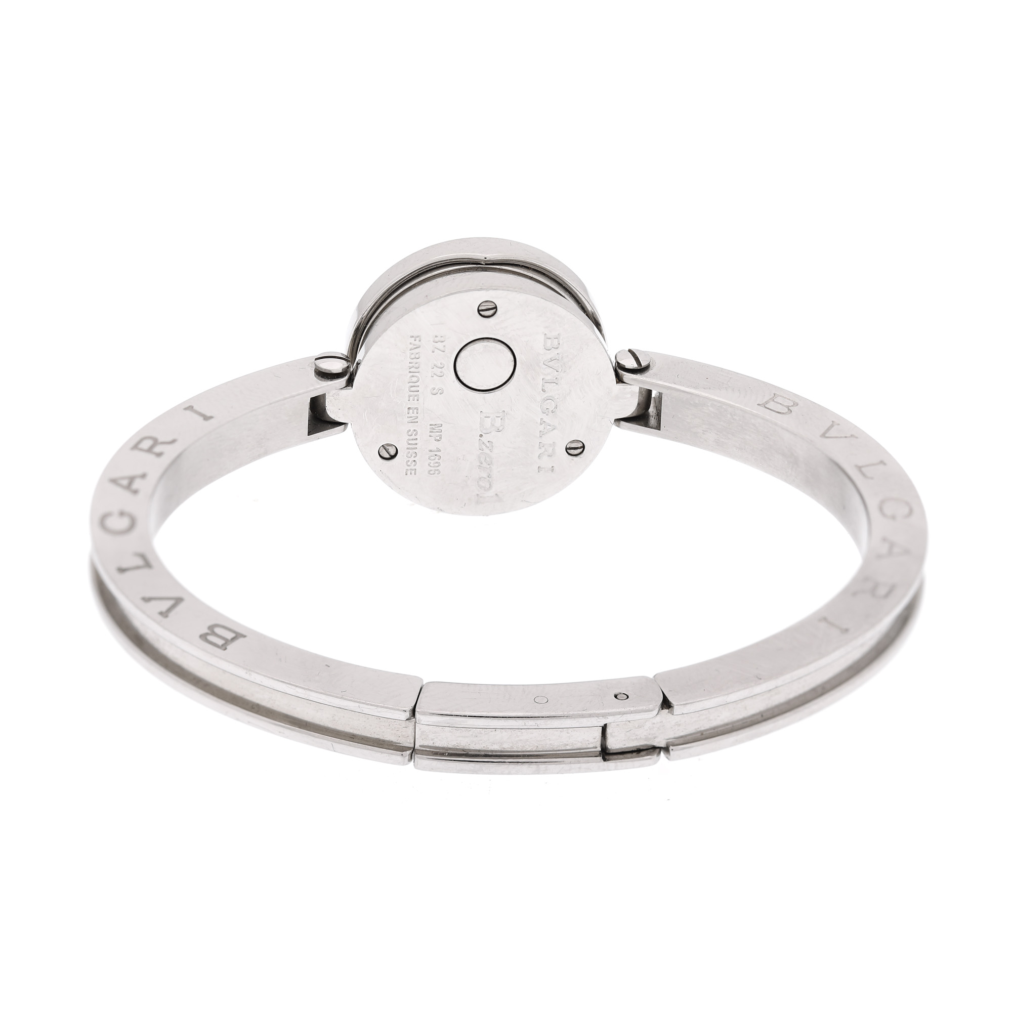Ceas Bvlgari B.zero, cu diamante, de mână, de damă, referință BZ22S. Mecanism quartz, calibrul B037. Cadran de culoare alb, indici triunghiulari. Brățară originală, din oțel inoxidabil, cu sistem de închidere cu clemă.